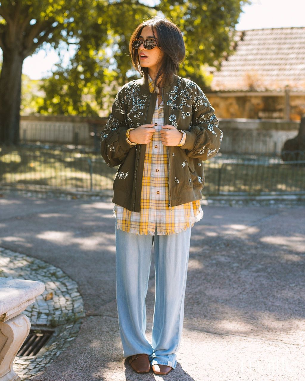 Ajuste solto com corte recto e efeito "desfiado" na terminação. Gola clássica com botões à frente.