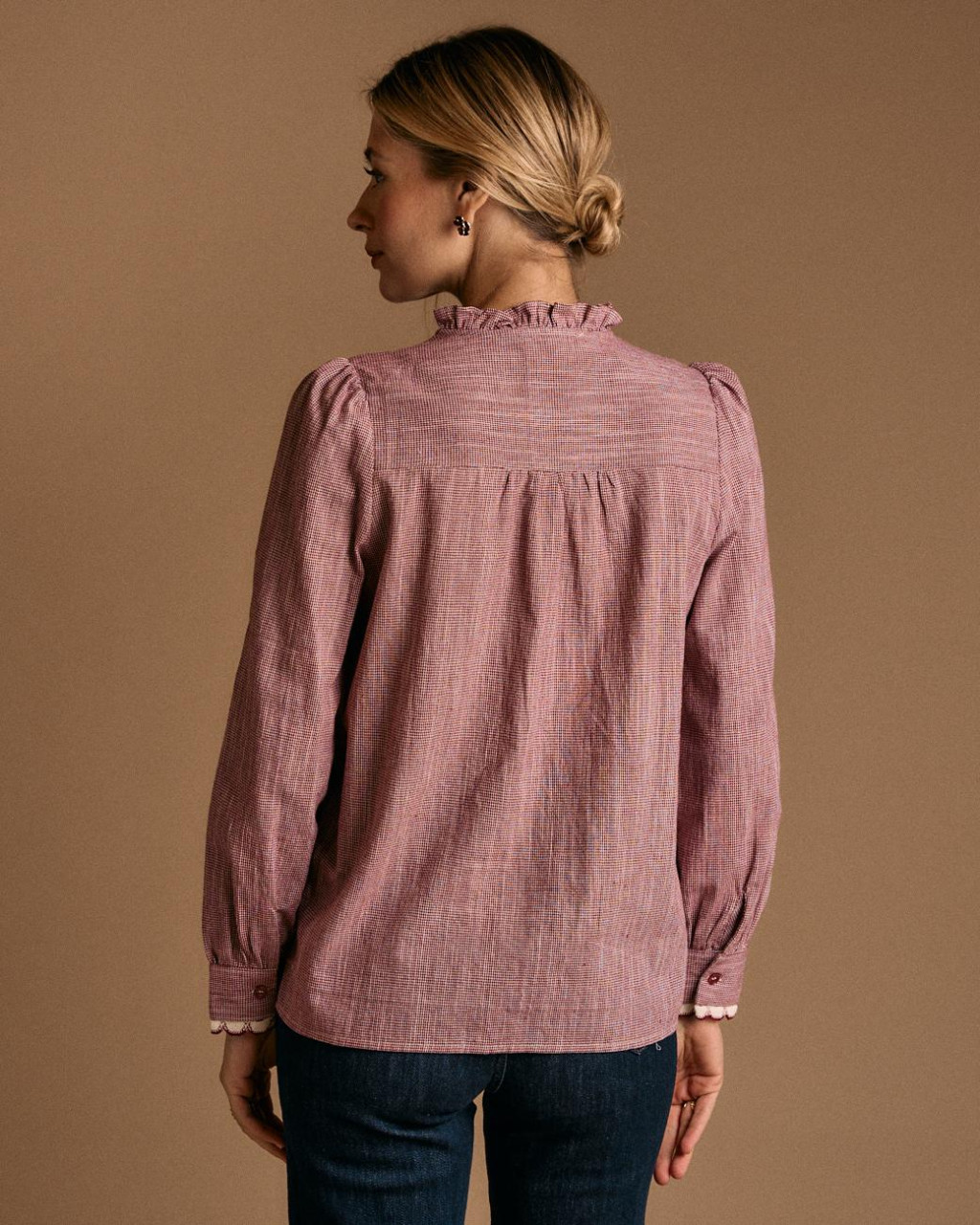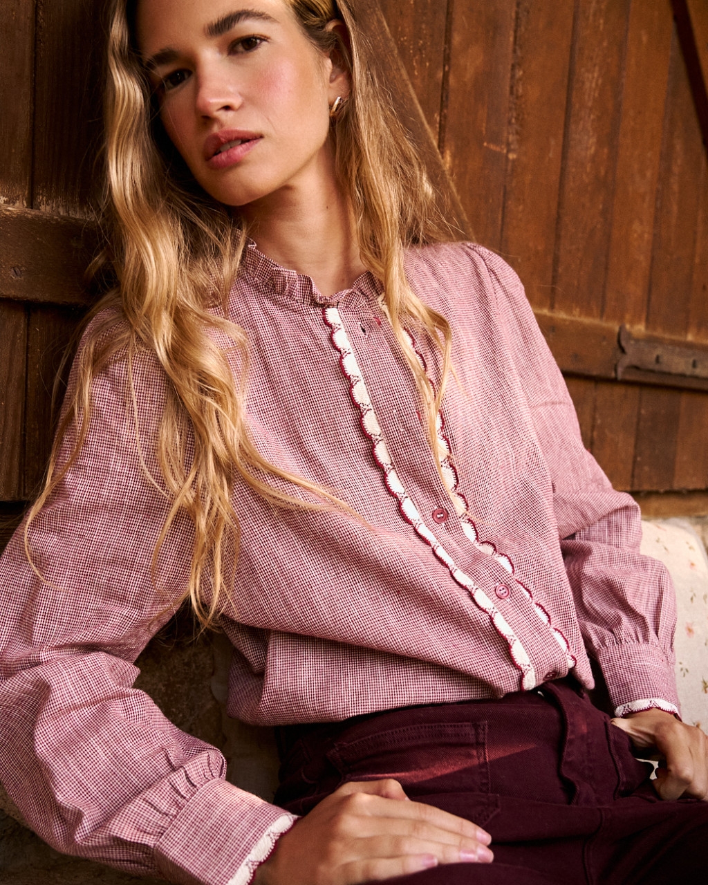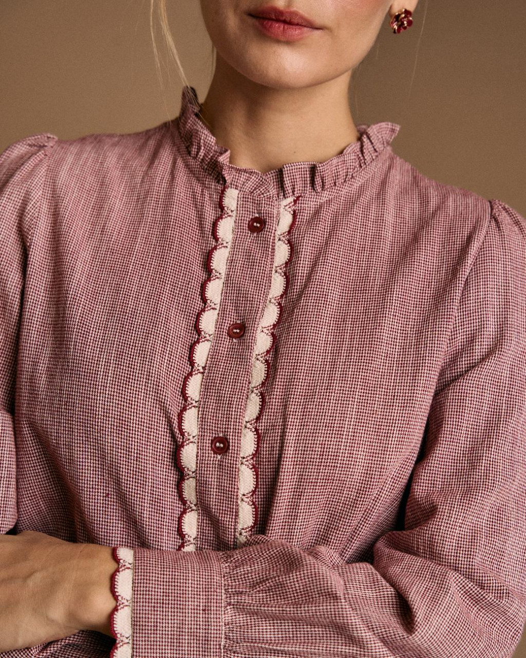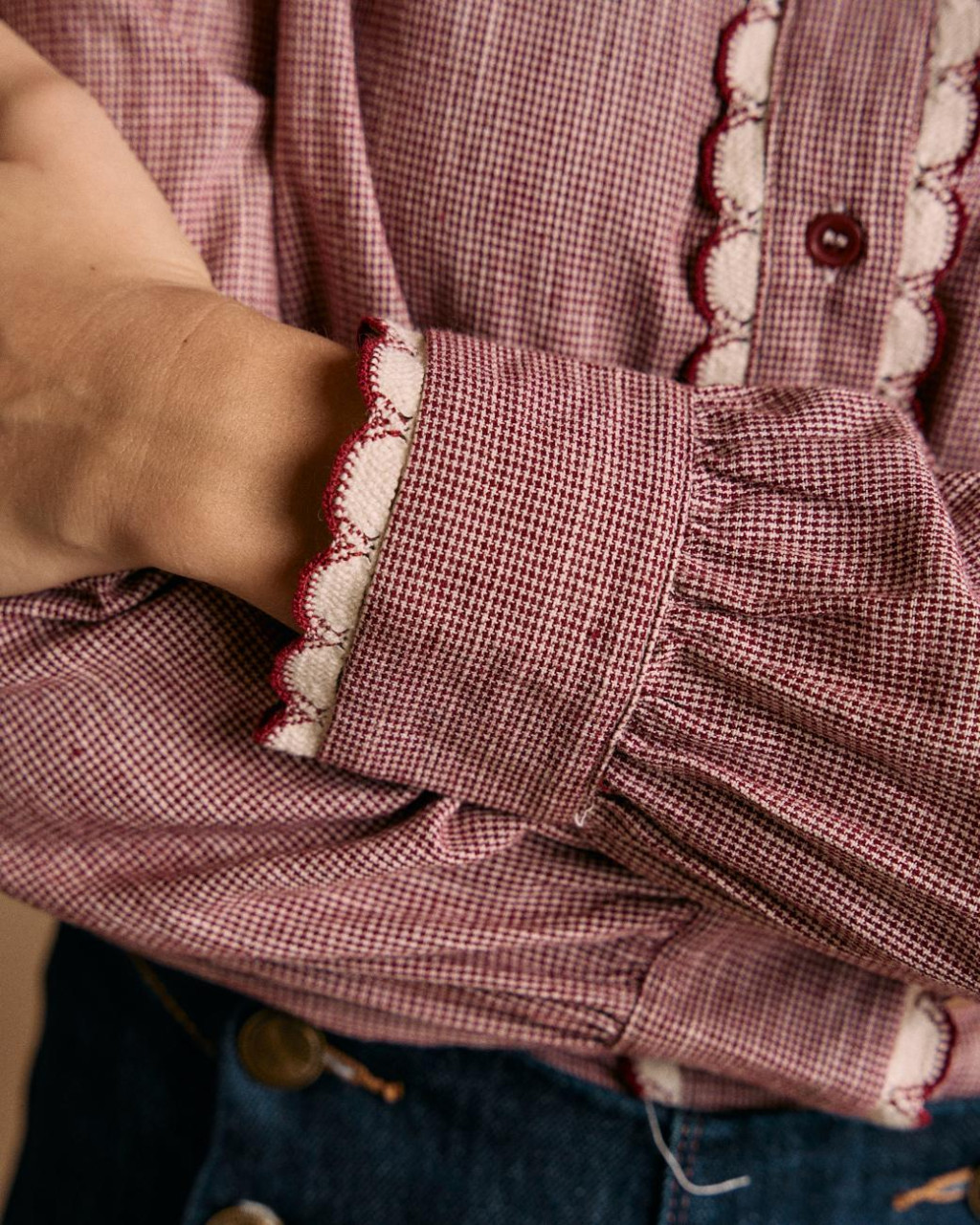 Camisa com padrão micro-xadrez em tons de crú e bordeaux de inspiração romântica.