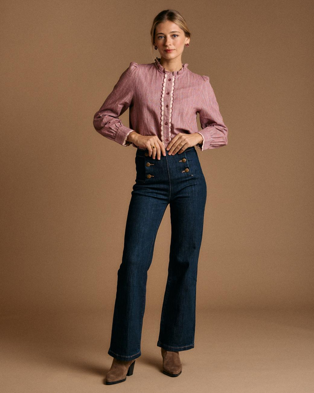 Corte recto com ajuste regular. Mangas compridas com encaixe "princesa" e punho com botão e renda na terminação.
