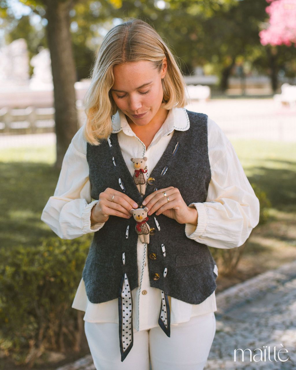 Botões à frente com bordados. Pregadeiras de Ursinho artesanal.