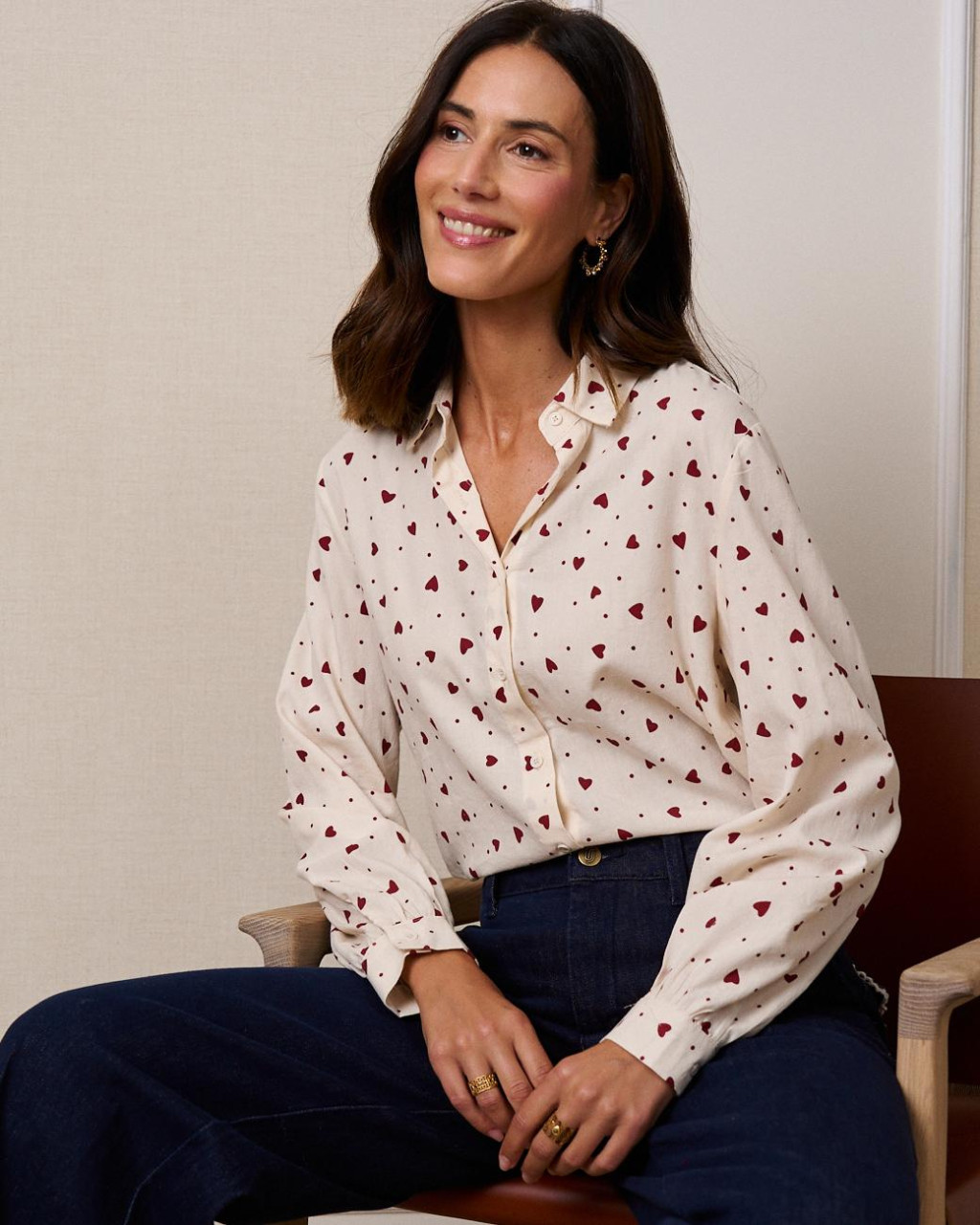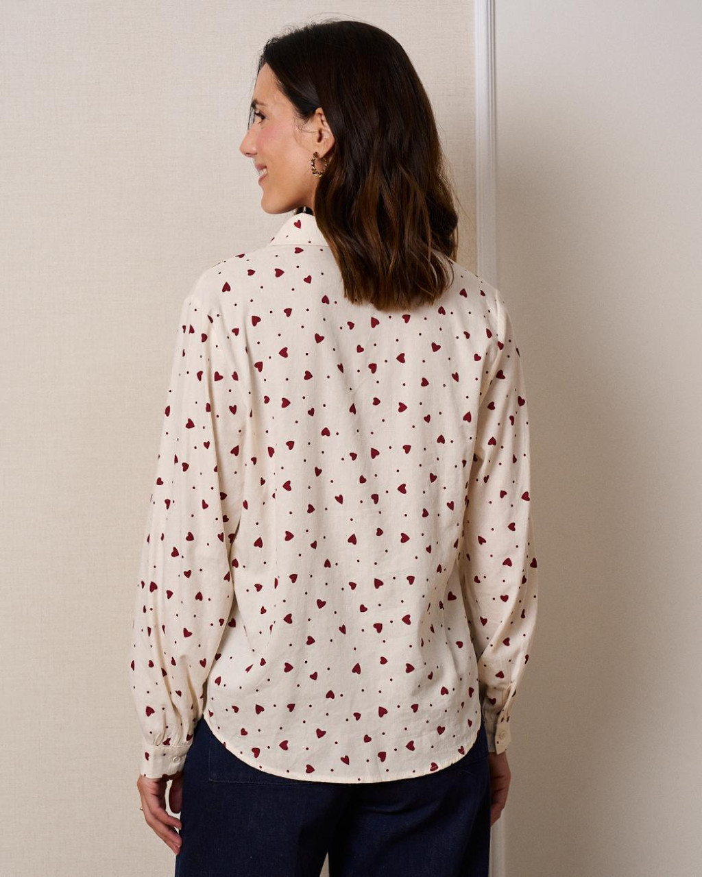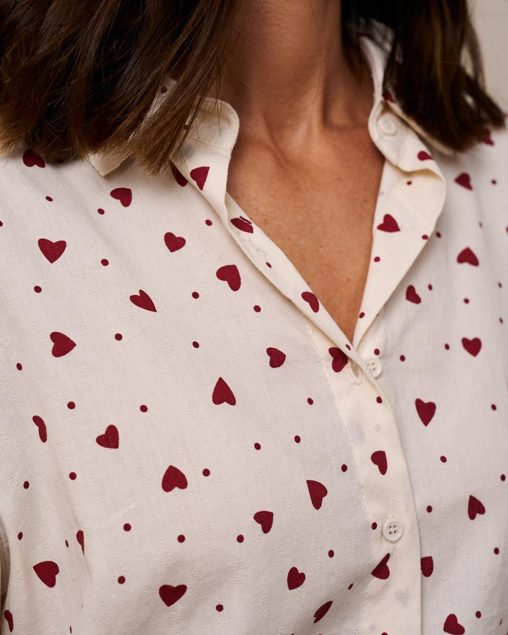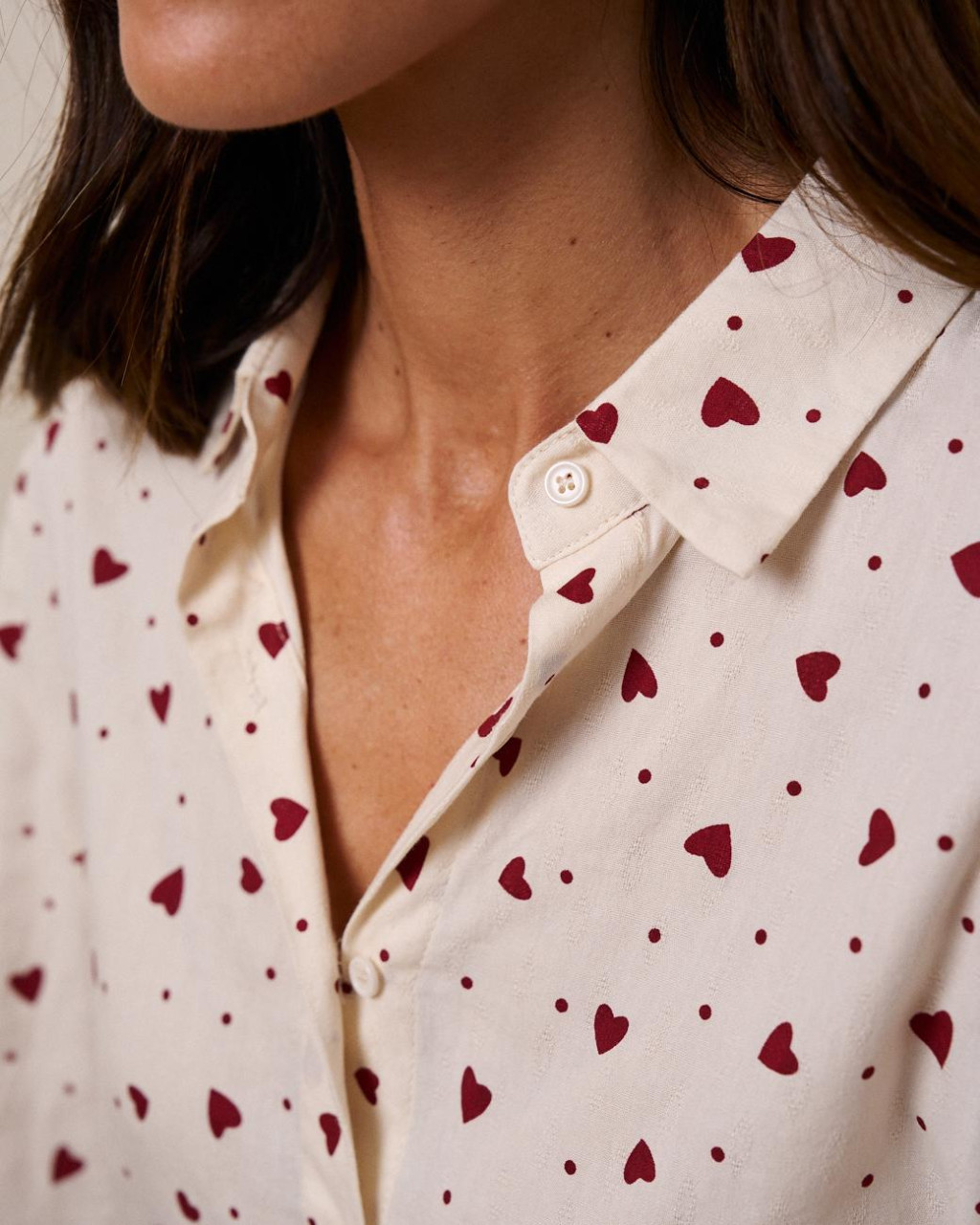 Camisa de algodão com padrão de corações bordeaux e pequenas bolinhas em destaque.