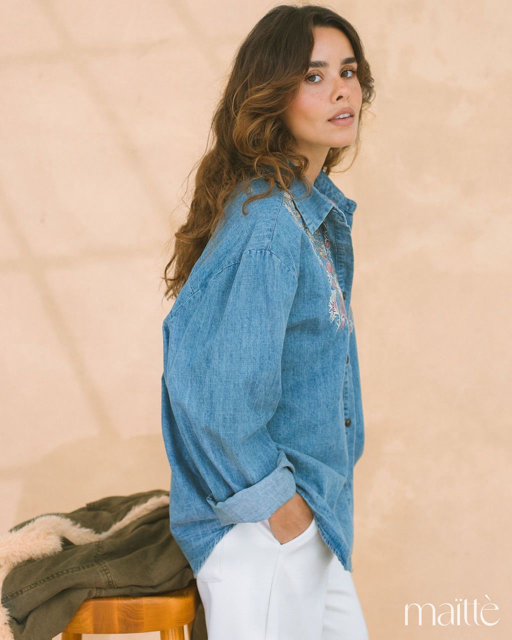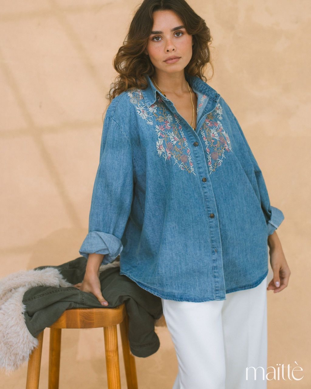 Modelo com gola clássica com bordados florais delicados na zona do peito.