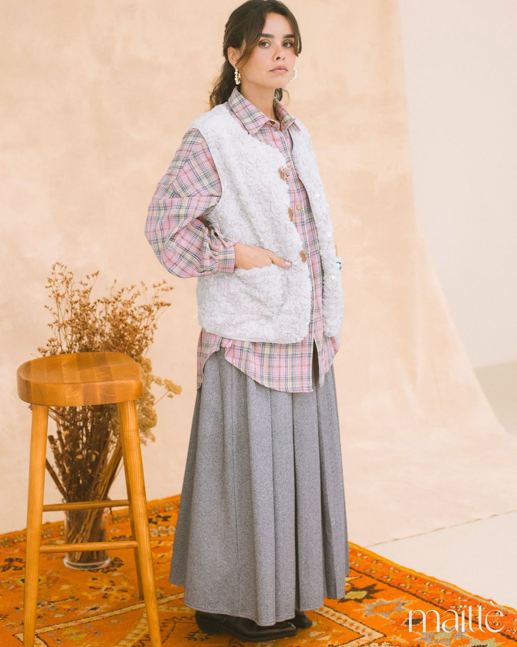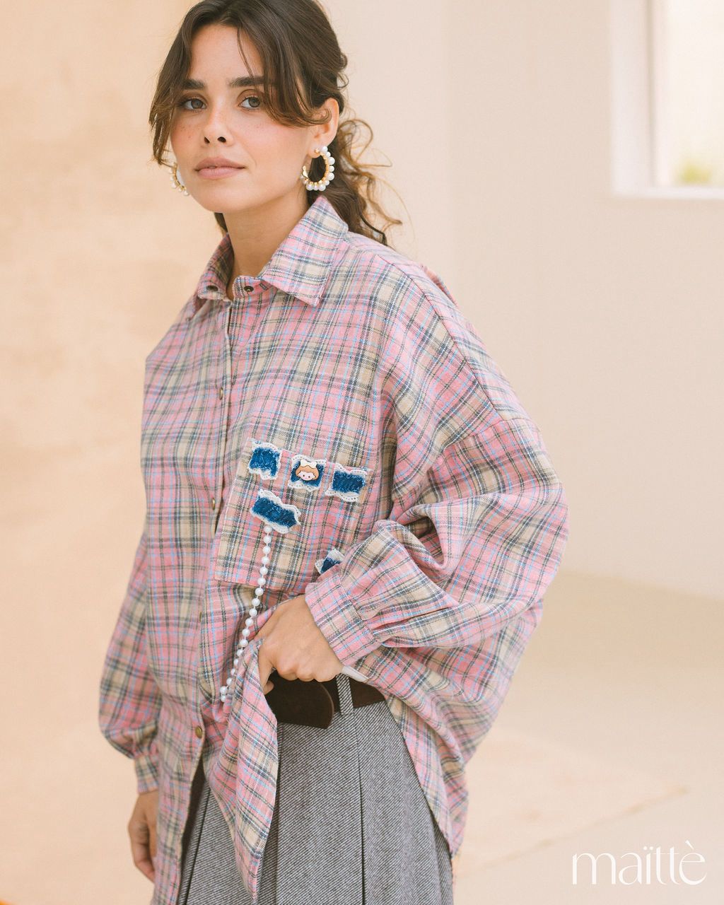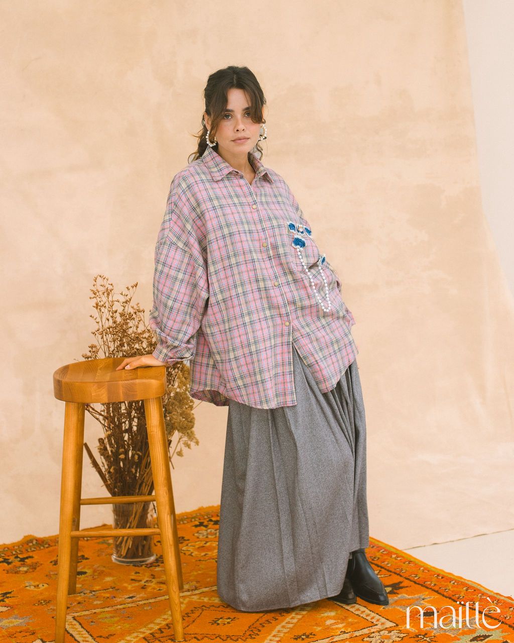 Camisa de xadrez em tons de rosa, creme, azul e cinzento num tecido quentinho estilo flanela.