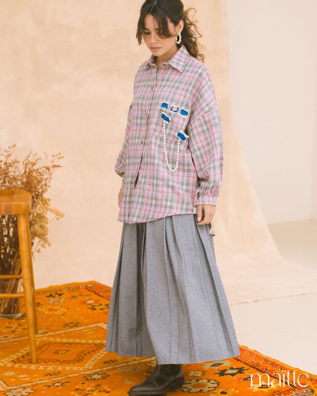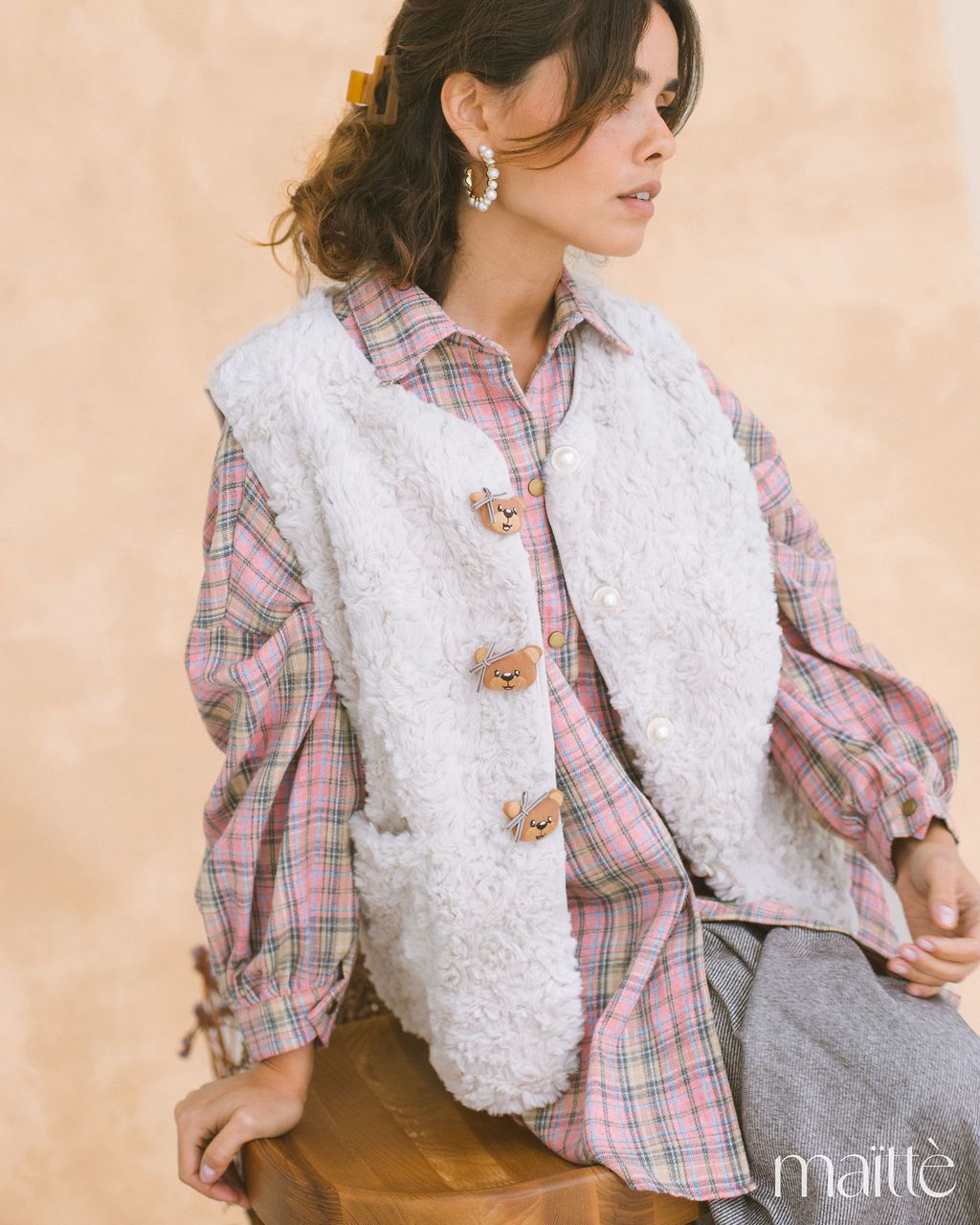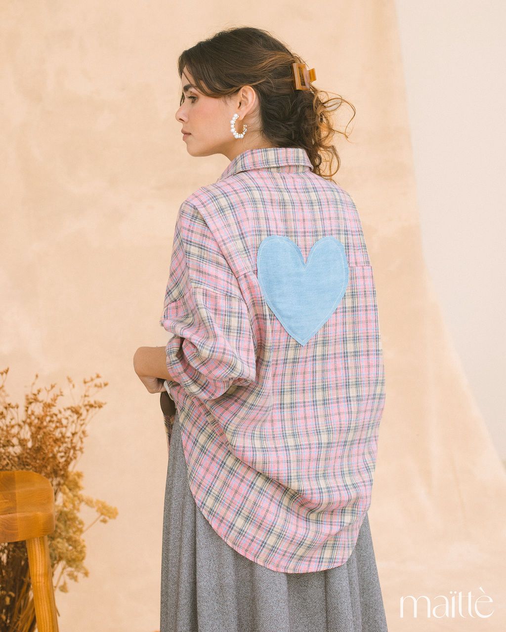 Camisa de xadrez em tons de rosa, creme, azul e cinzento num tecido quentinho estilo flanela.