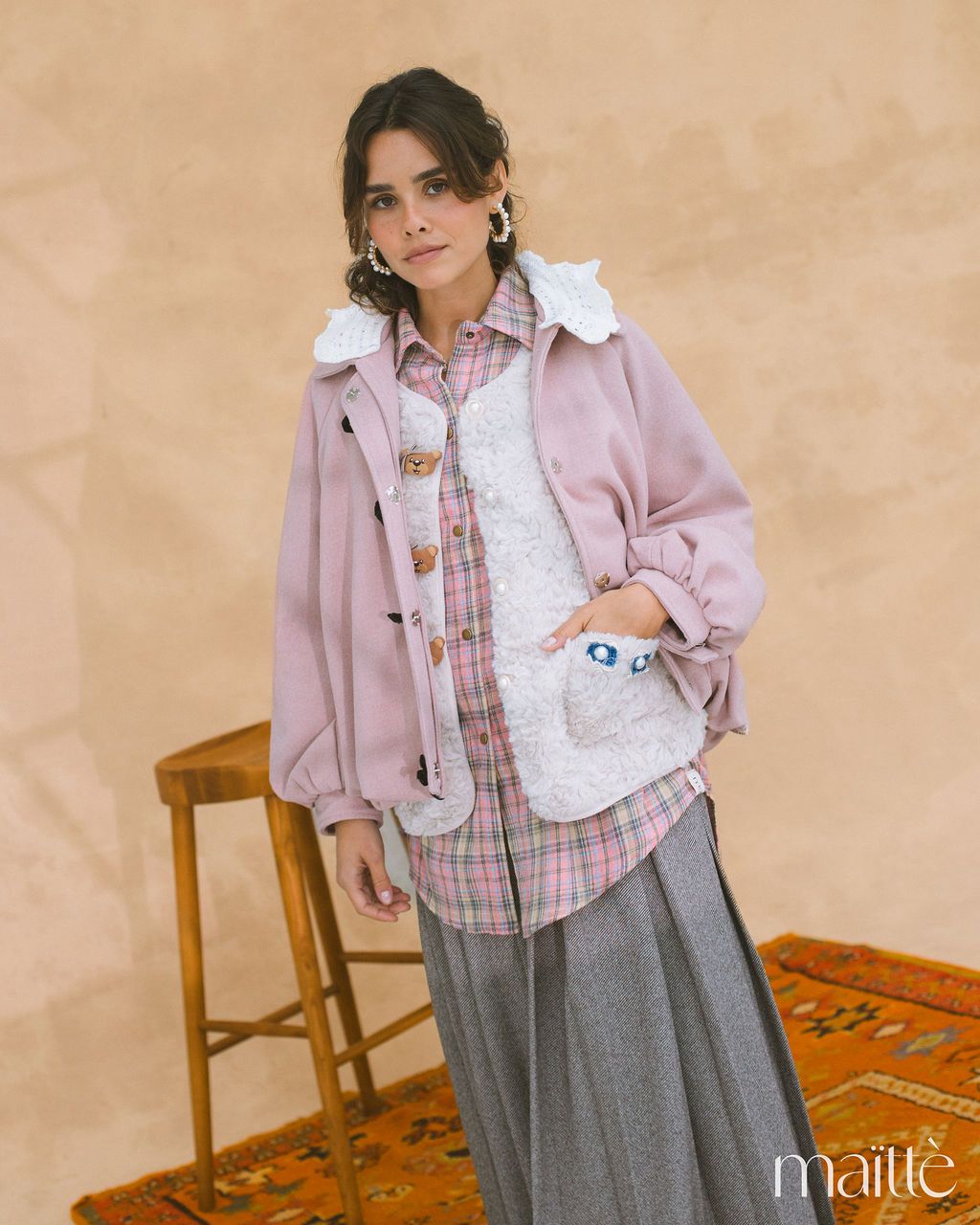 Modelo com bolso funcional no peito com ornamentação artesanal e pregadeira amovível.