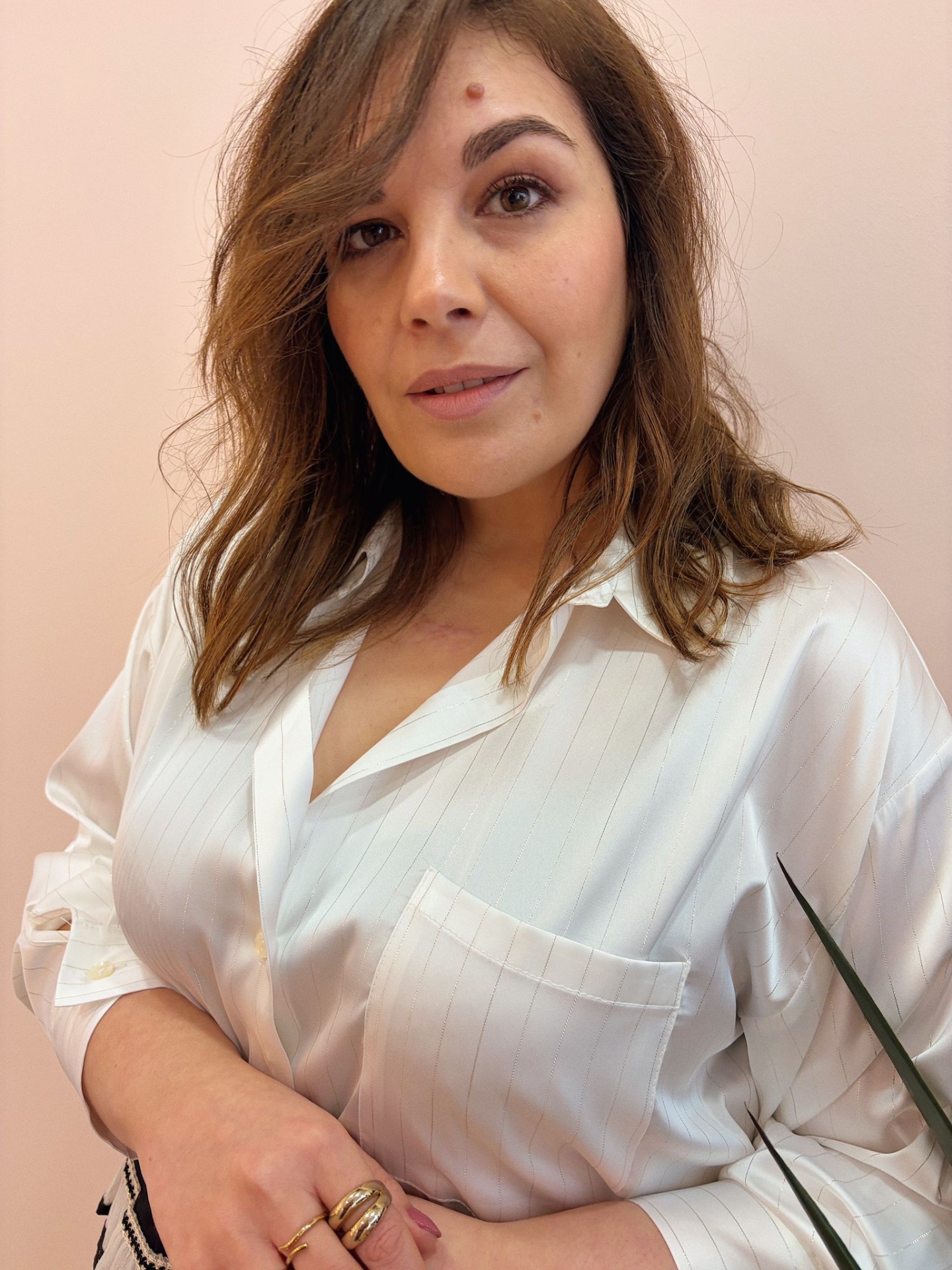 Modelo com gola clássica, ajuste solto e botões à frente.