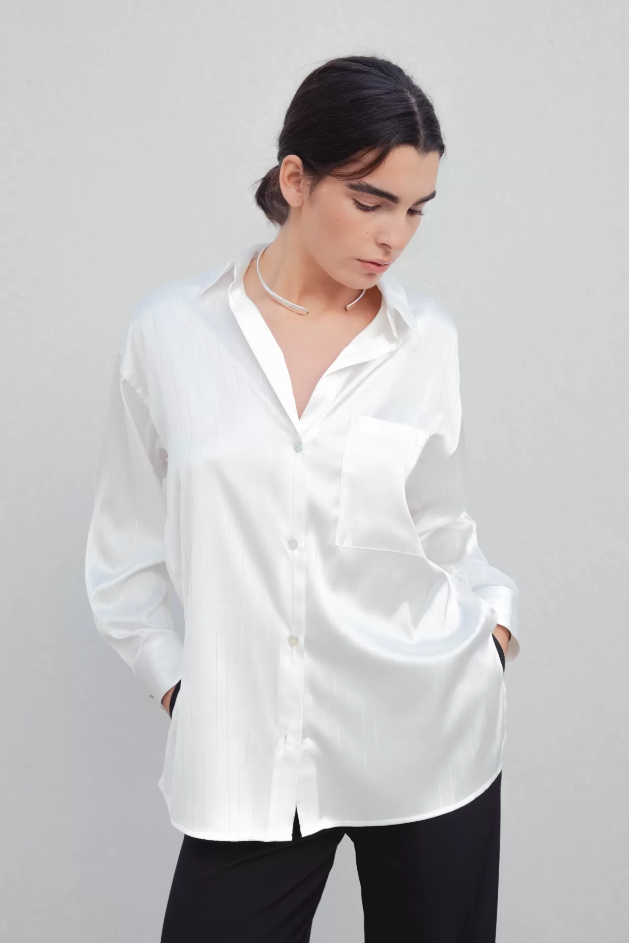 Camisa acetinada com riscas prateadas na vertical.