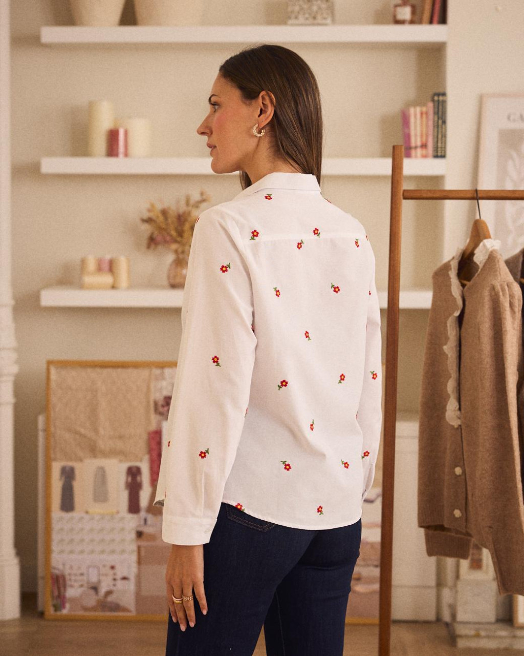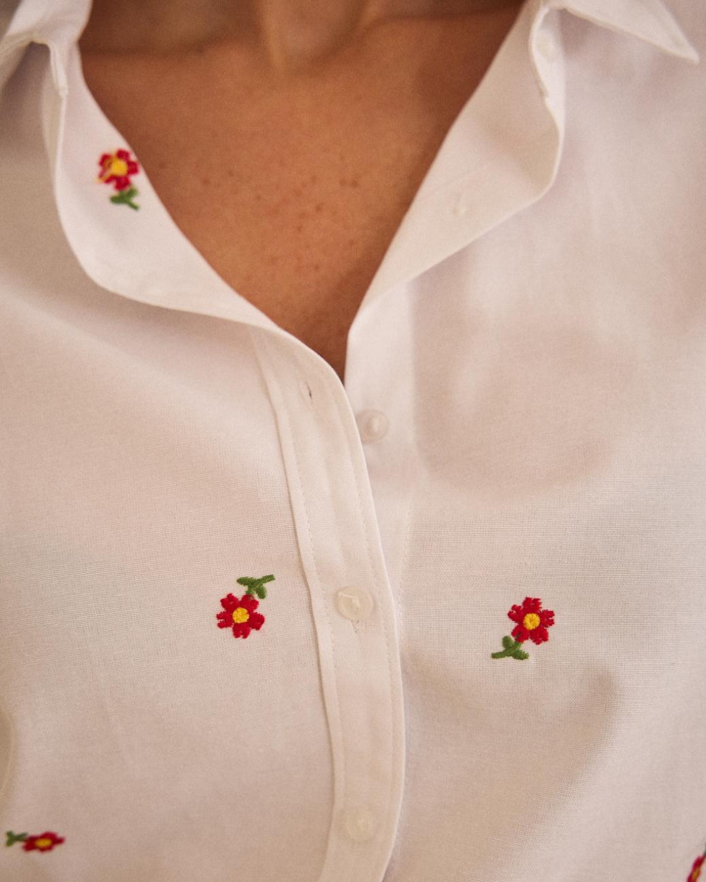 Camisa branca com pequenas flores bordadas em tons de vermelho, amarelo e verde.
