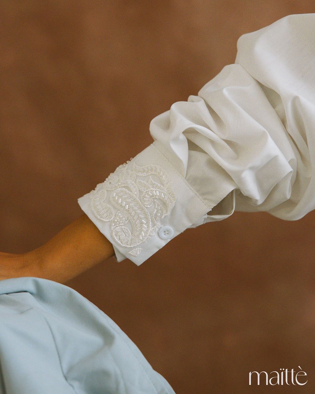 Mangas compridas com botão no punho e aplicações.