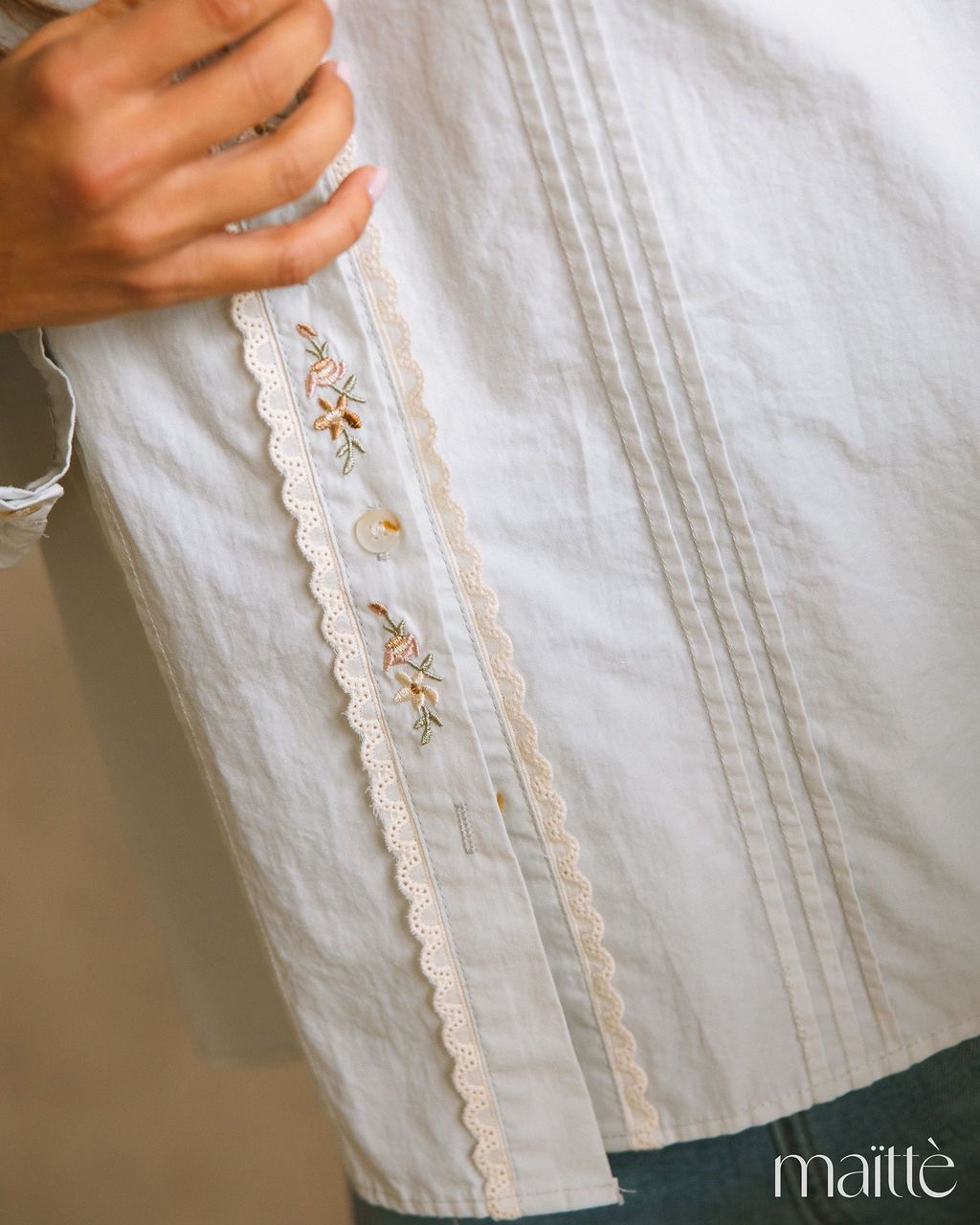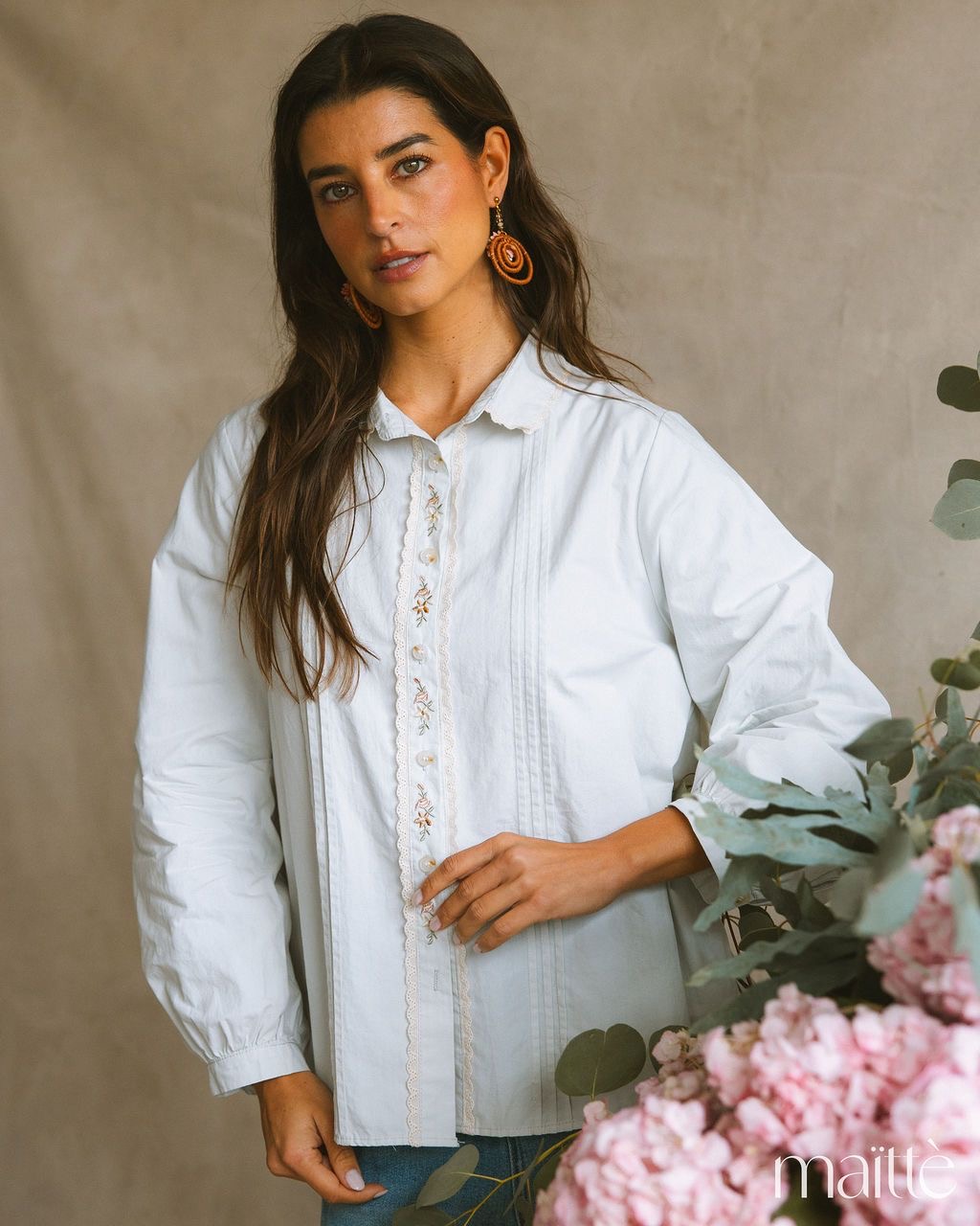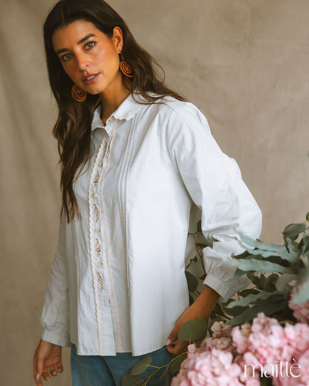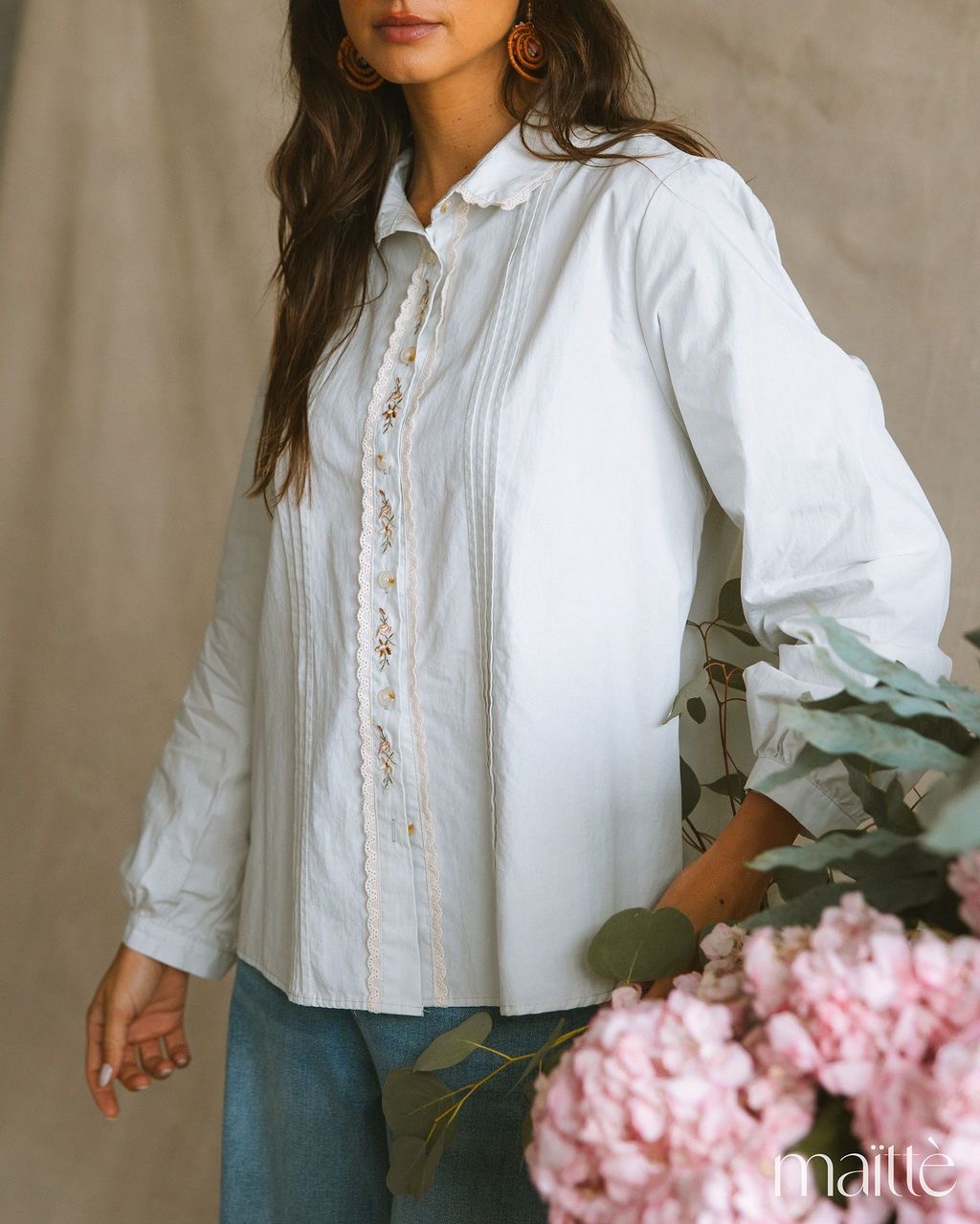 Modelo de gola clássica com ornamentação de bordado em crú.