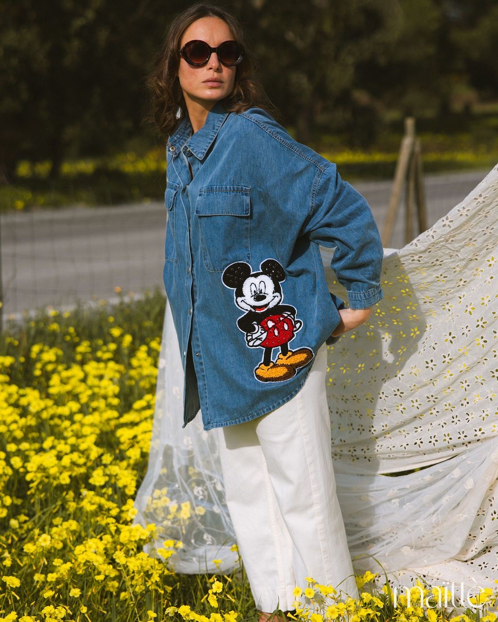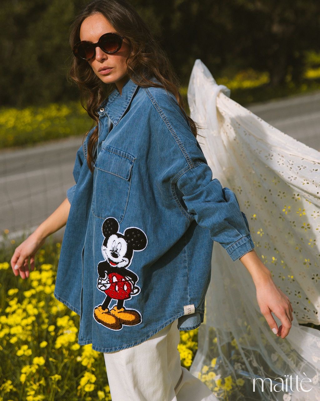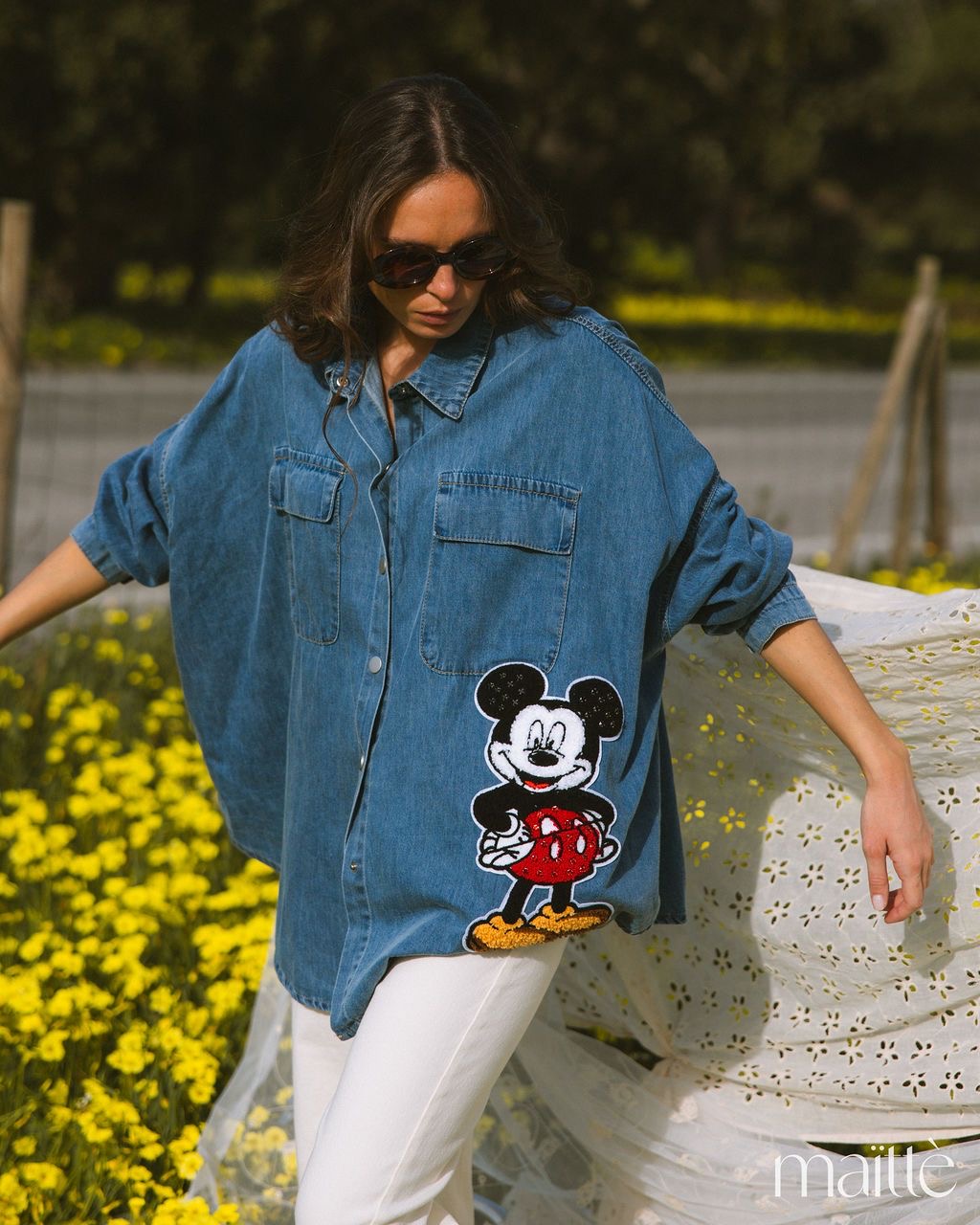 Camisa de ganga simples com bordado lateral (Mickey).