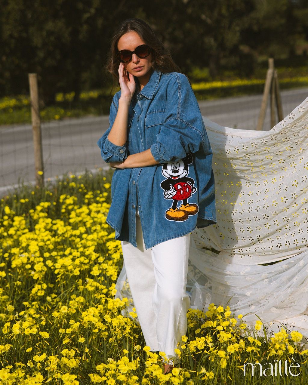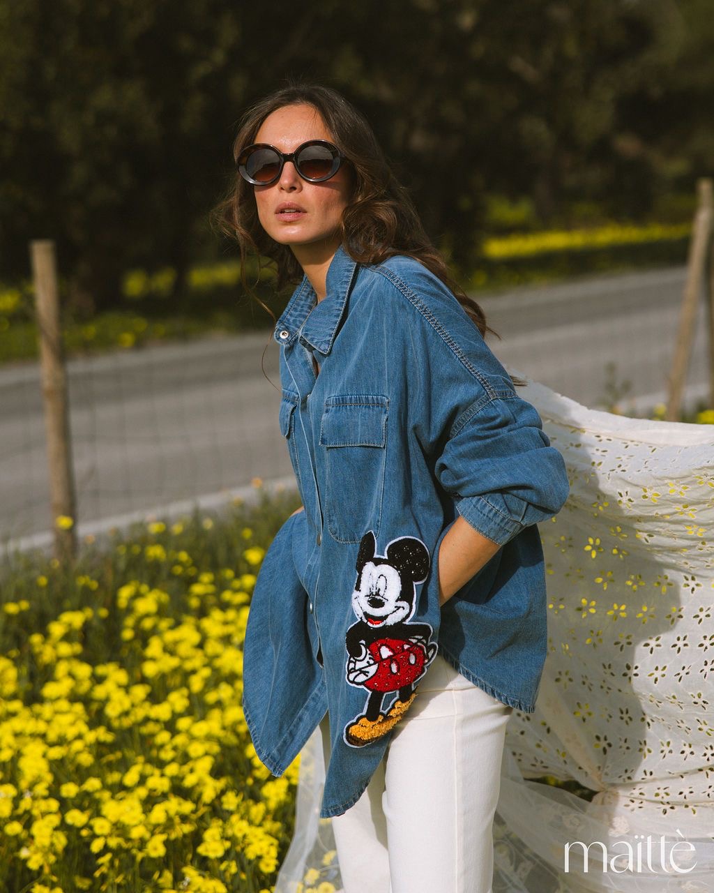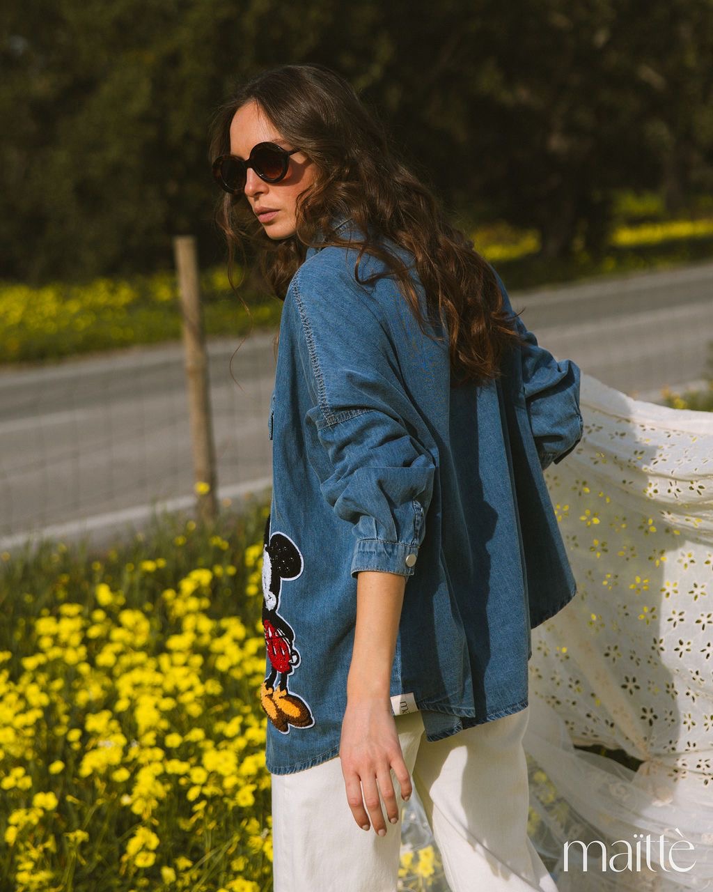 Camisa de ganga simples com bordado lateral (Mickey).