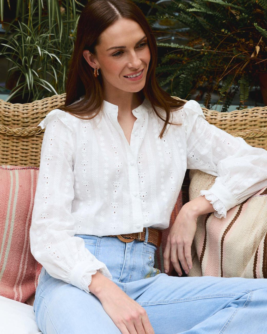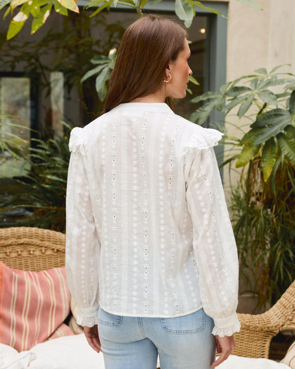 Camisa branca bordada (estilo bordado inglês) com motivos florais.