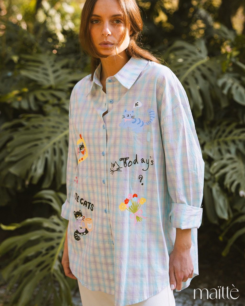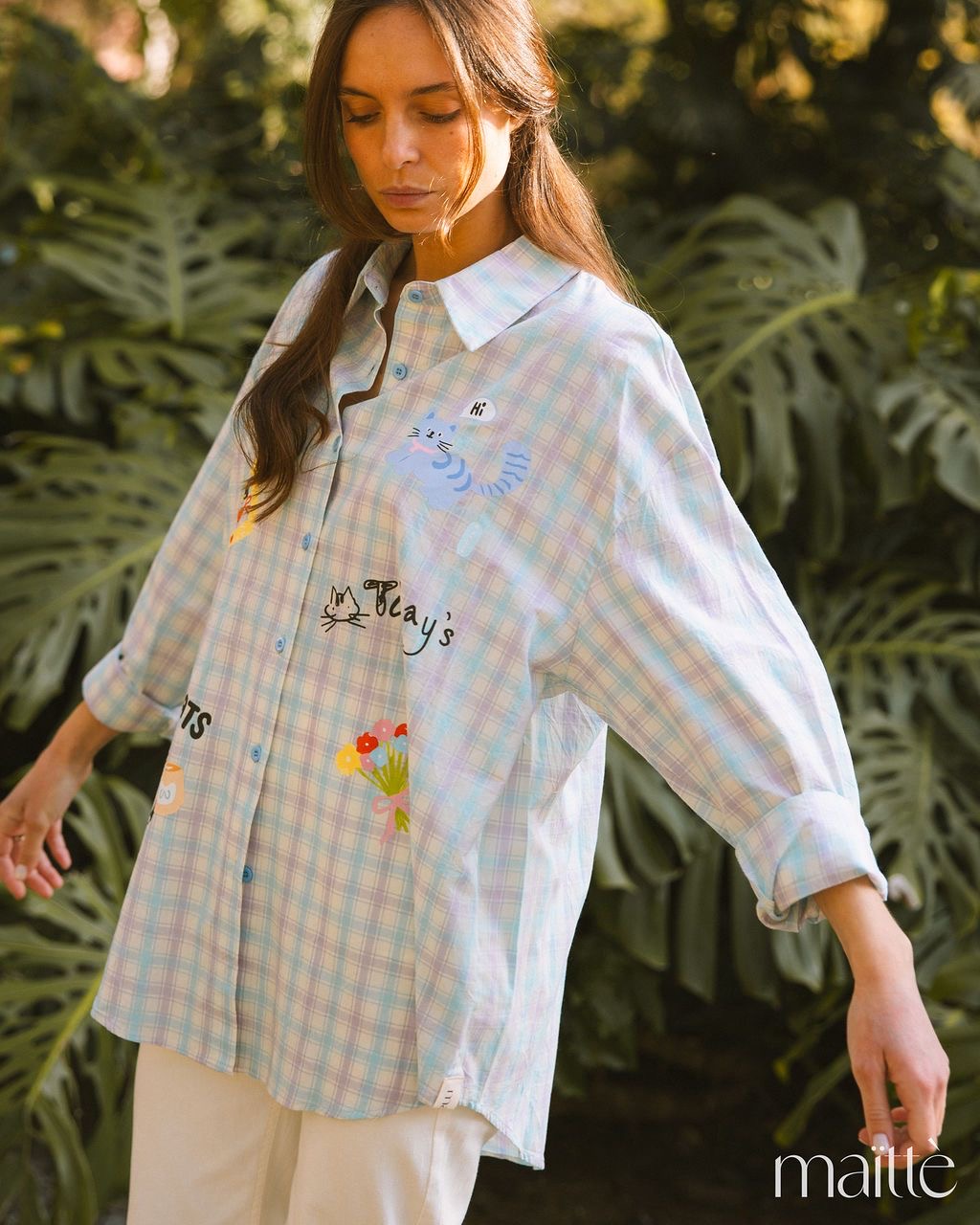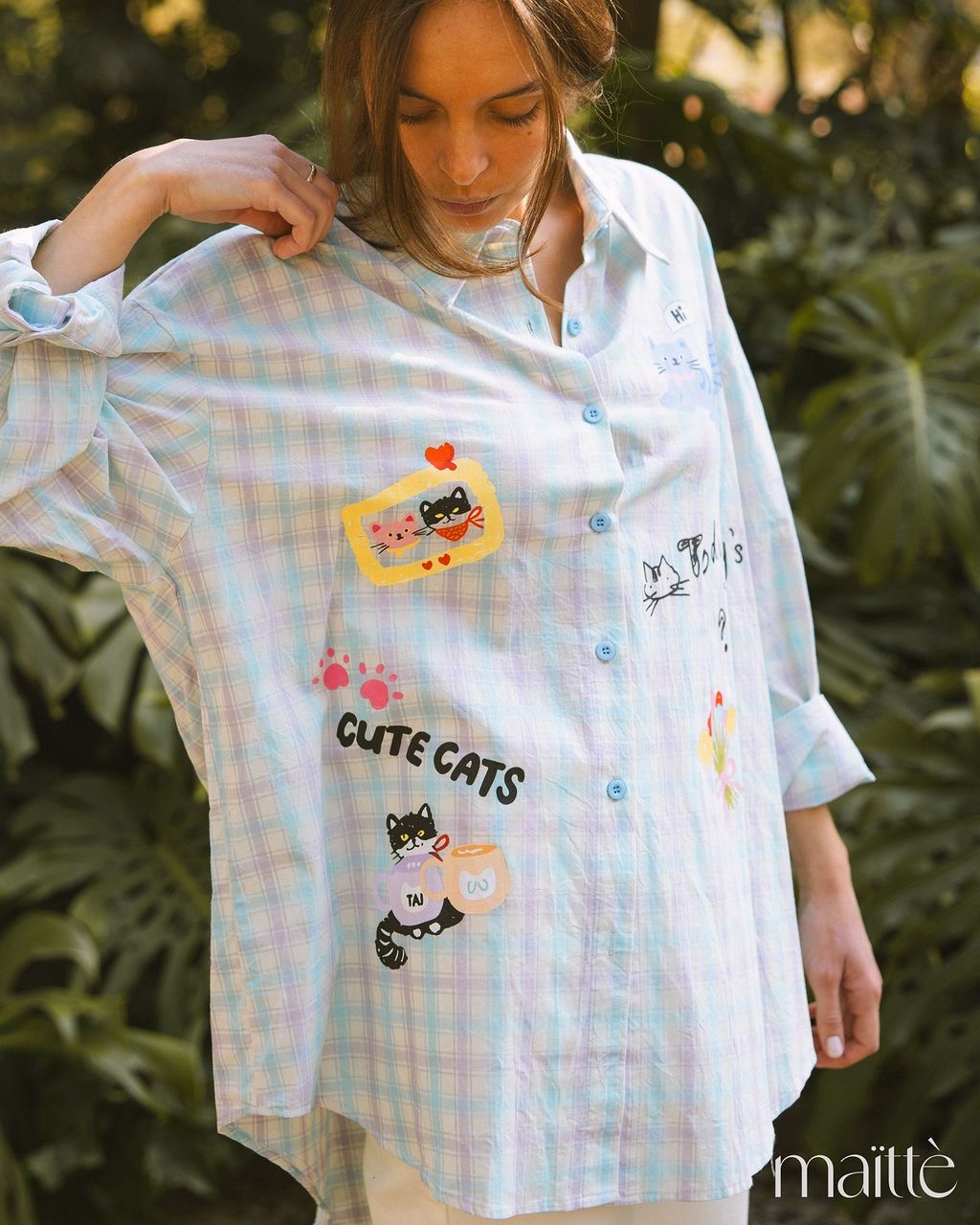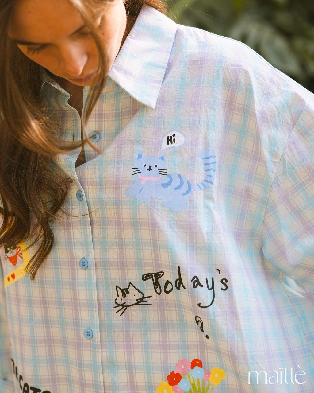 Camisa oversize em padrão vichy (azul/lilás) com gatinhos e flores coloridas.
