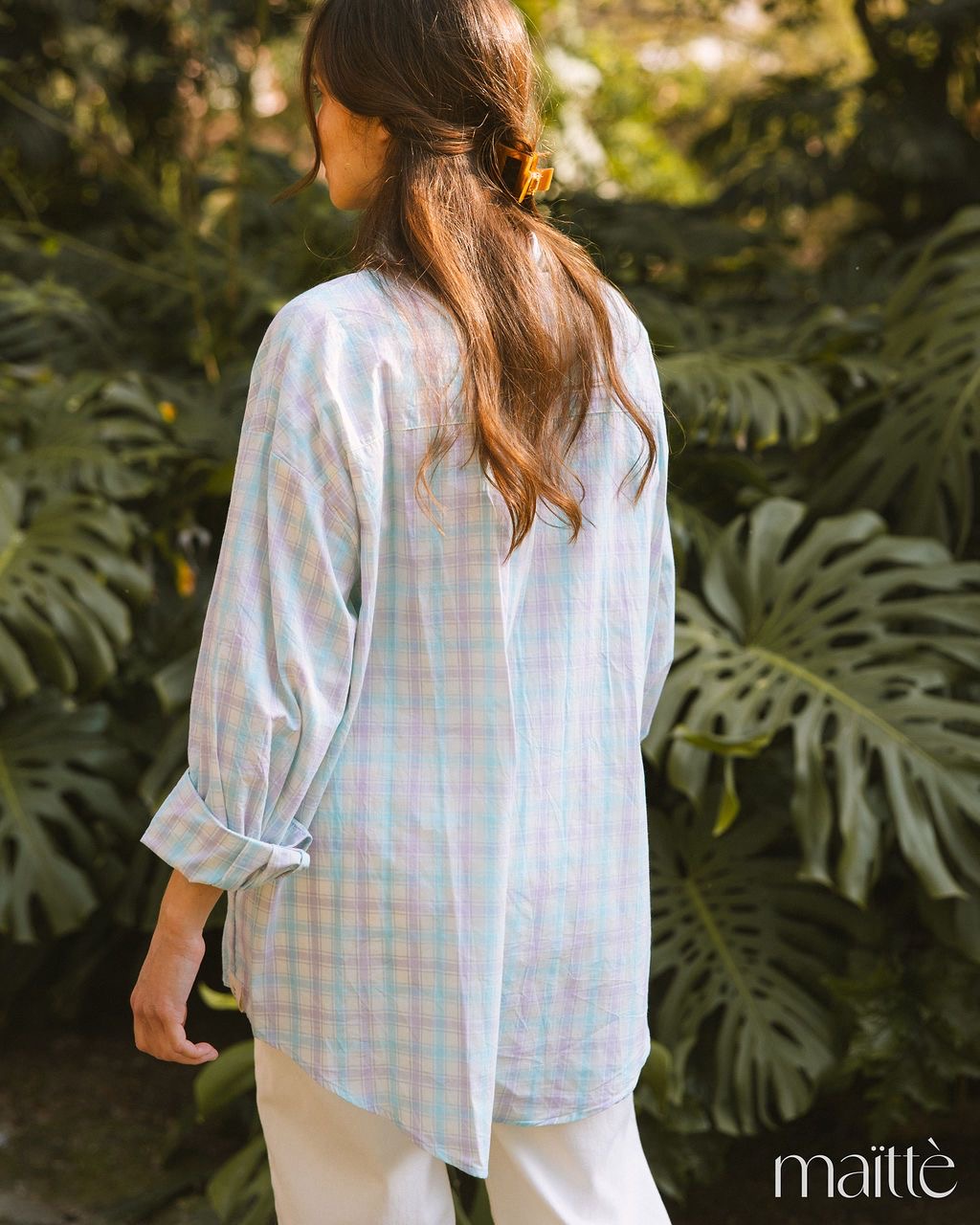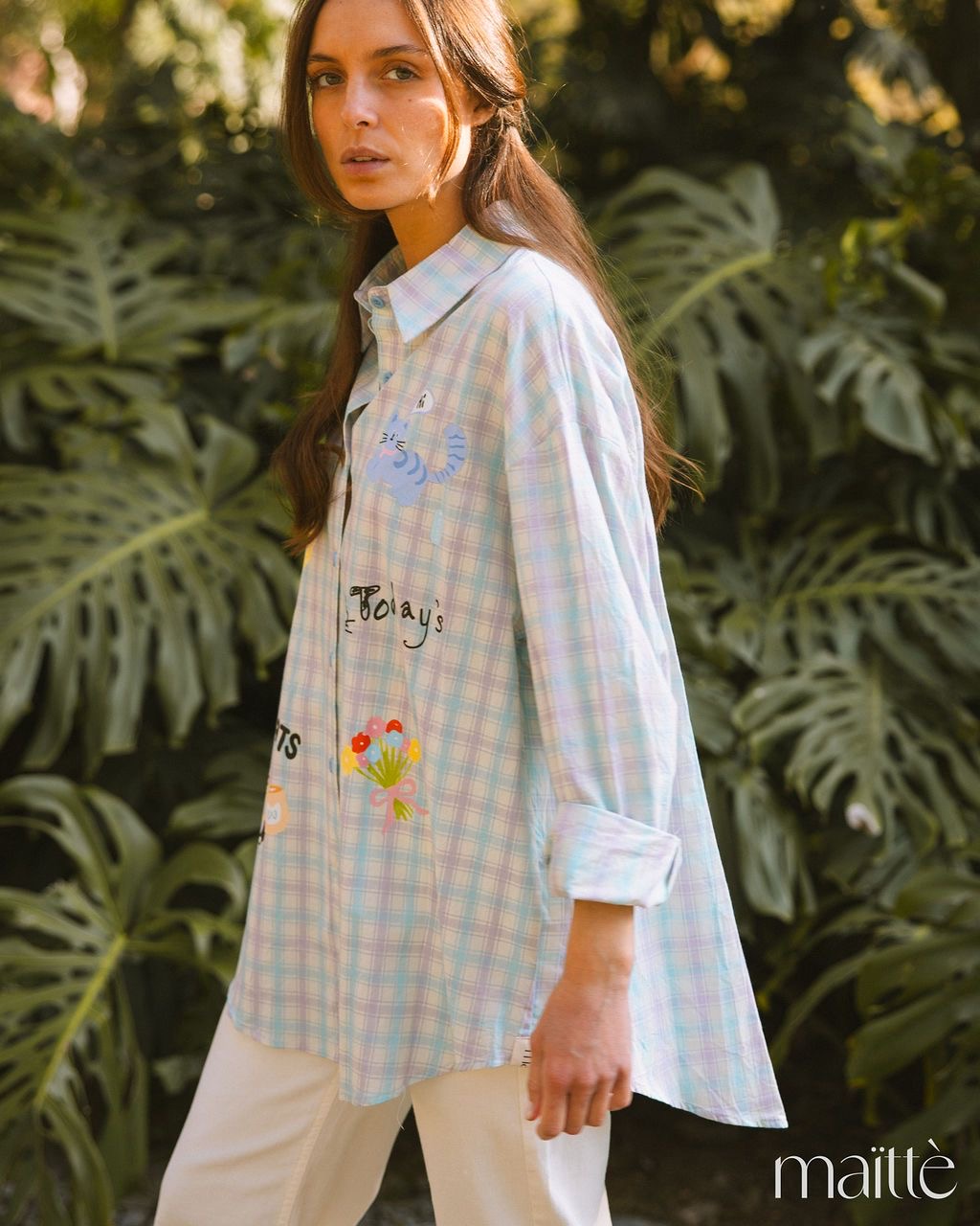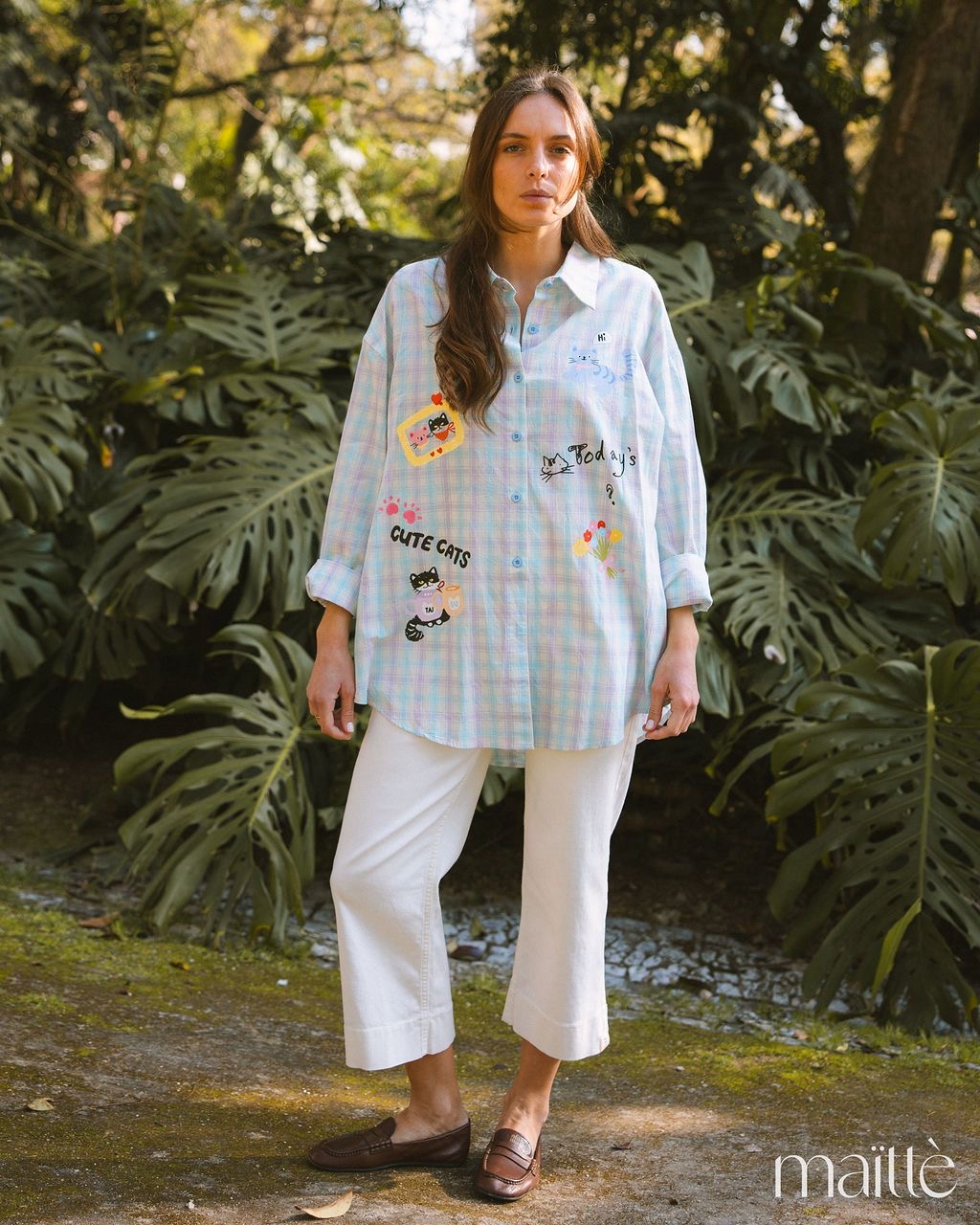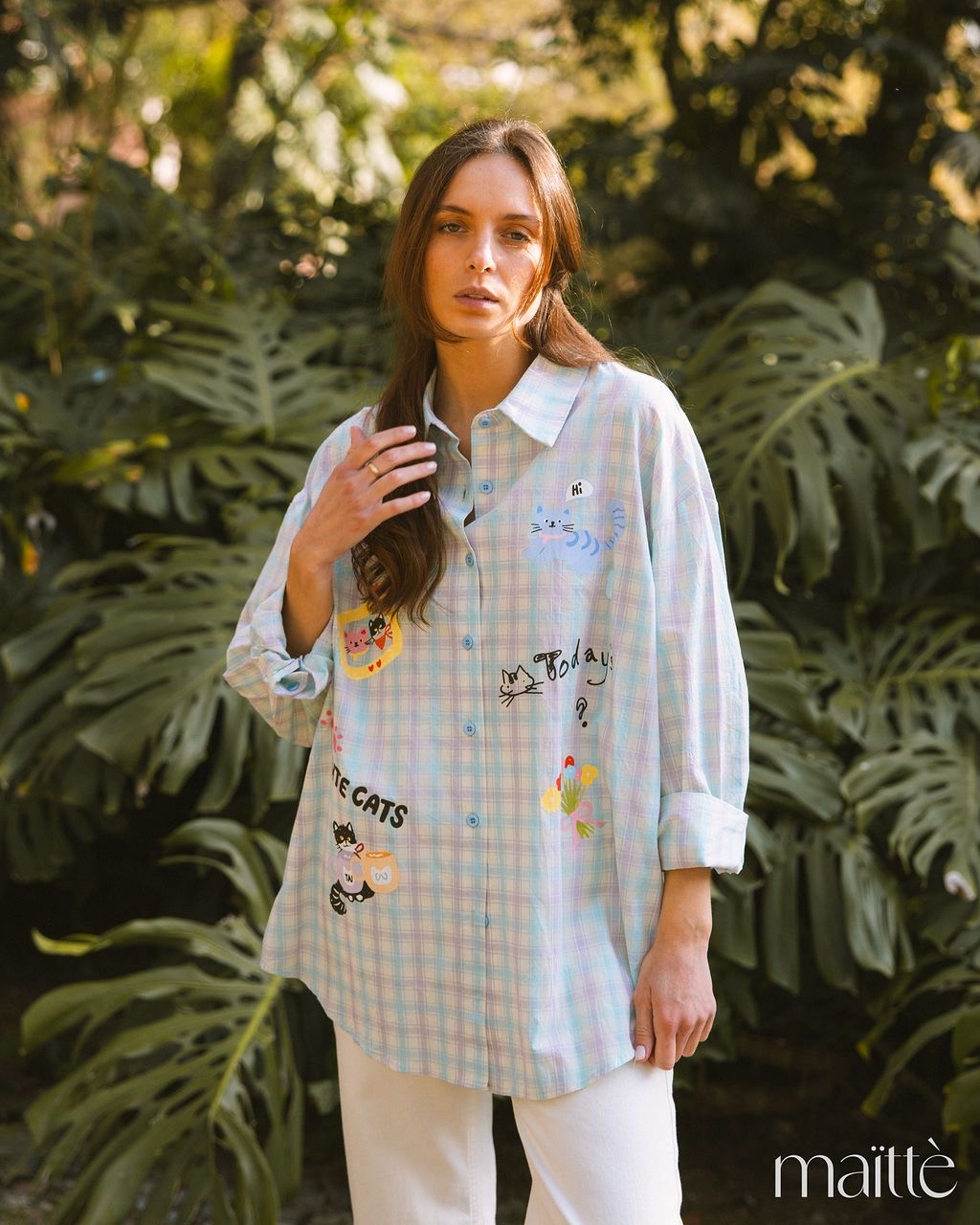 Camisa oversize em padrão vichy (azul/lilás) com gatinhos e flores coloridas.