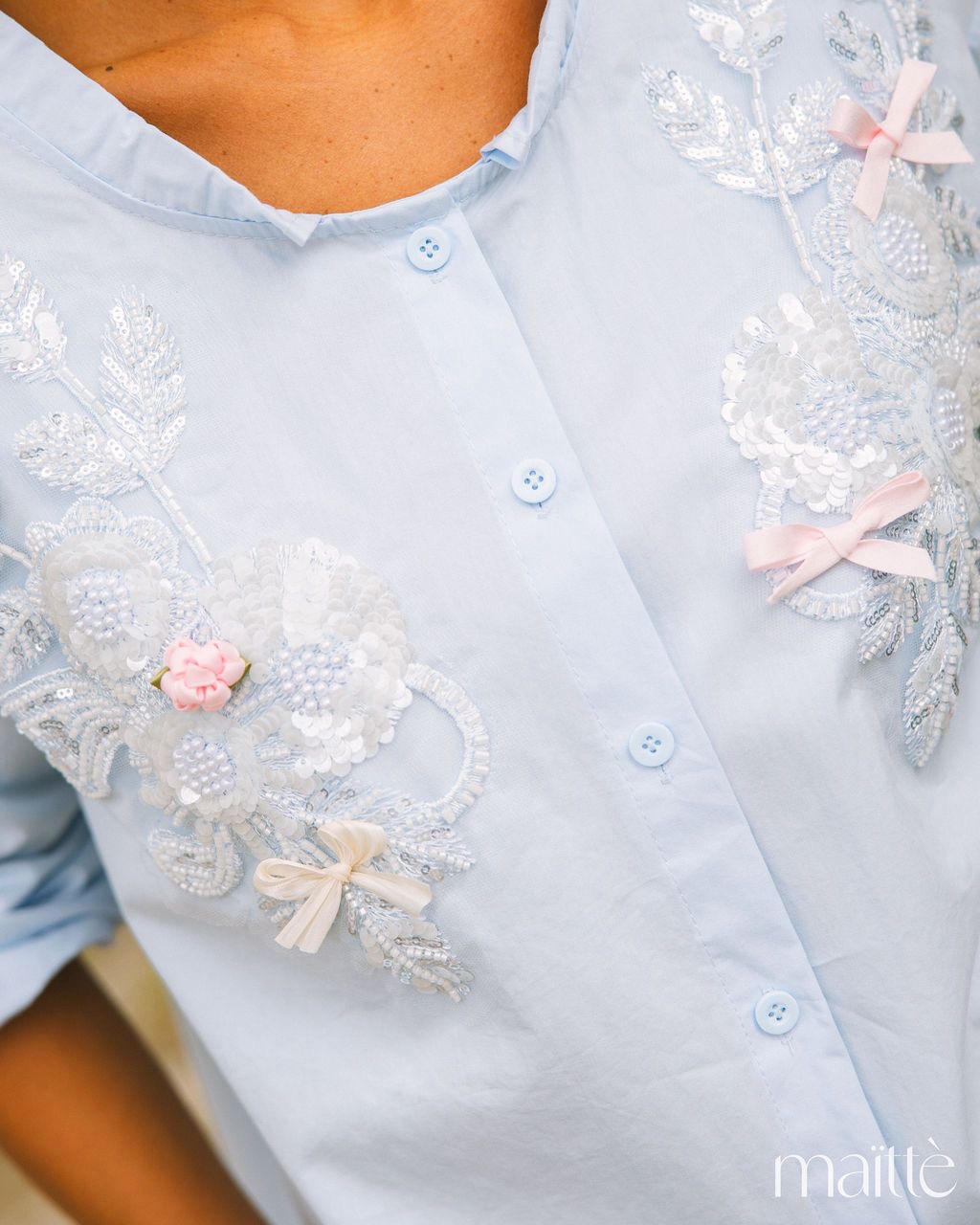Modelo com botões à frente. Aplicações na zona do peito com missangas, rendas e lantejoulas em formato floral.