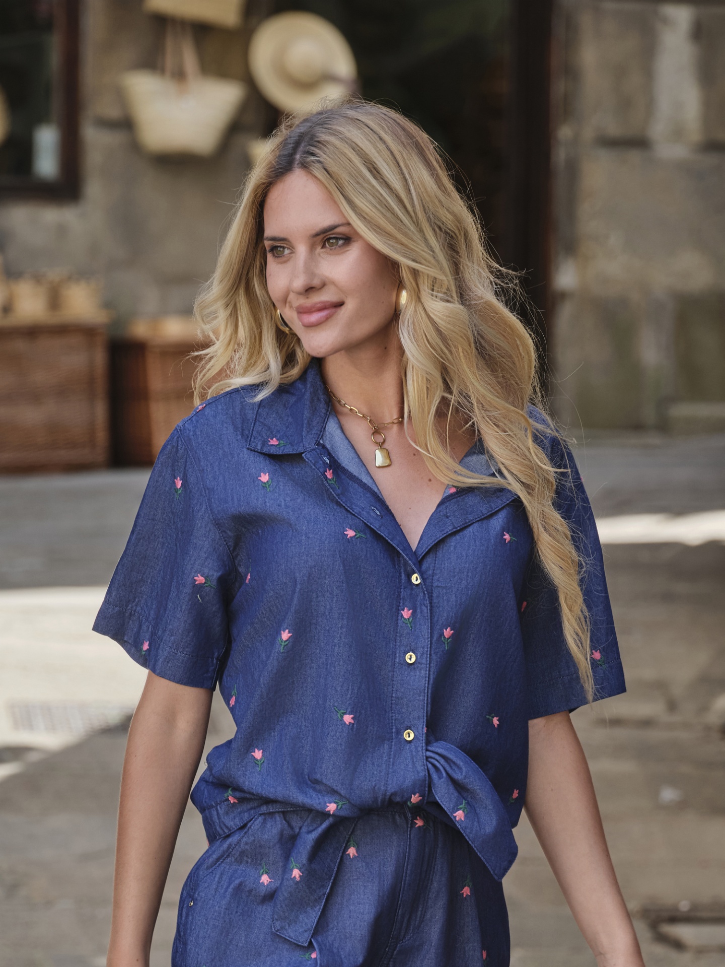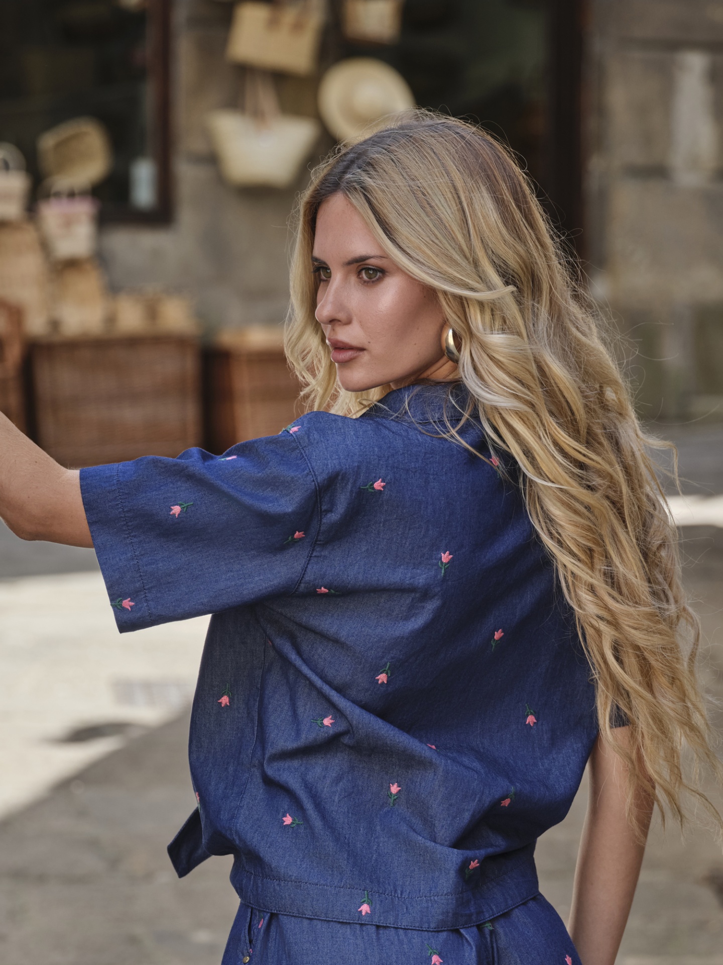 Camisa de ganga fina em lavagem escura com bordados florais.