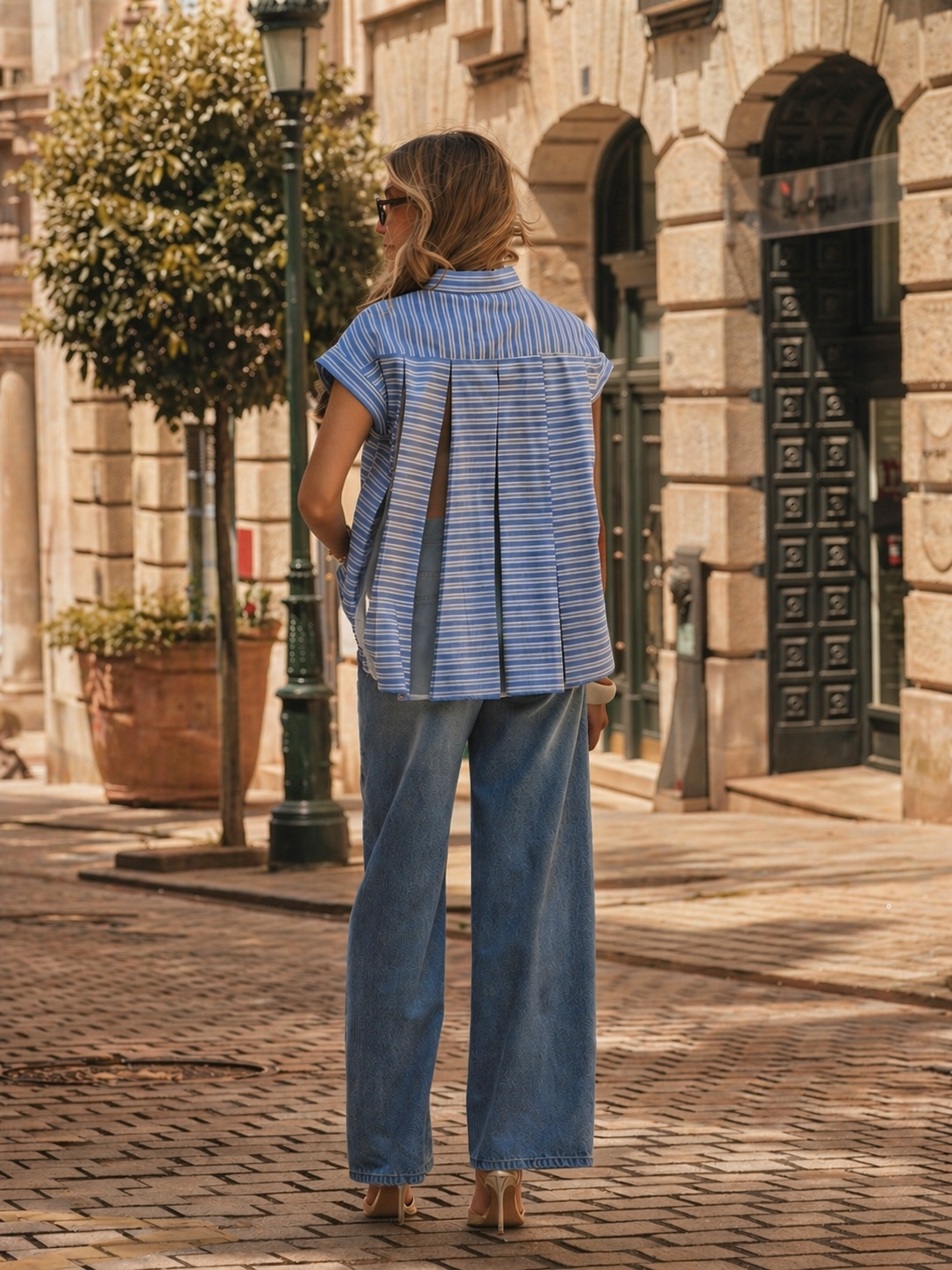 Camisa oversize em algodão com padrão de riscas em tons de azul/branco.