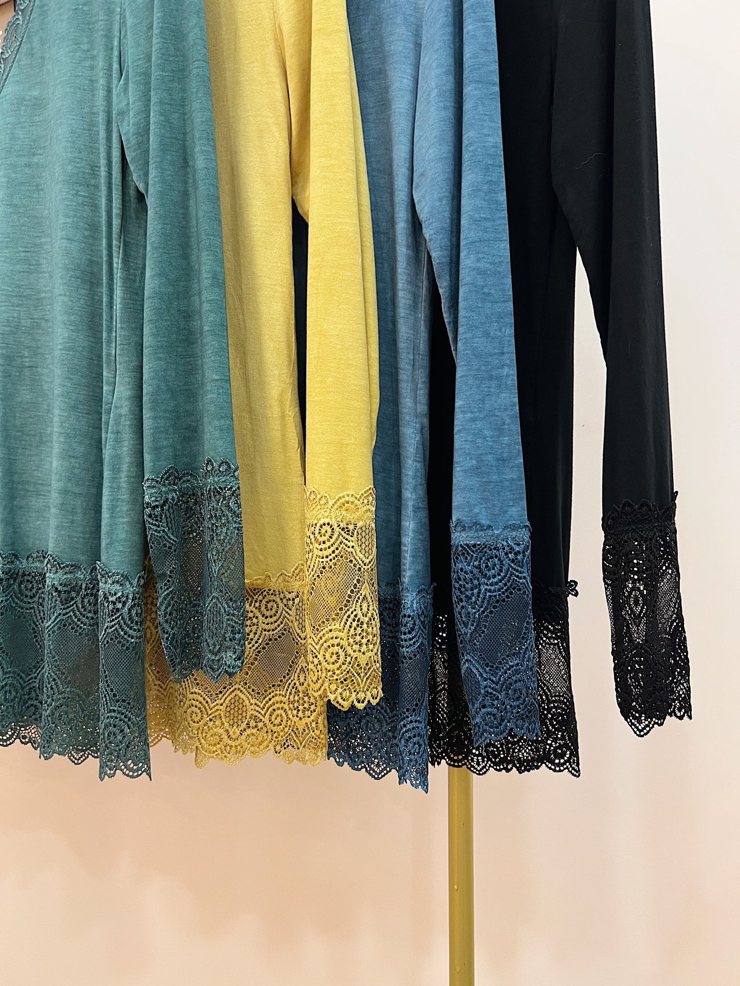Mangas compridas com renda nos punhos. Ajuste cintado com terminação de renda.