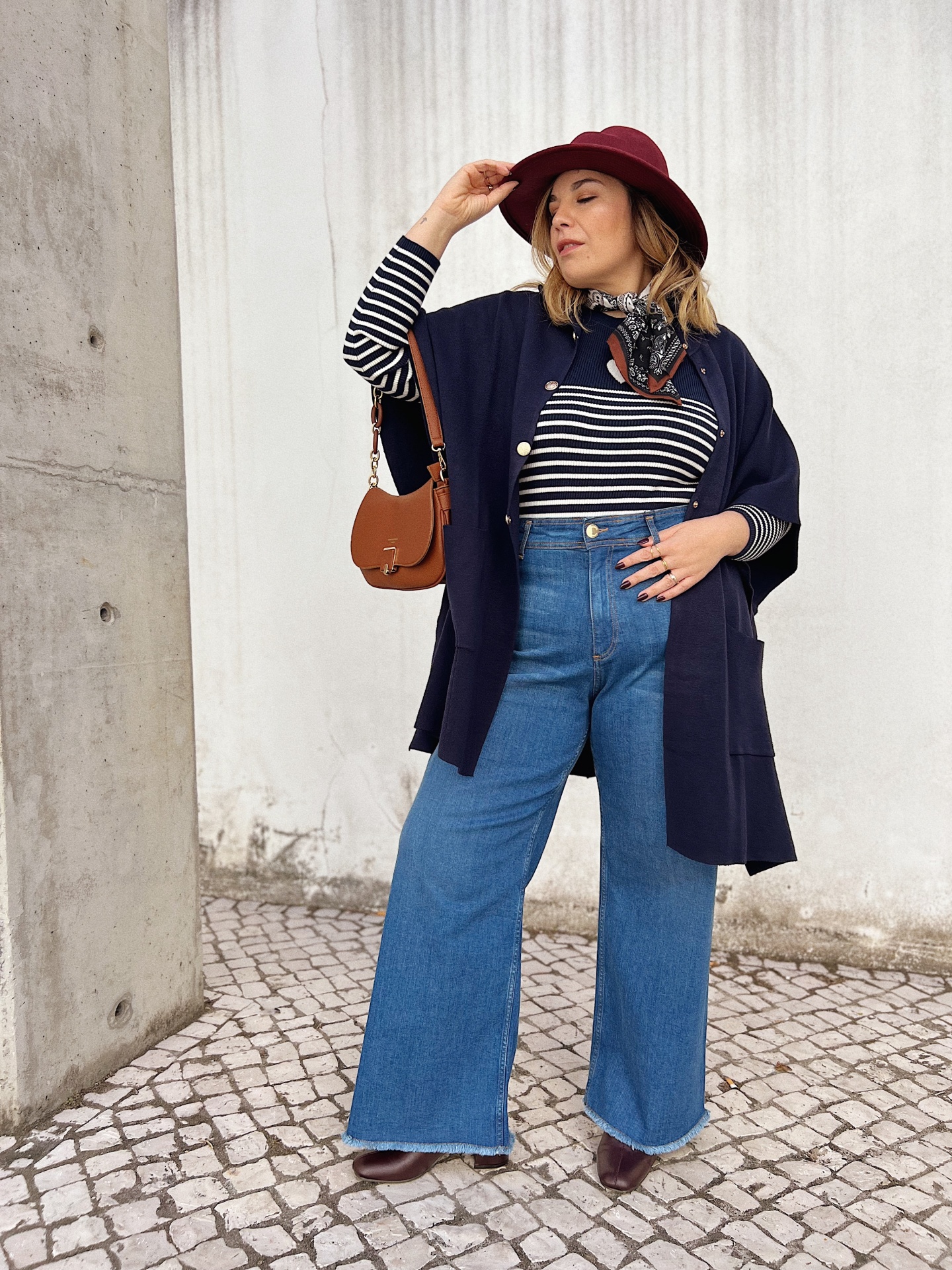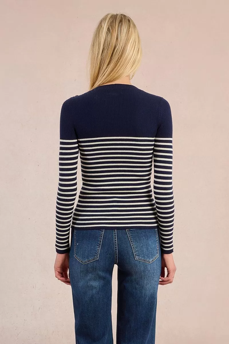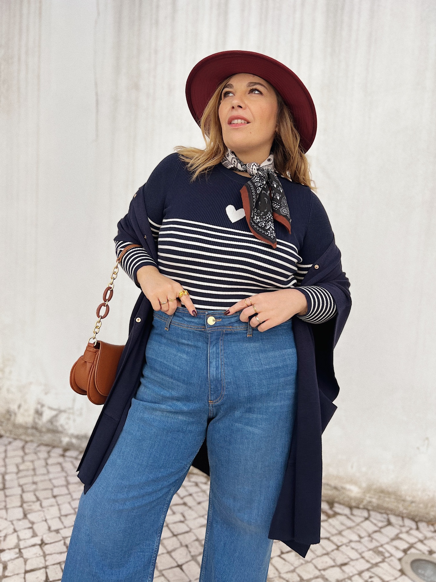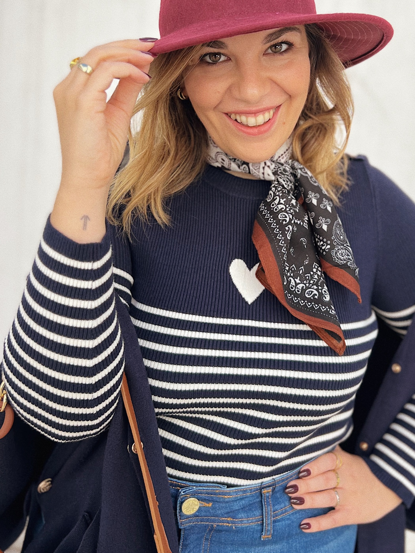 Camisola de malha canelada em azul marinho com coração e riscas em branco.