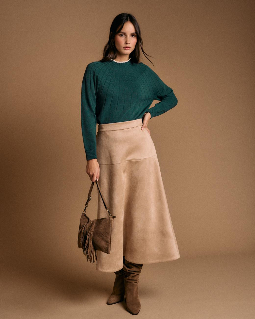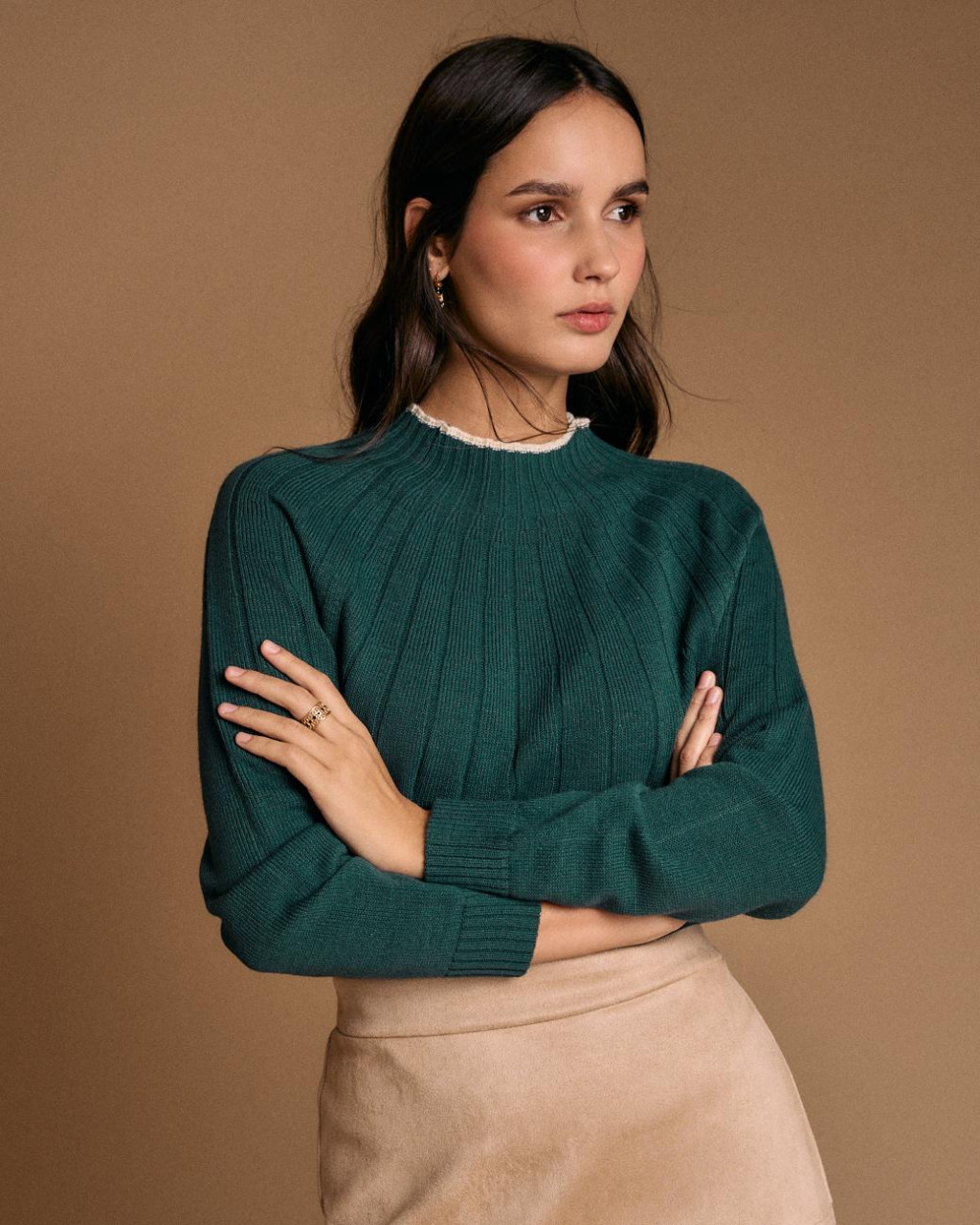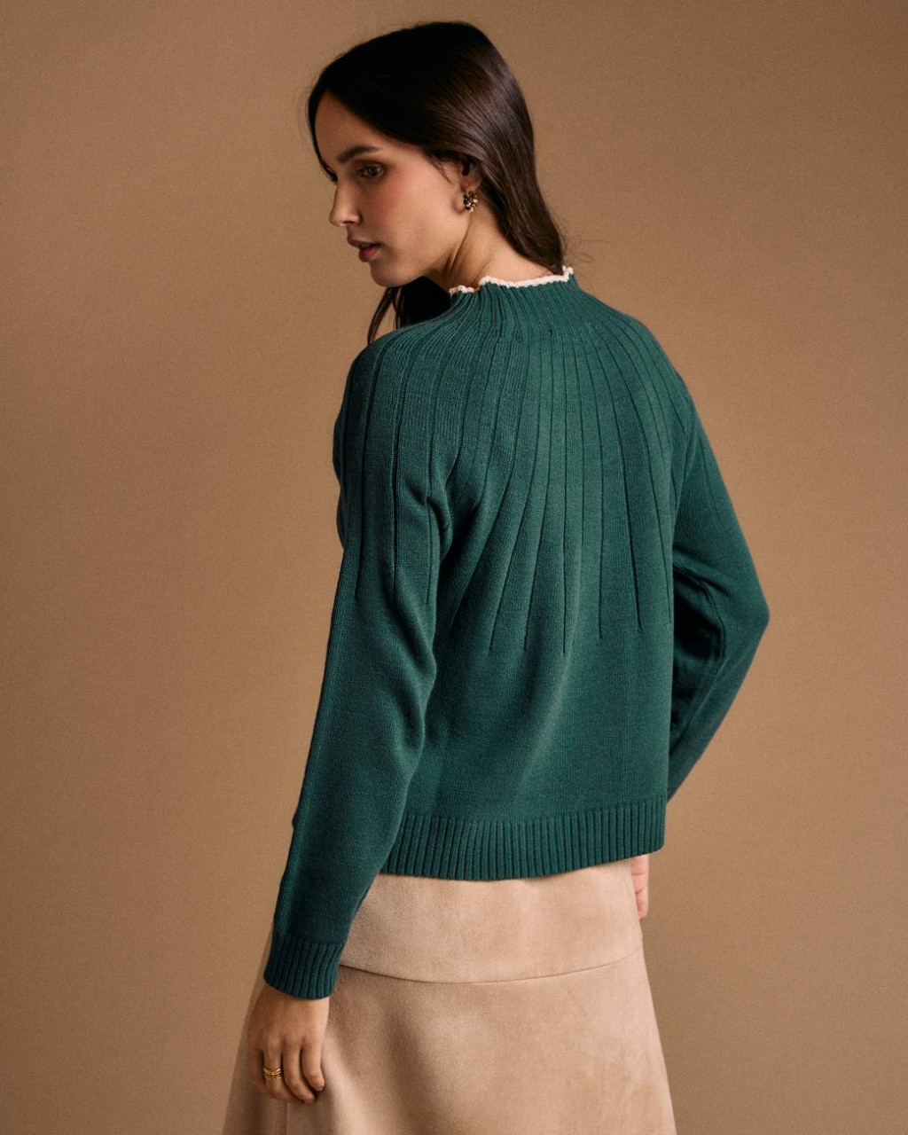 Camisola de malha (estilo linha mais fina) com decote subido (estilo canelado) com nervuras trabalhadas na malha e debrum a pérola.