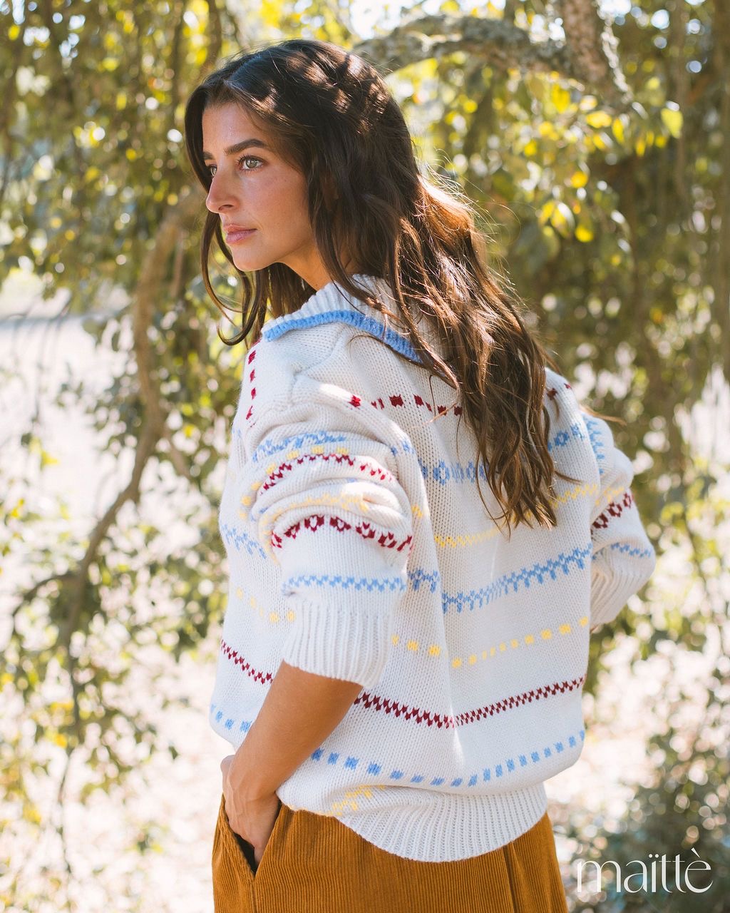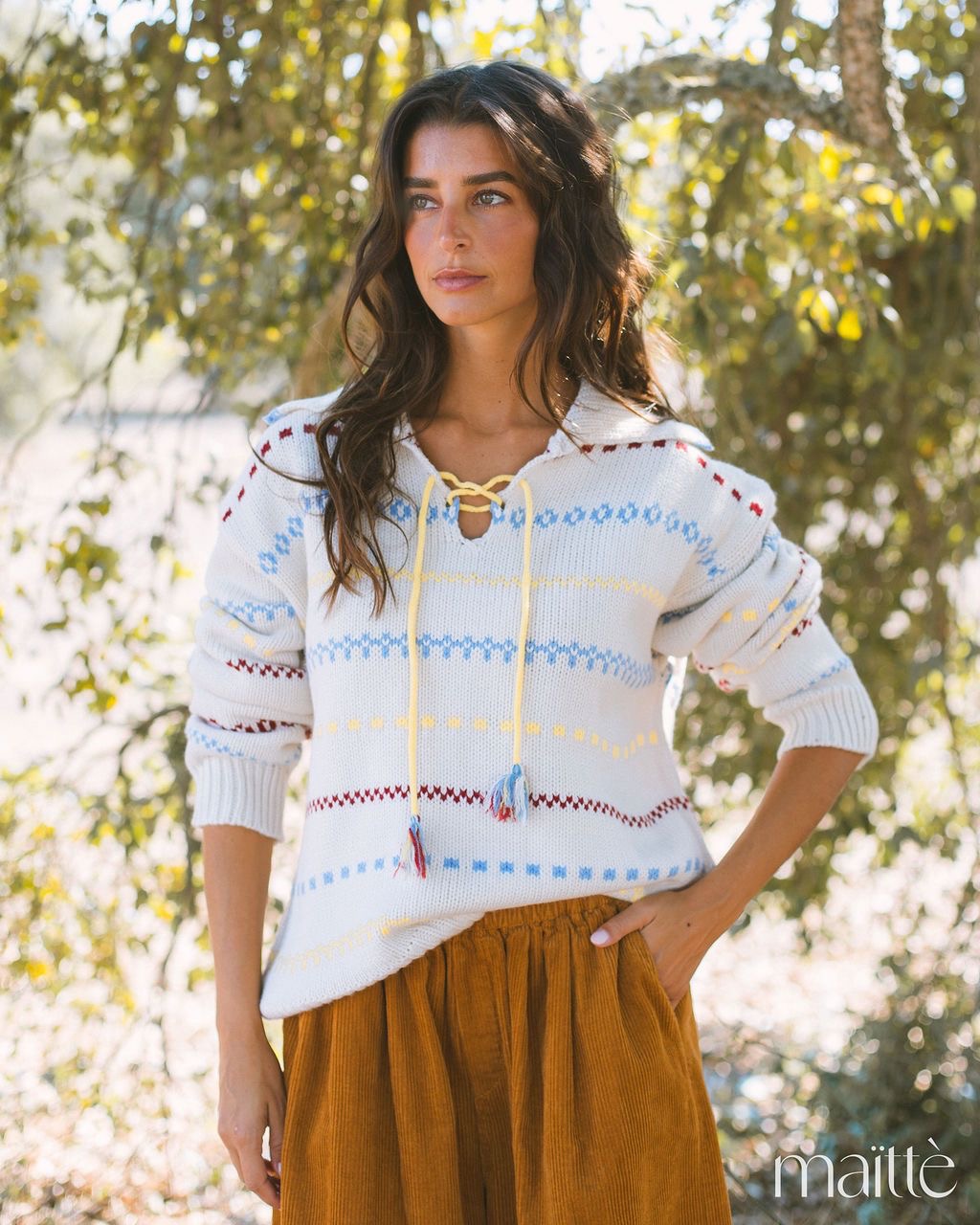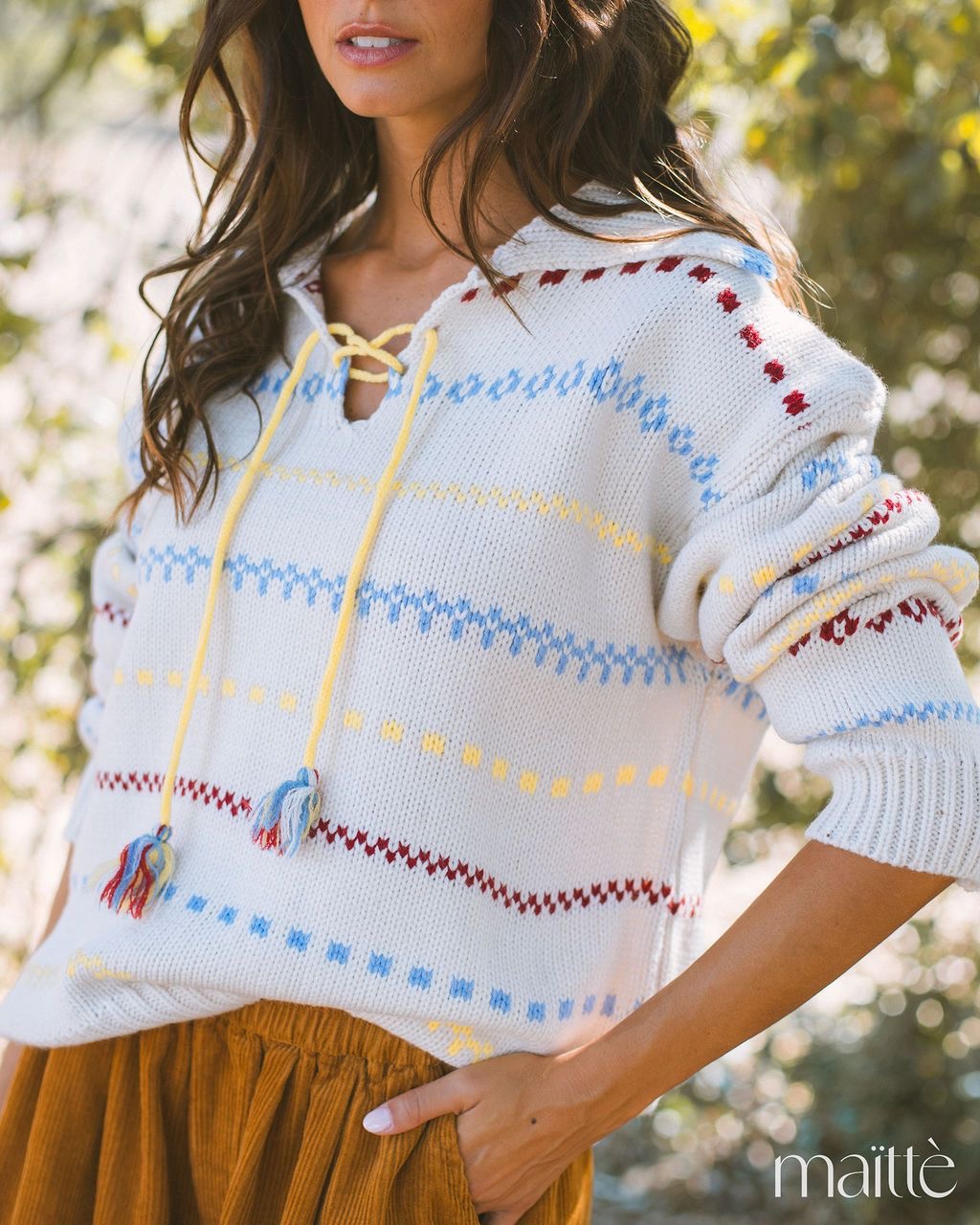 Camisola de malha quentinha e composta em crú com efeito de riscas coloridas trabalhadas na própria malha. Estilo Sweatshirt com gola clássica e atilhos à frente com berloque na terminação.