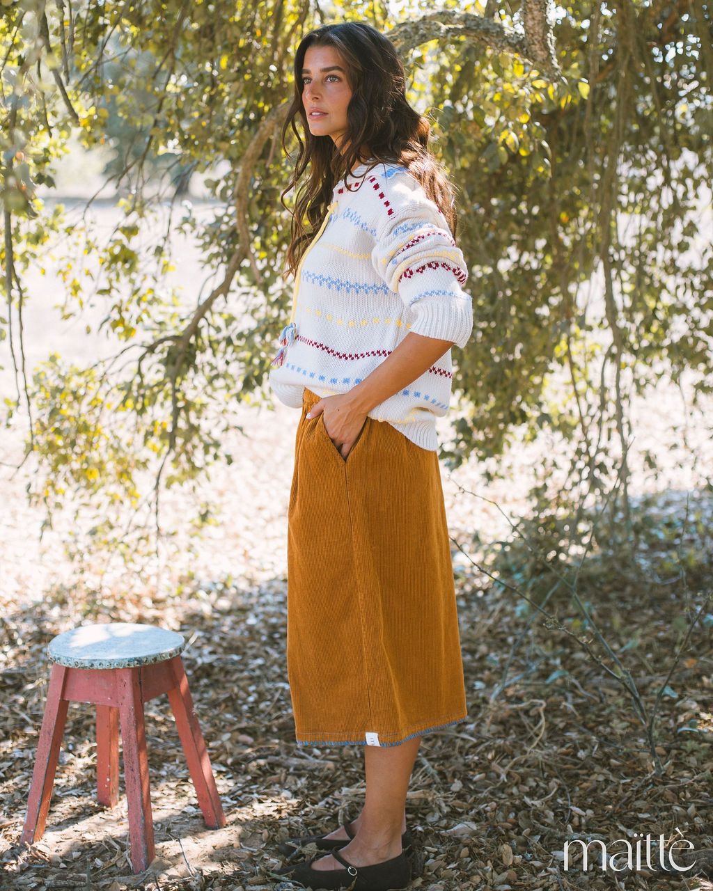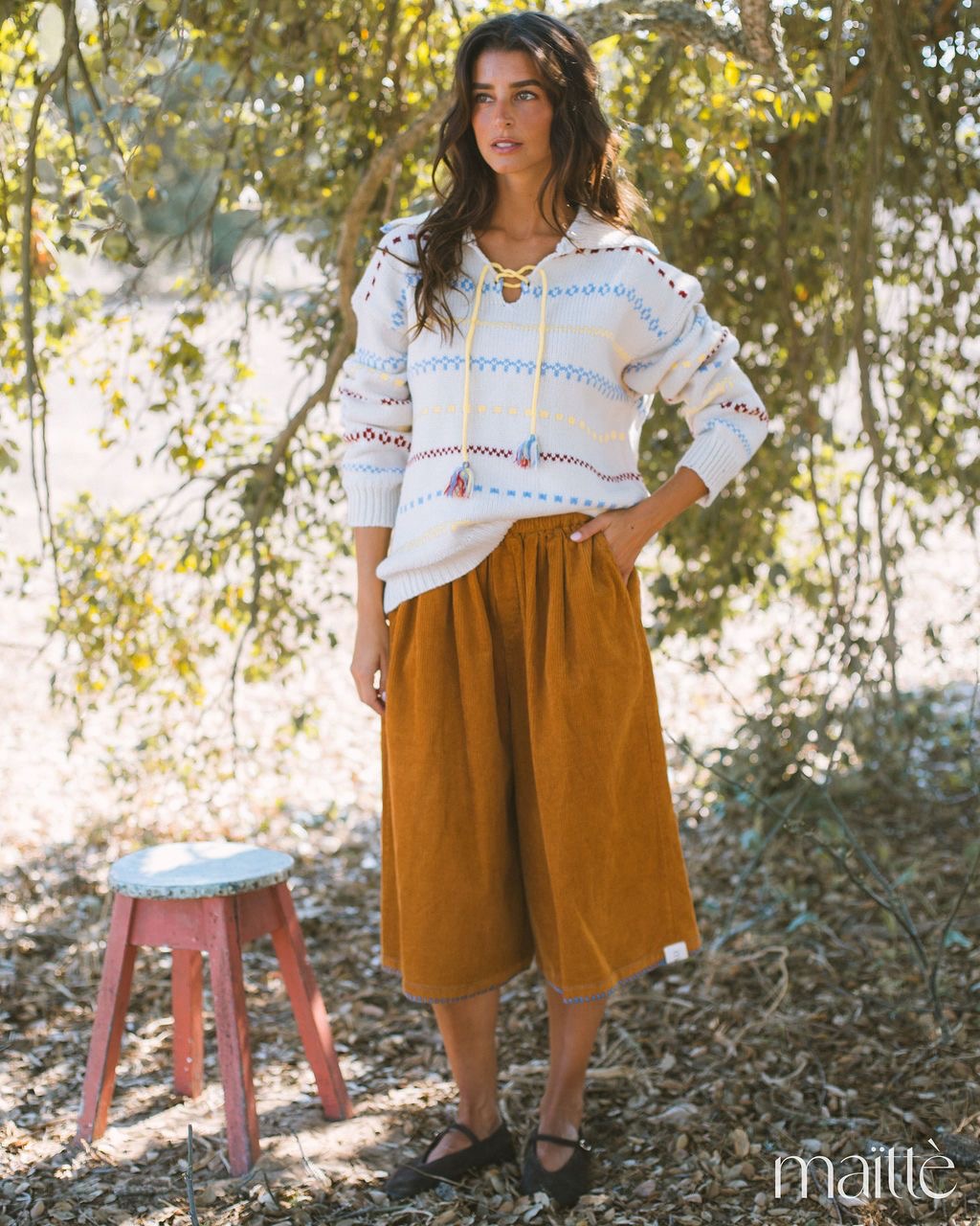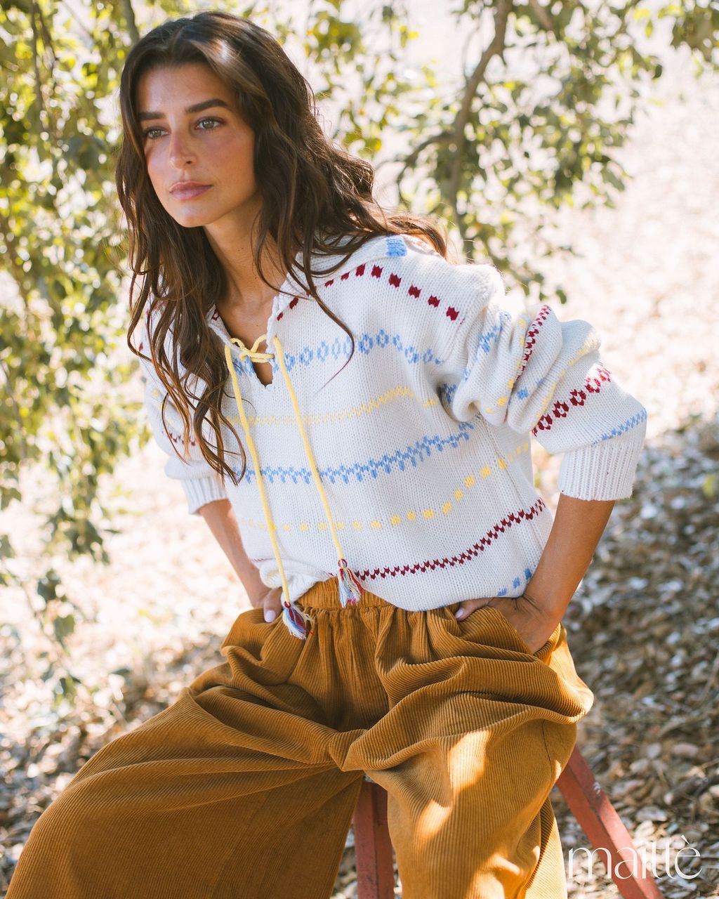 Camisola de malha quentinha e composta em crú com efeito de riscas coloridas trabalhadas na própria malha. Estilo Sweatshirt com gola clássica e atilhos à frente com berloque na terminação.