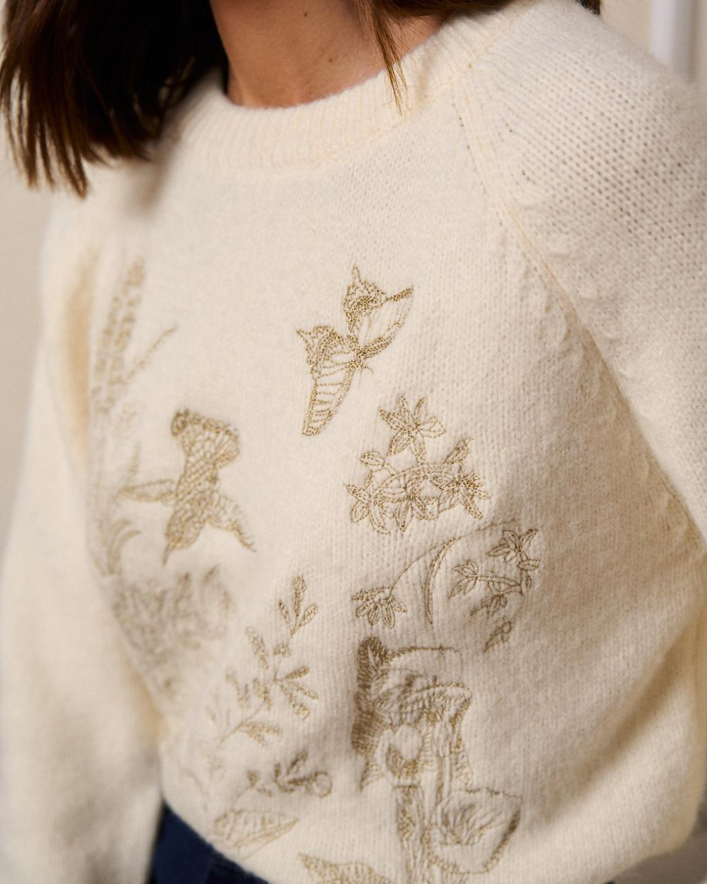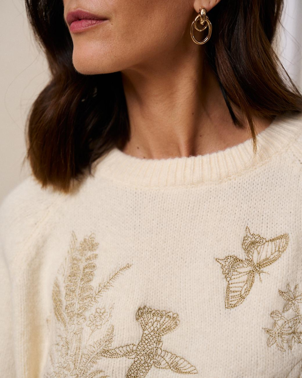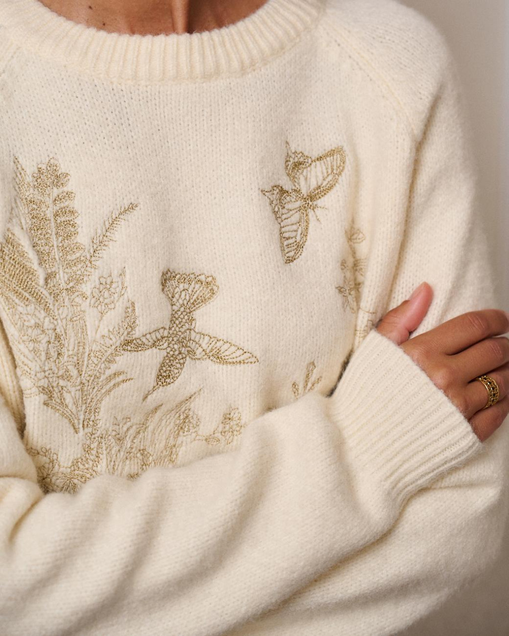 Camisola de malha em tom crú, numa malha compacta e quentinha com detalhes únicos bordados a dourado (flores, borboletas, beija-flor).