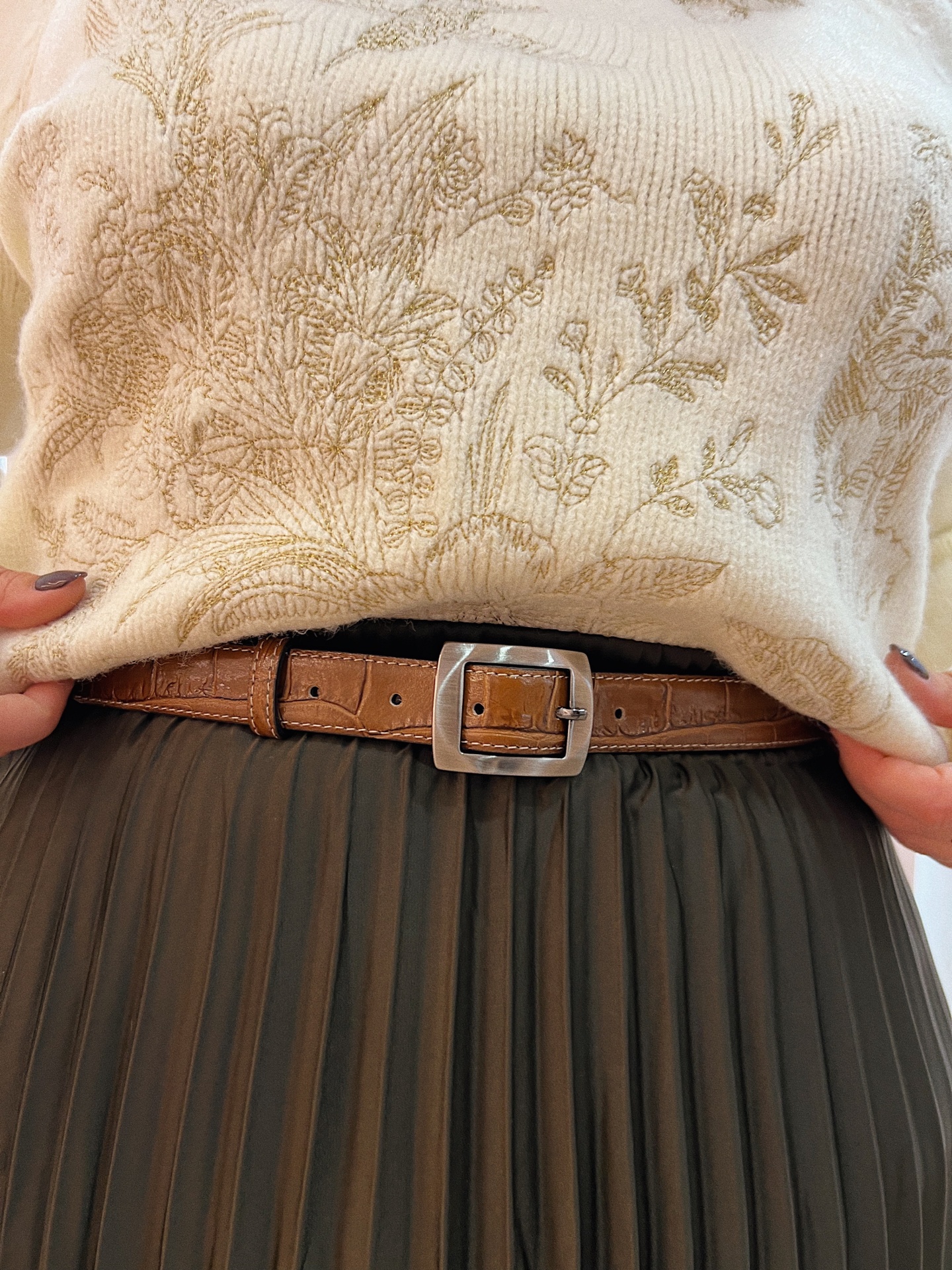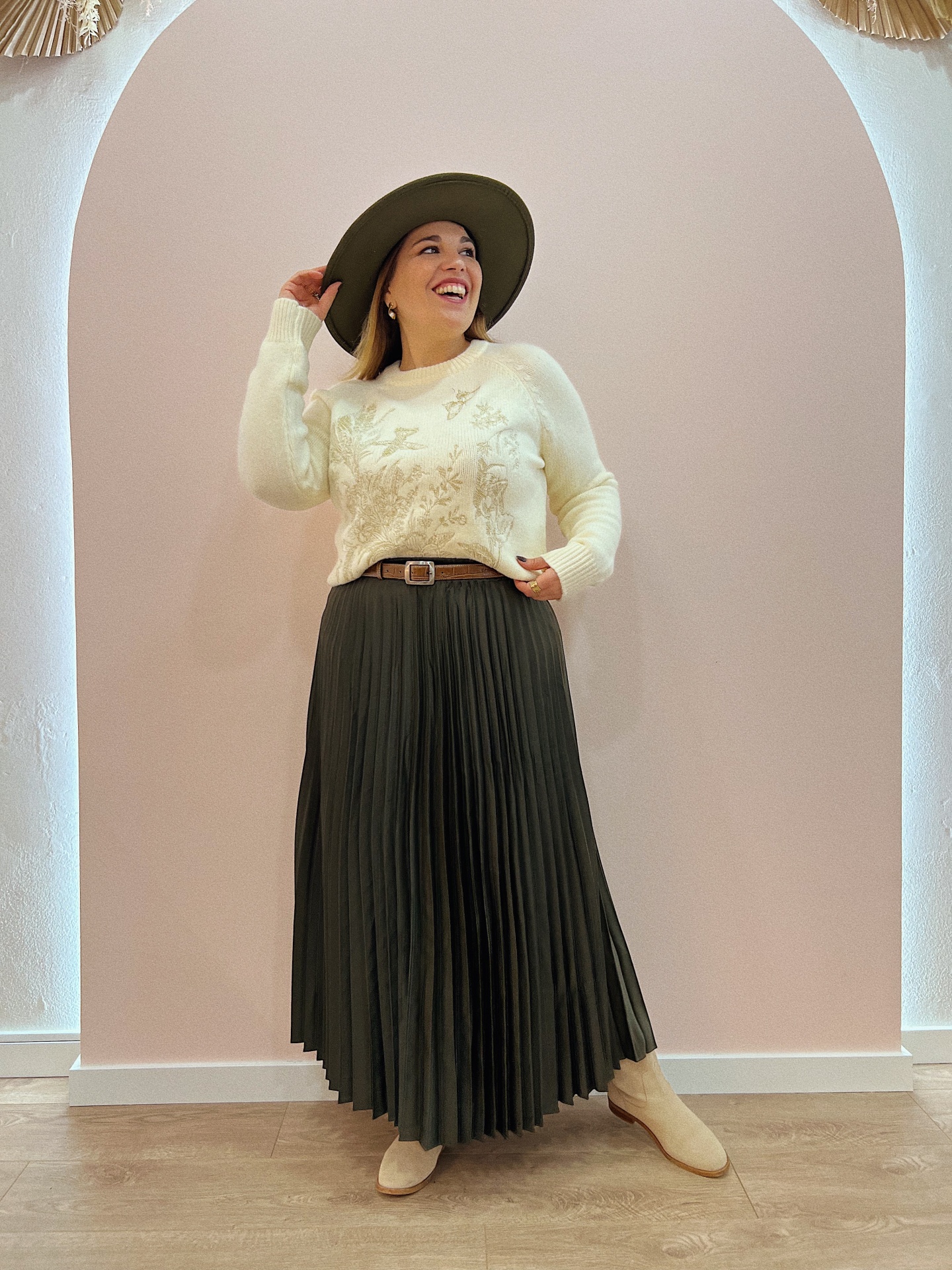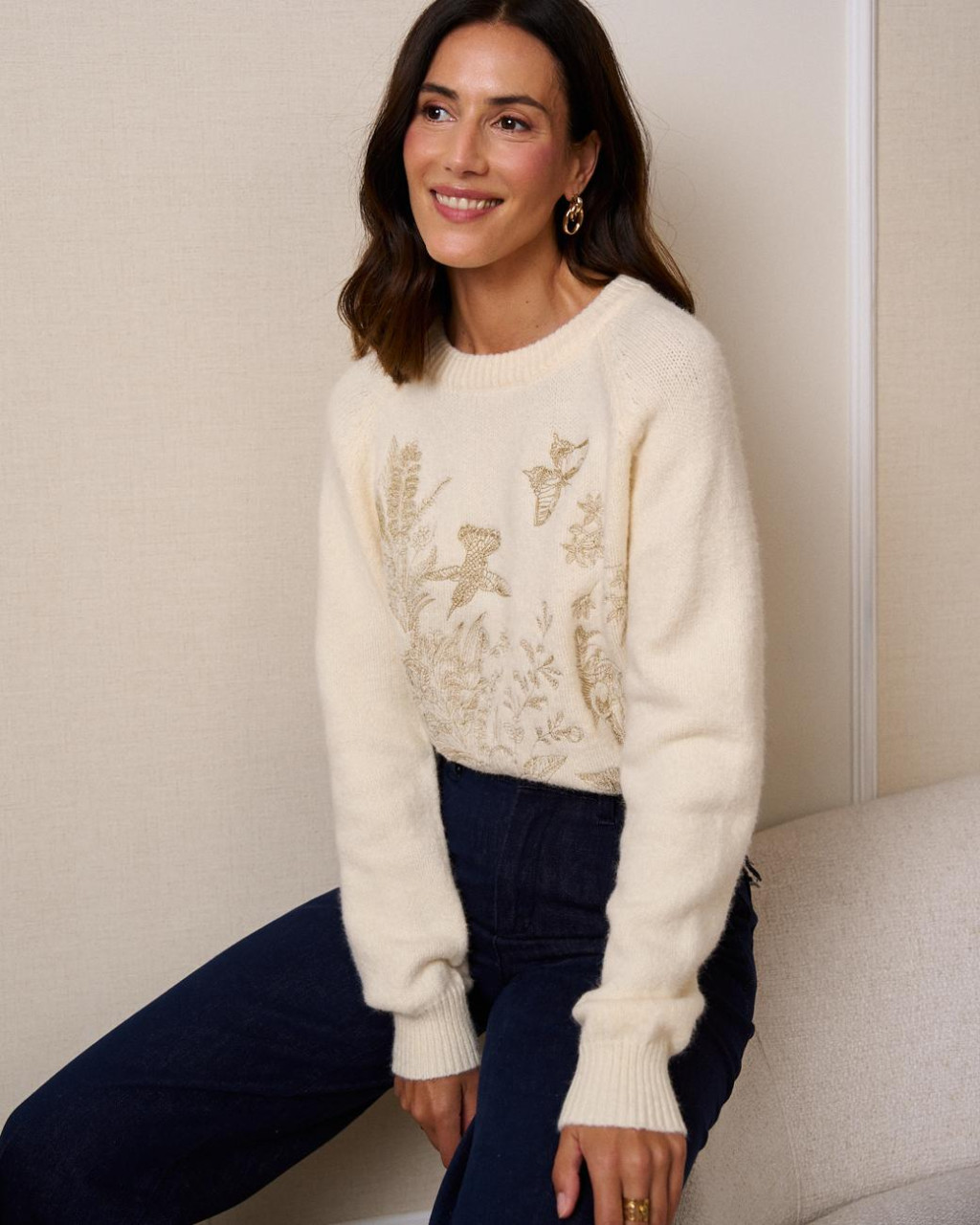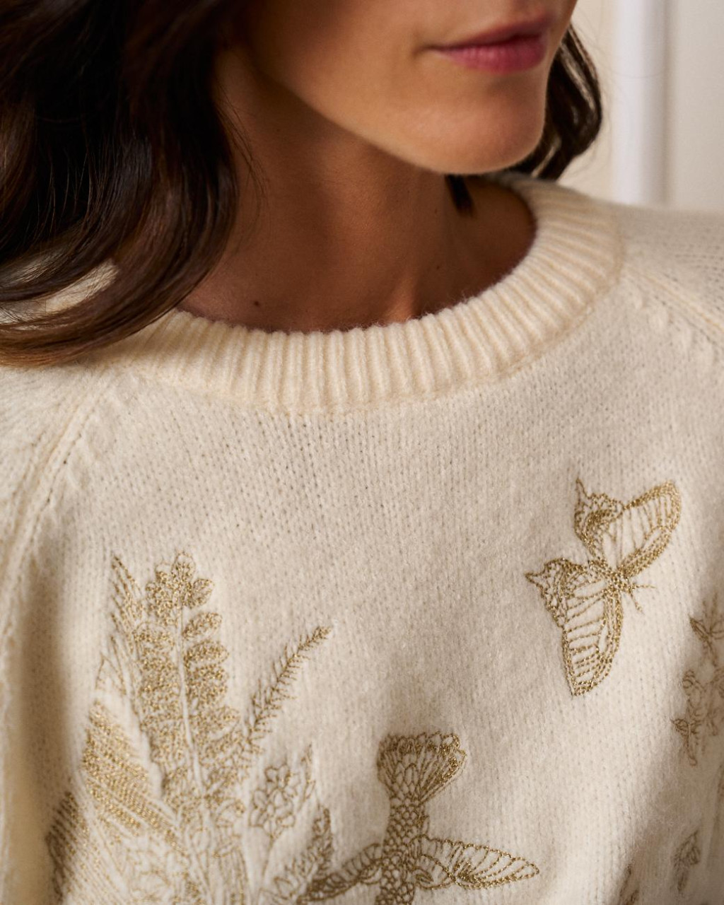 Camisola de malha em tom crú, numa malha compacta e quentinha com detalhes únicos bordados a dourado (flores, borboletas, beija-flor).