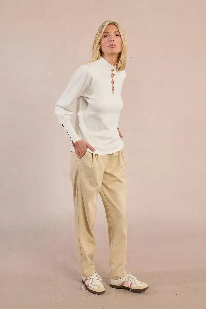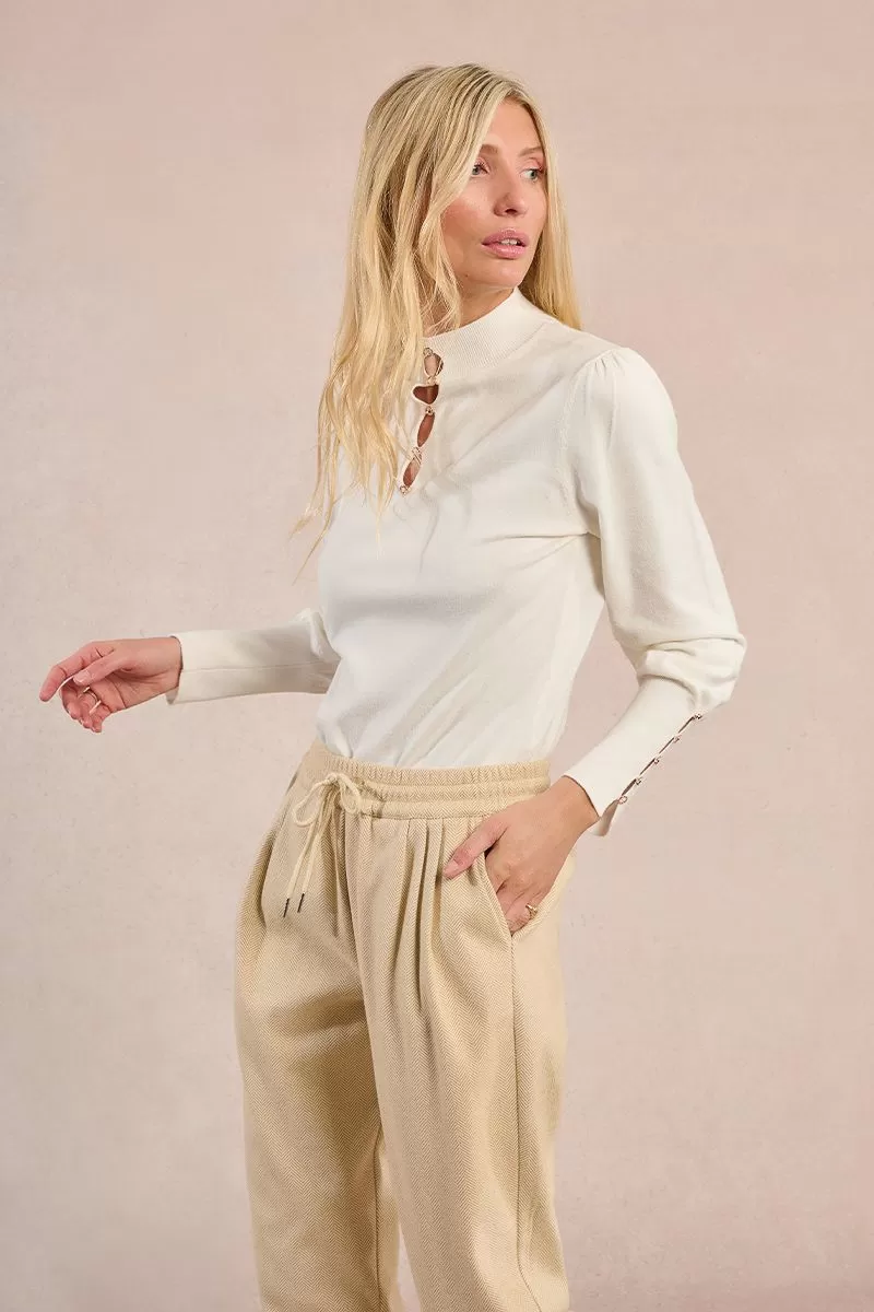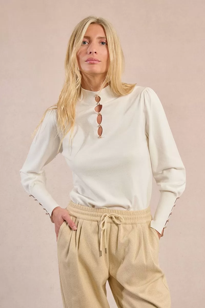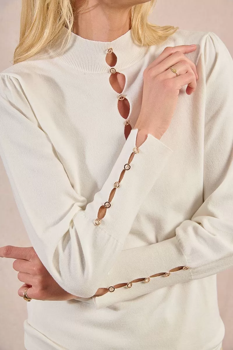 Camisola de malha original com aberturas e aplicação de botões dourados.