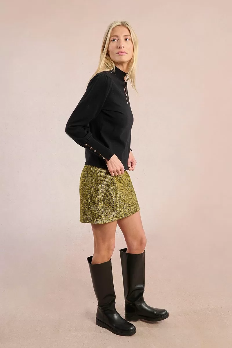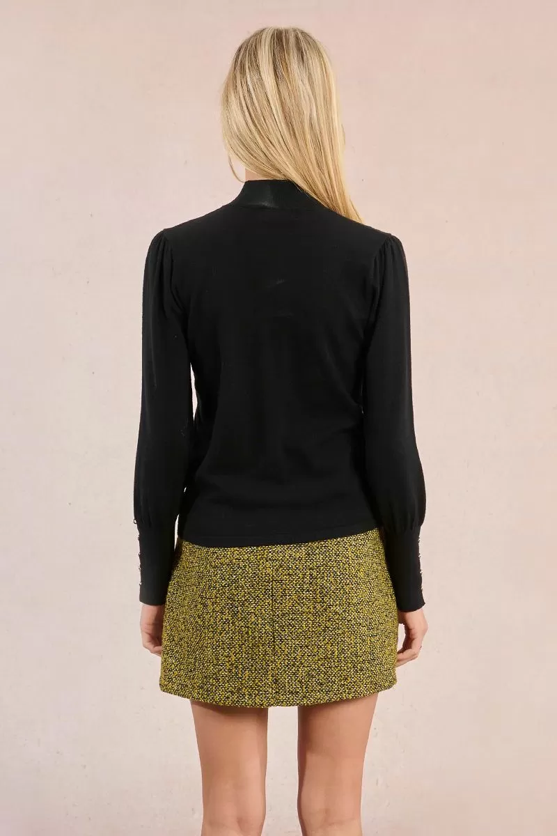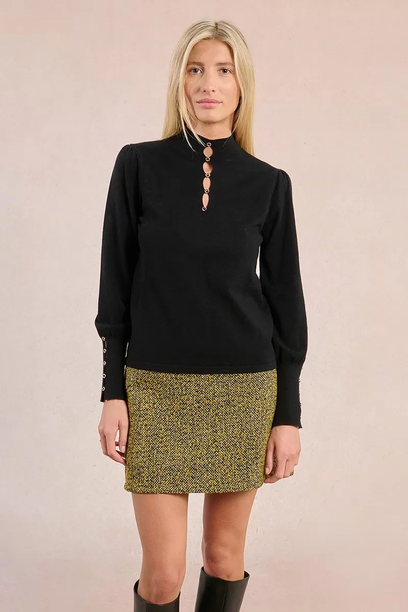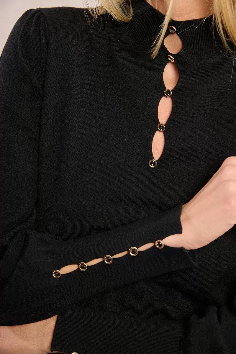 Camisola de malha original com aberturas e aplicação de botões dourados.