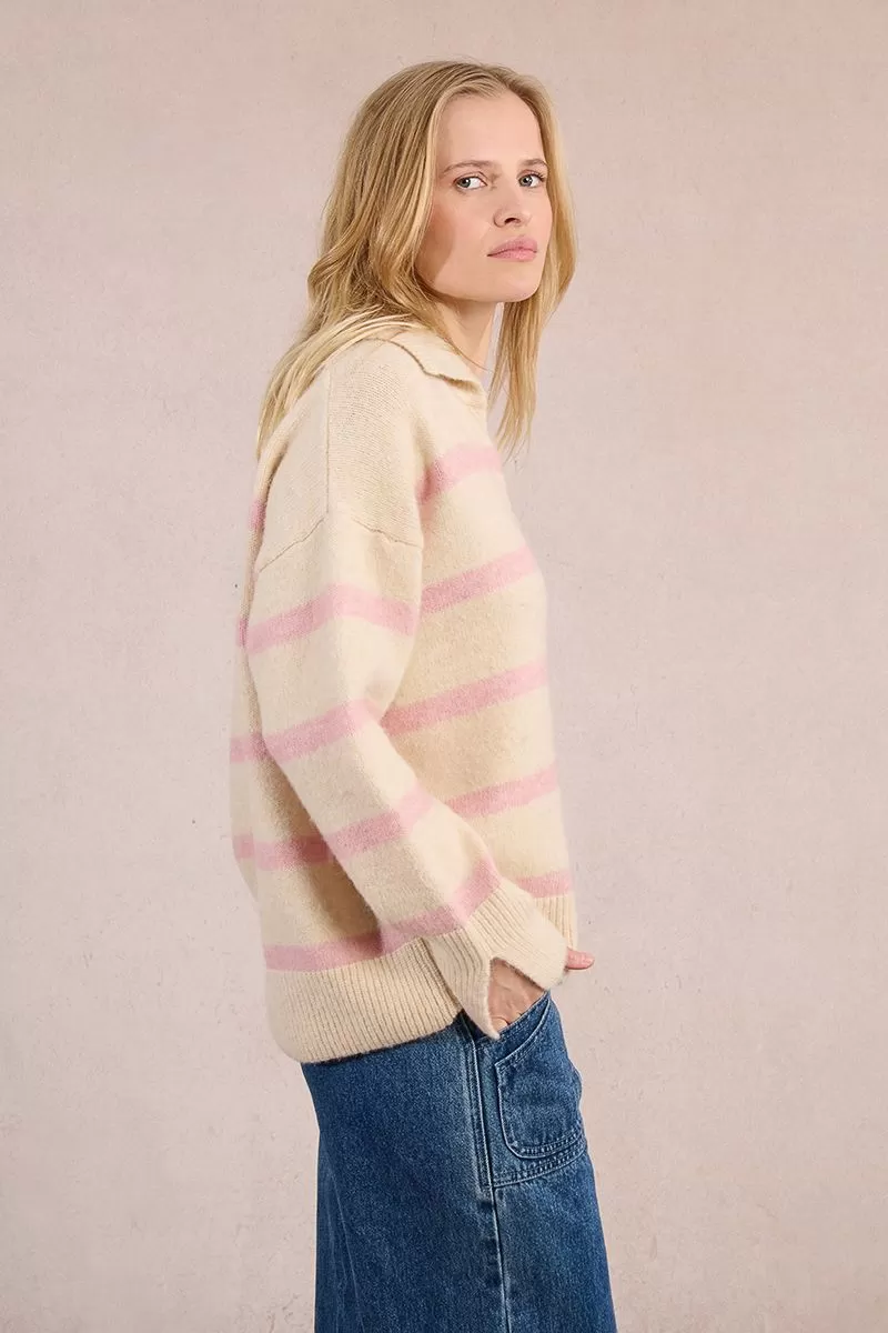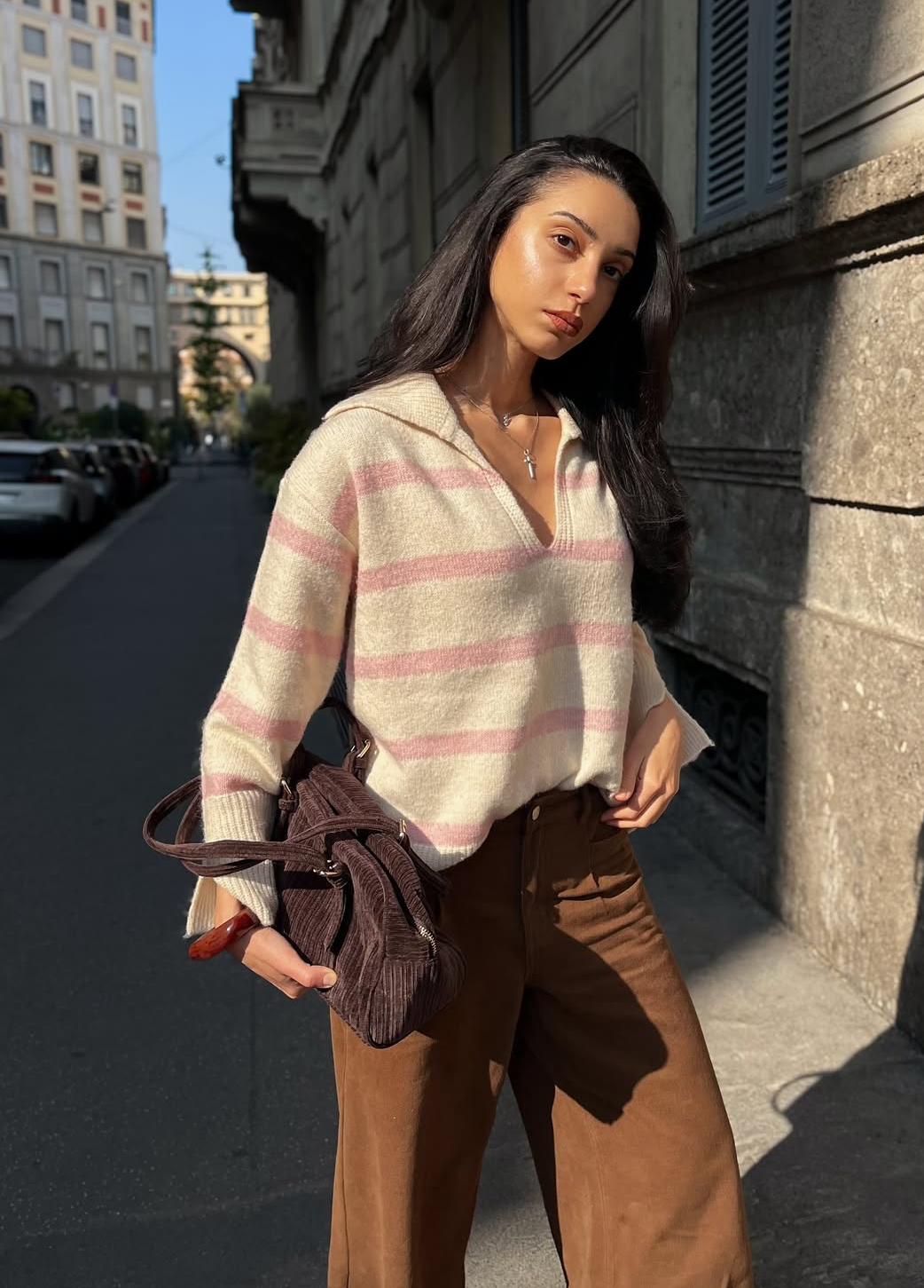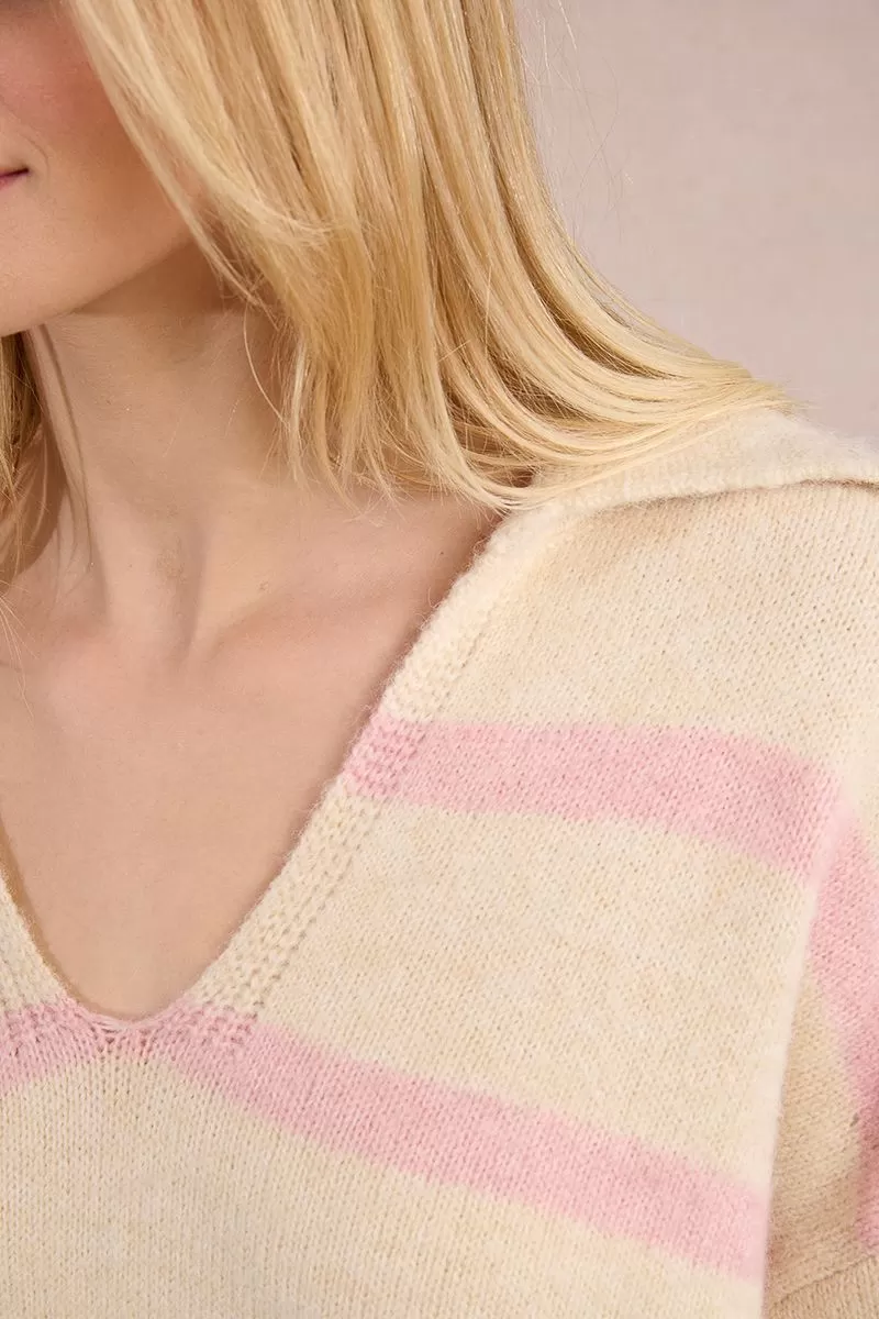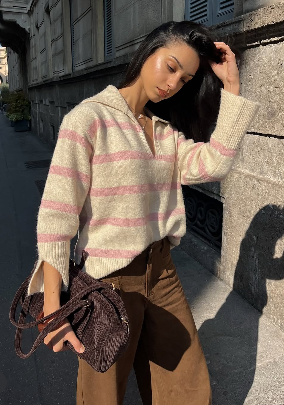 Camisola de malha bem quentinha e composta em crú com risca rosa.