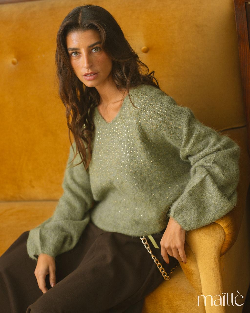 Camisola de malha verde (mesclada) quentinha e muito macia com aplicações variadas em dourado.