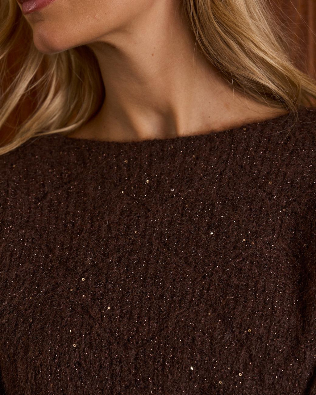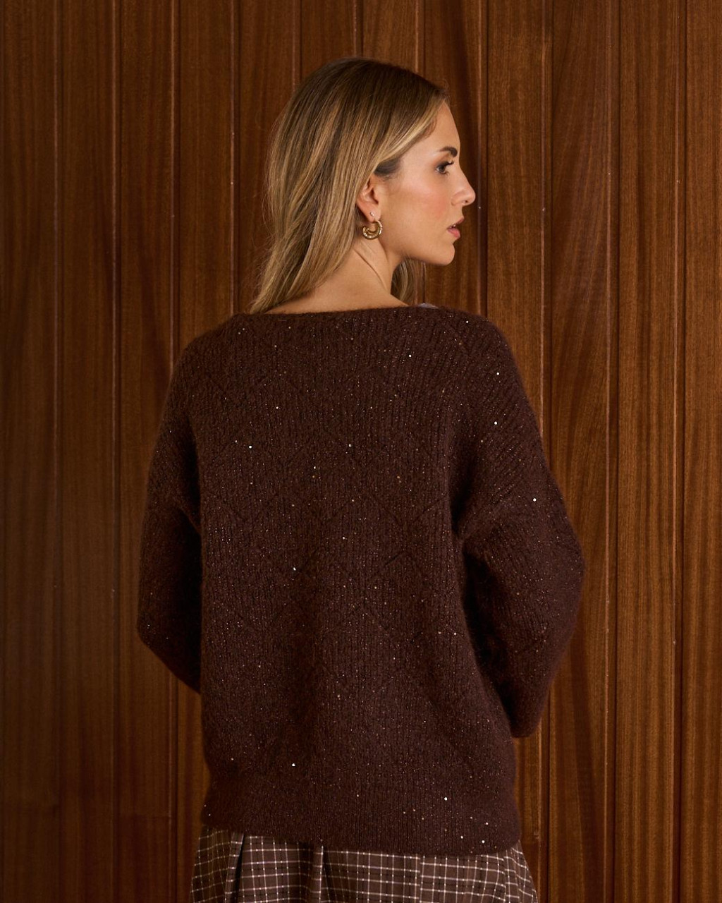 Camisola de malha castanha trabalhada (efeito losangos) com mini-lantejoulas douradas em contraste.