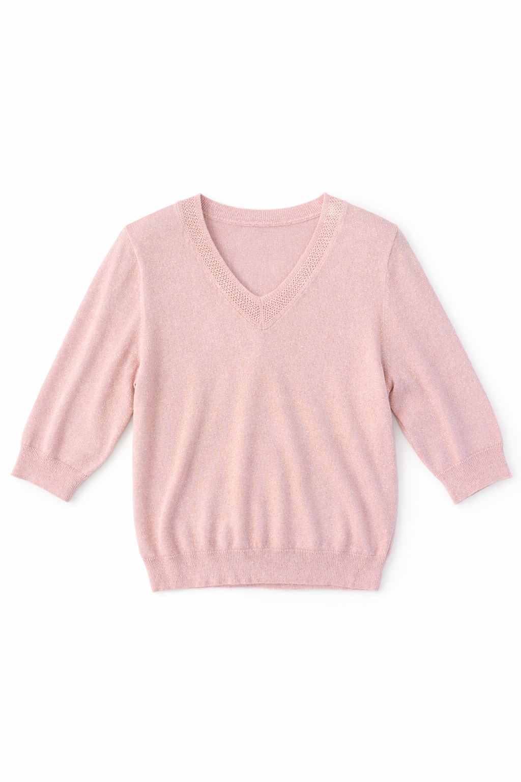 Modelo com decote em V trabalhado. Mangas 3/4.