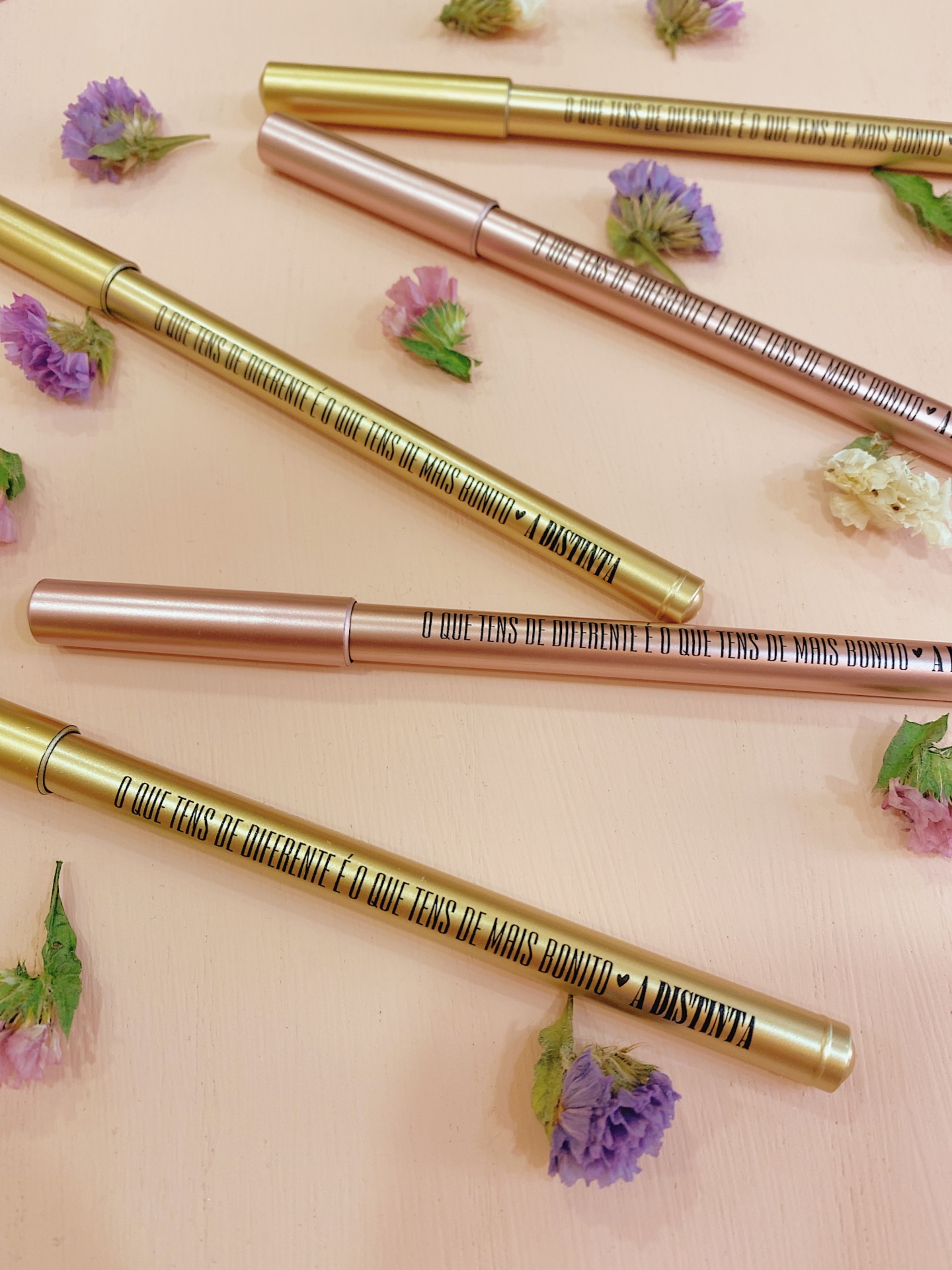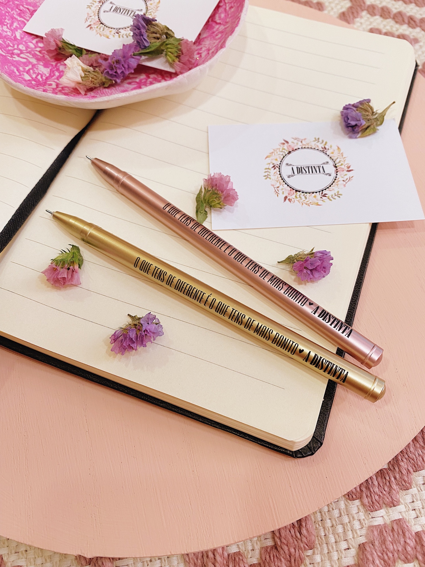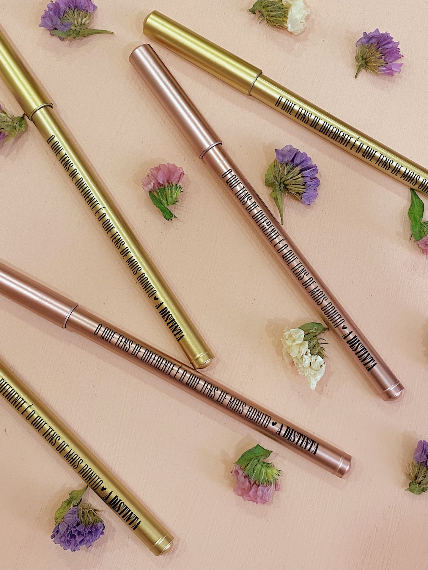 Caneta rosa ou dourada com tampa, personalizada com frase "O que tens de diferente é o que tens de mais bonito", coração preto e o nome da nossa loja.