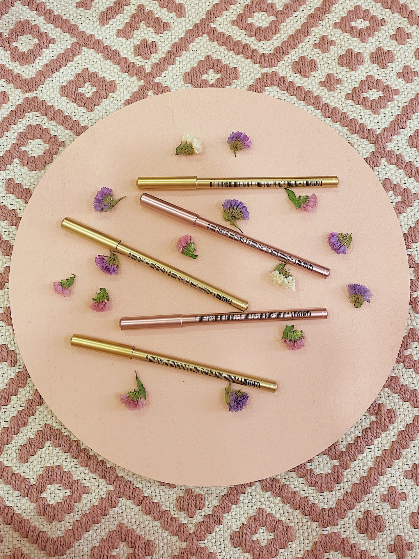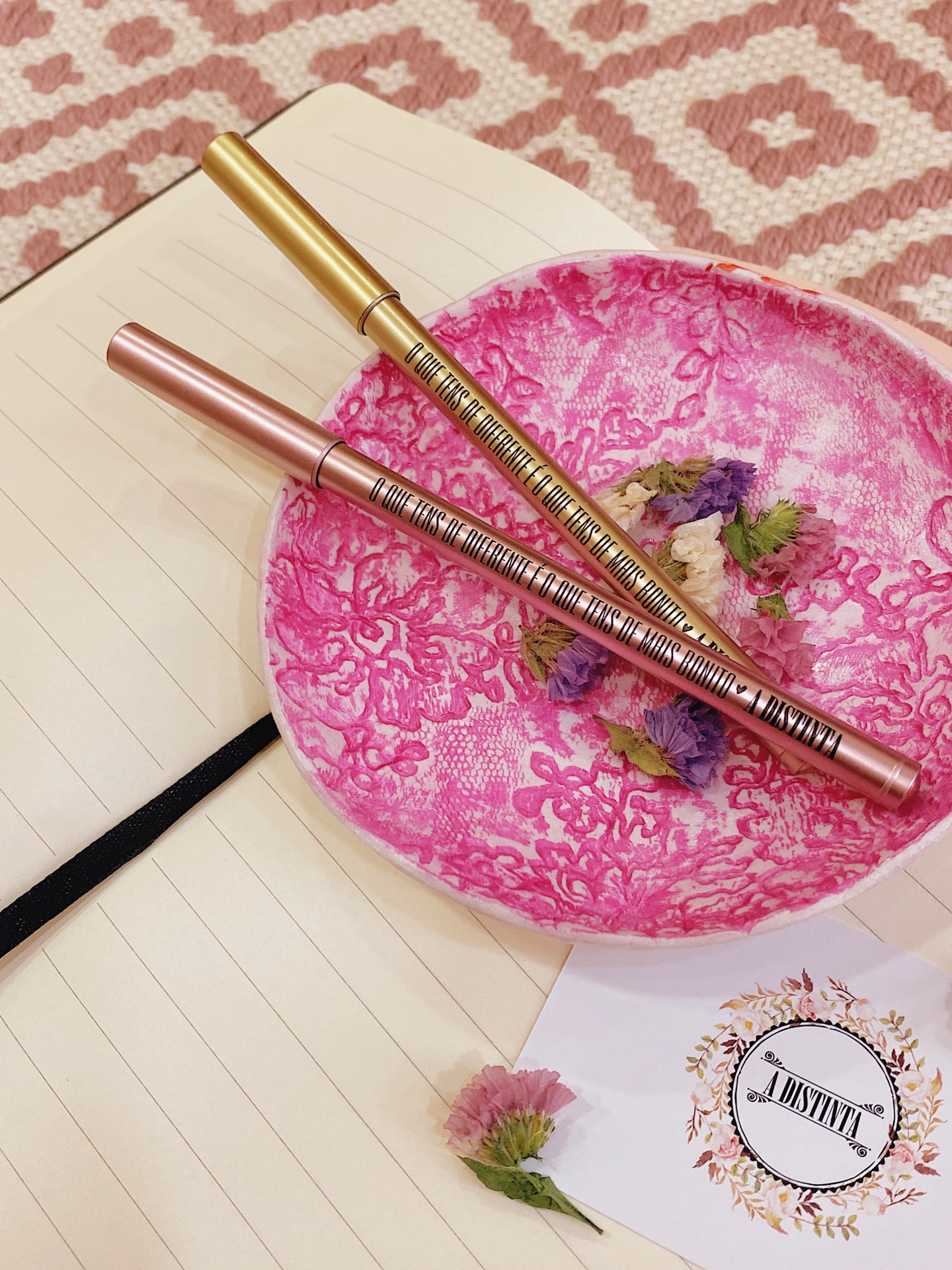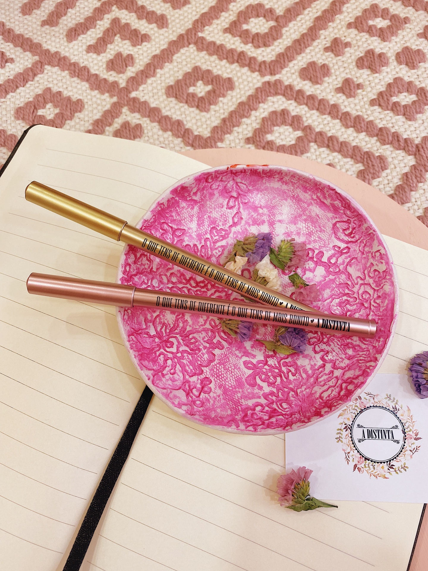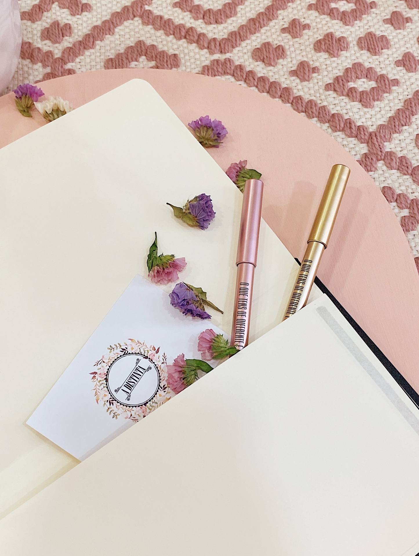 Caneta rosa ou dourada com tampa, personalizada com frase "O que tens de diferente é o que tens de mais bonito", coração preto e o nome da nossa loja.