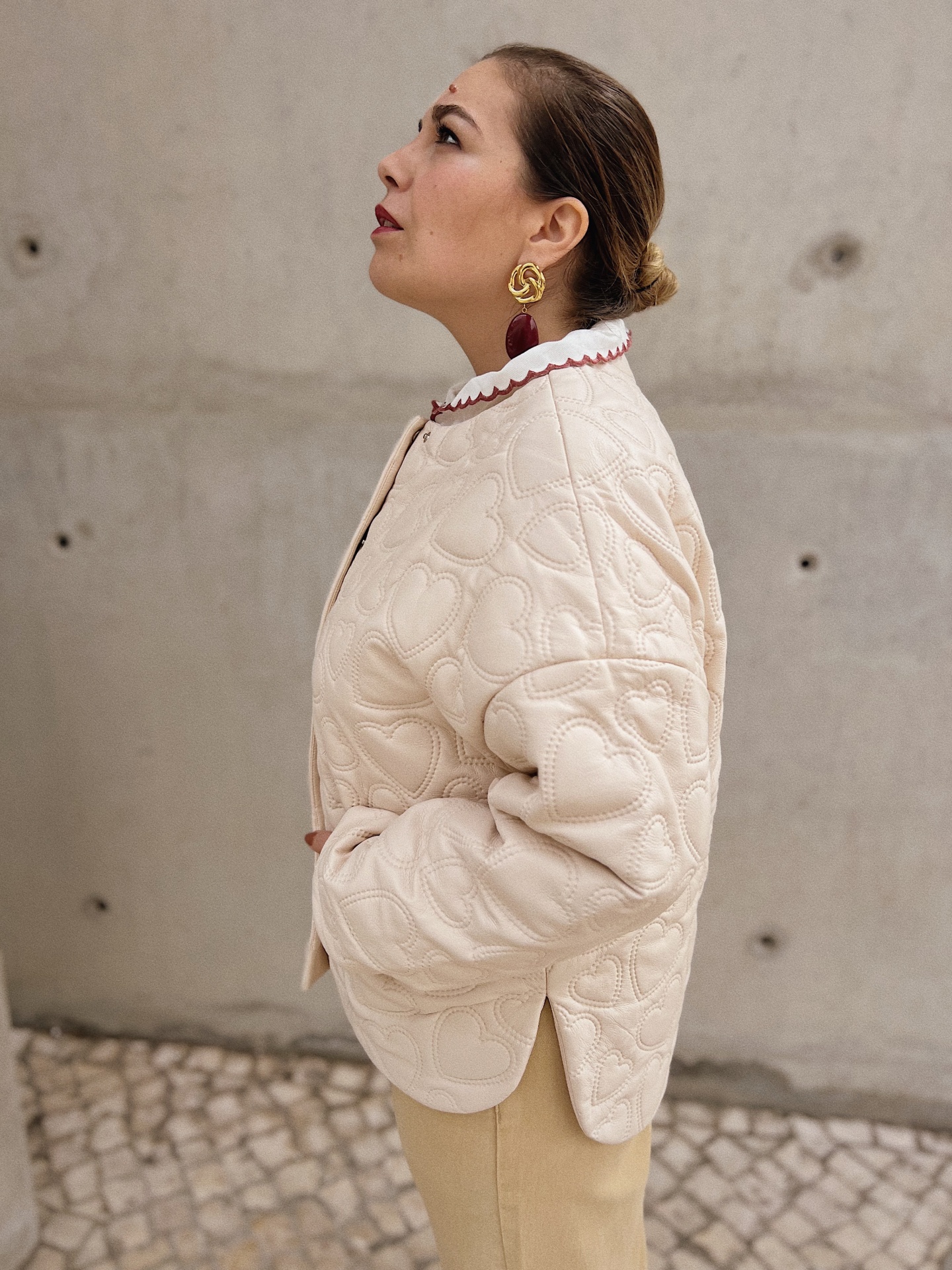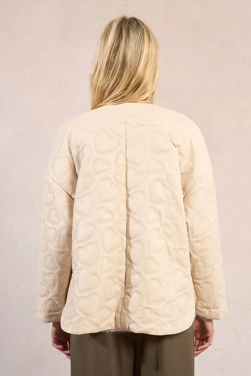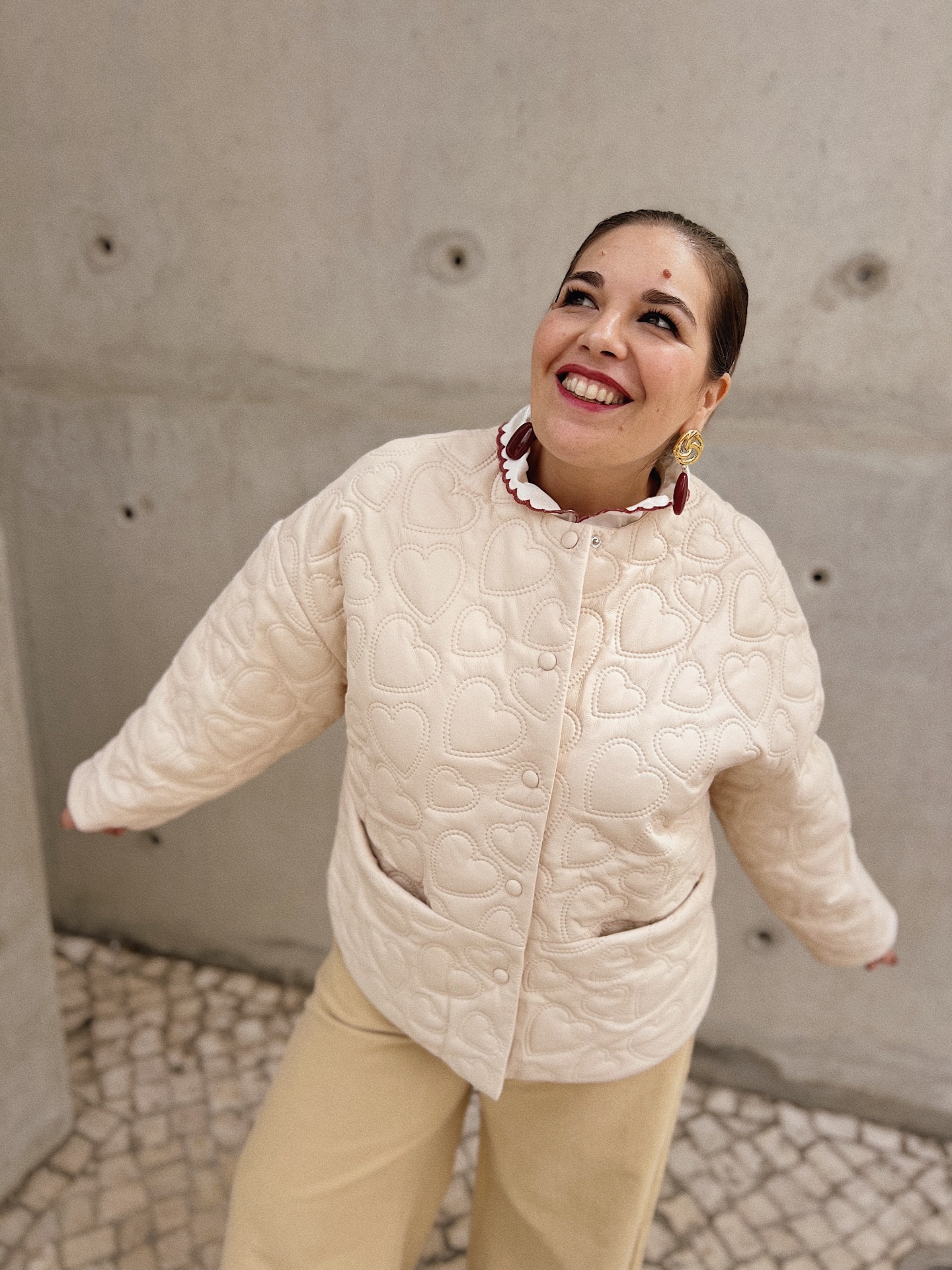 Casaco oversize em eco-pele (napa) pérola com corações bordados.