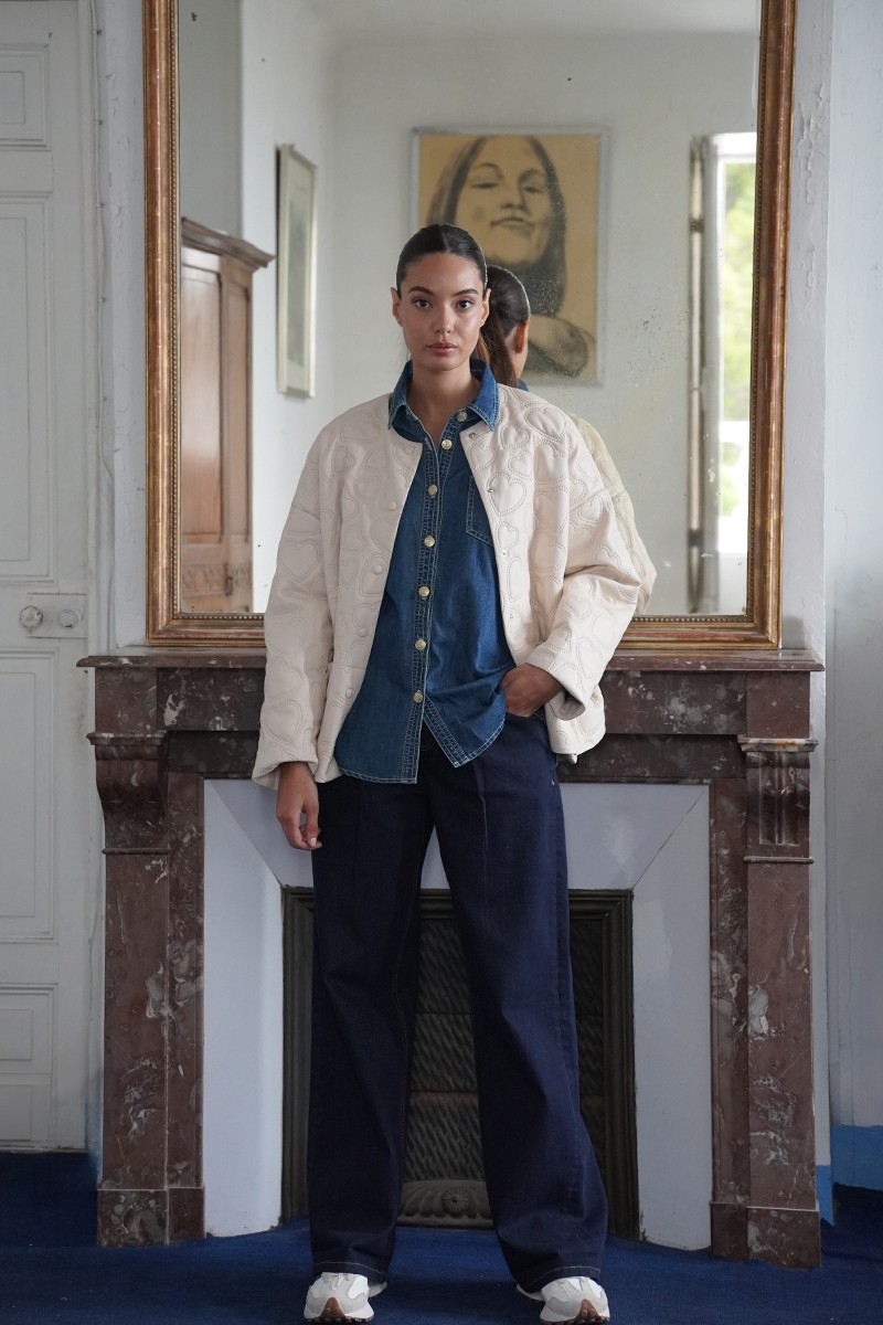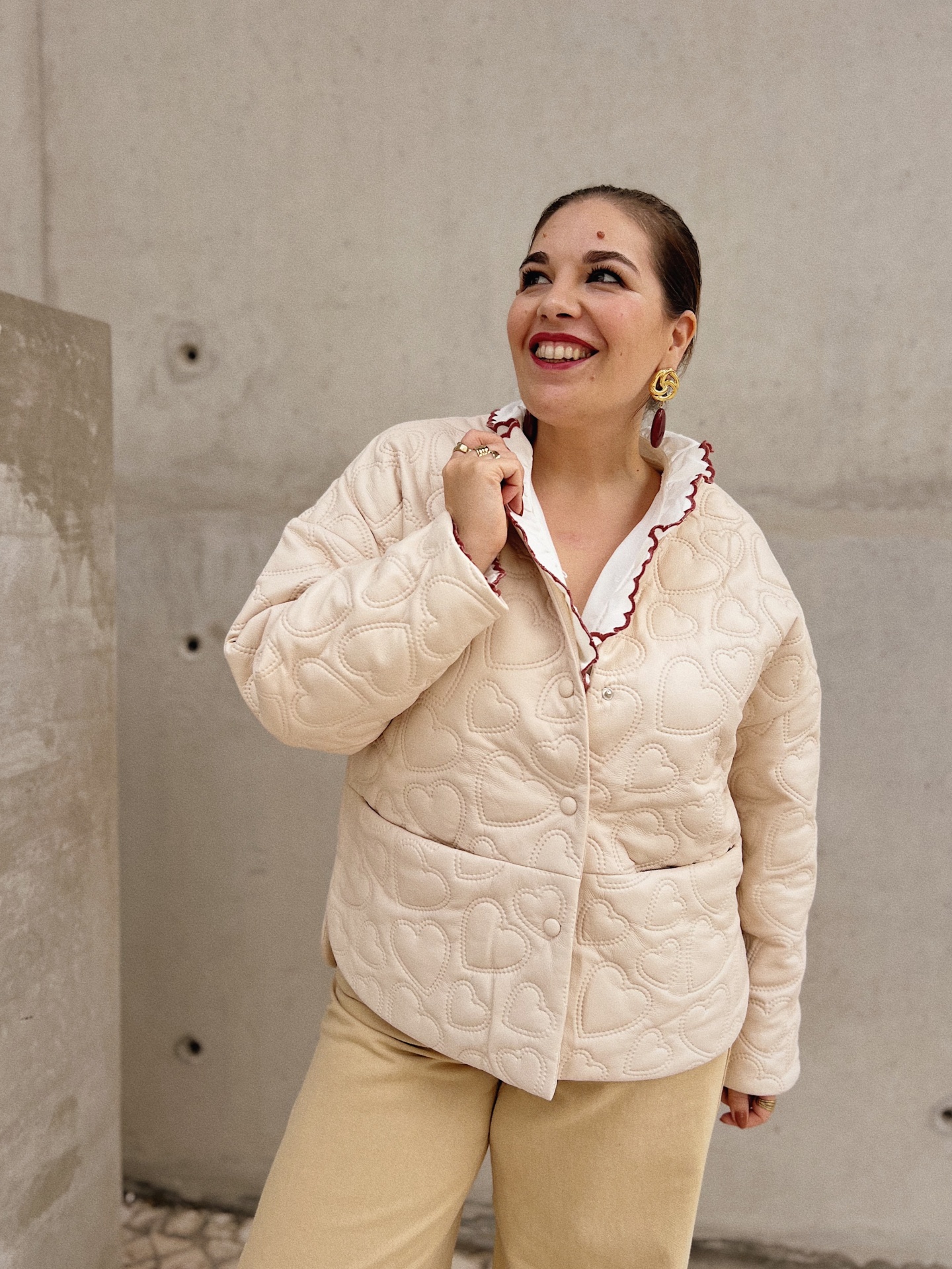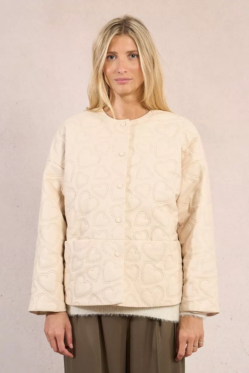 Casaco oversize em eco-pele (napa) pérola com corações bordados.