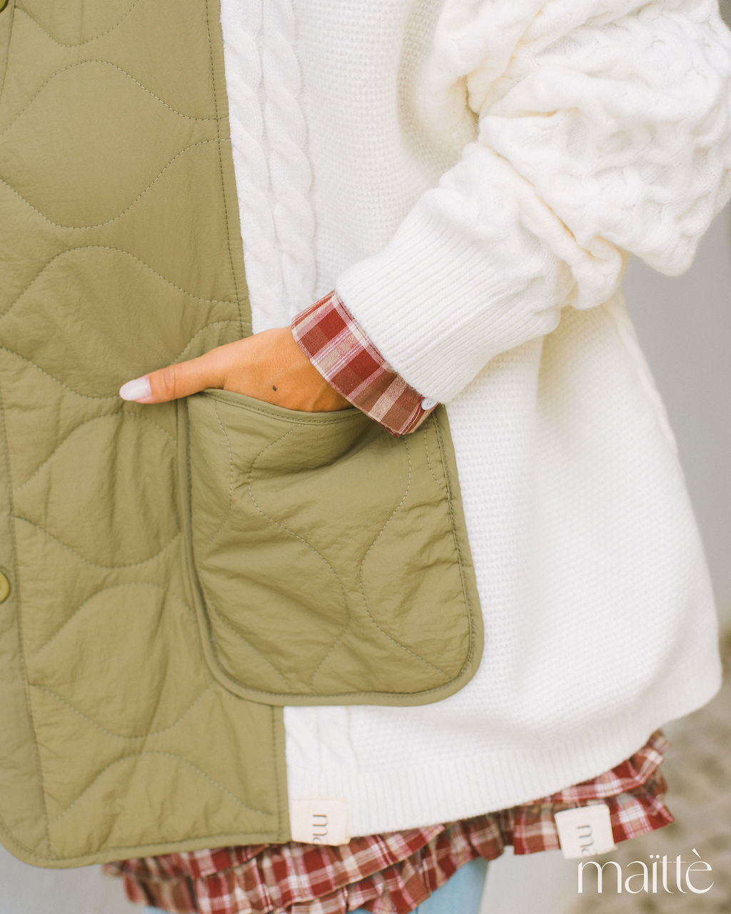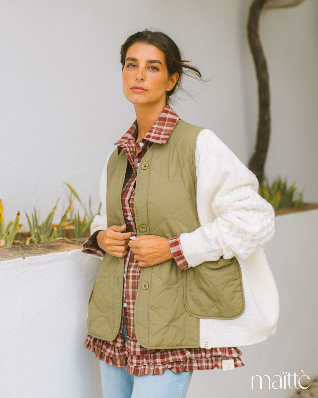 Efeito de Kispo (acolchoado) com bolsos de chapa no mesmo tecido.