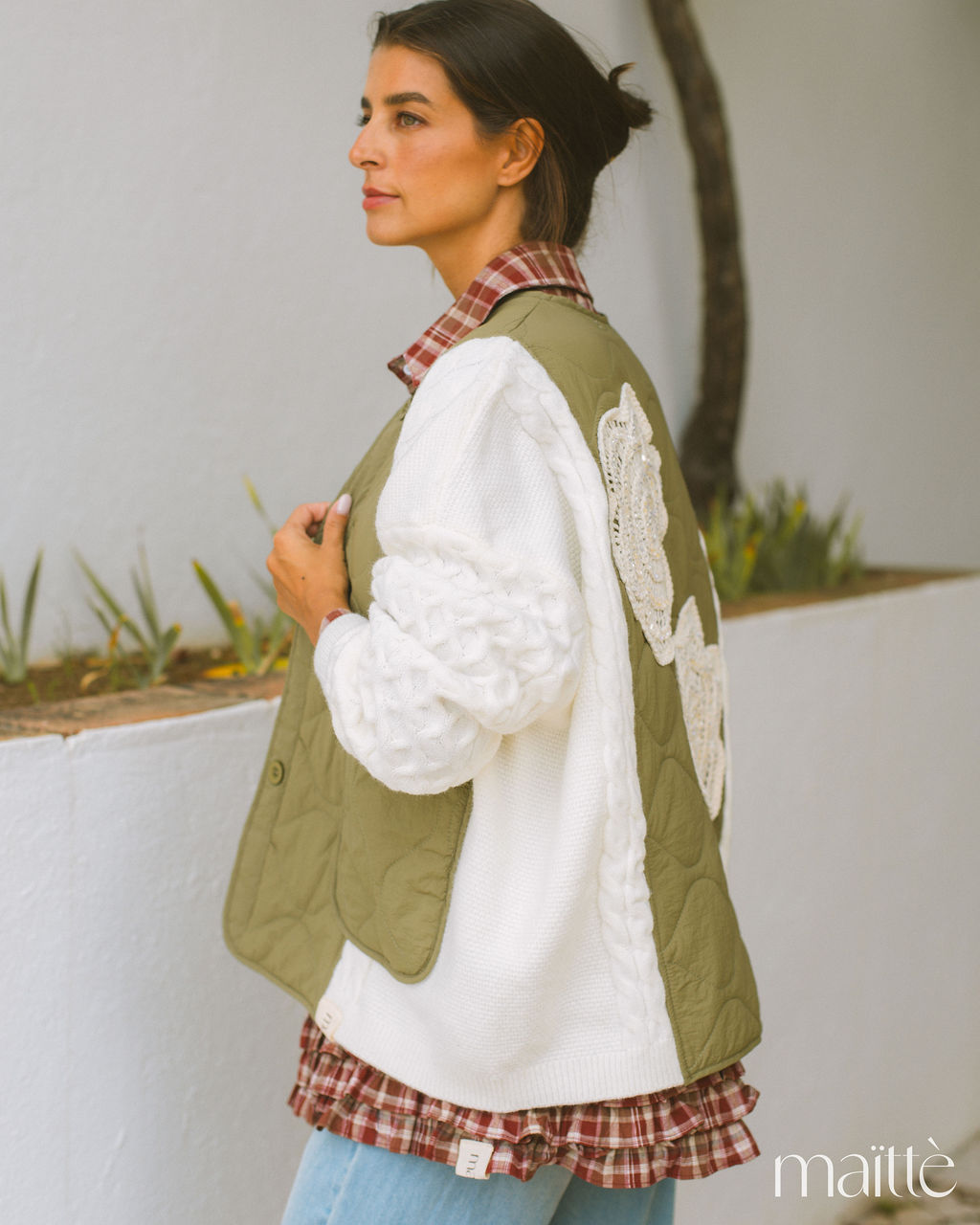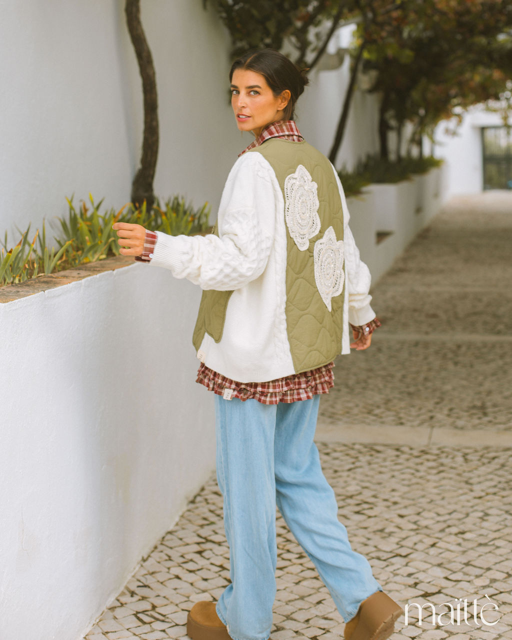 Casaco original numa mistura de malha e Kispo com ajuste solto.