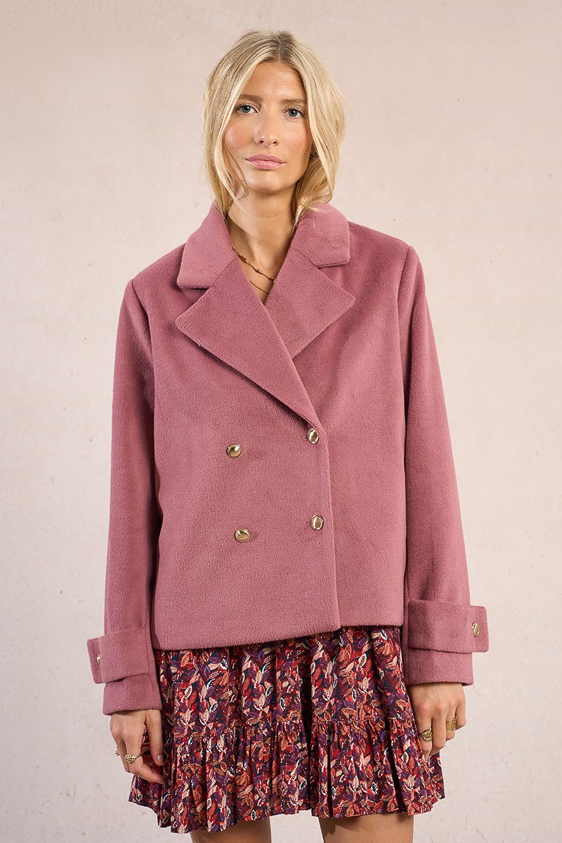 Modelo com ajuste largo com gola de lapela clássica e botões dourados à frente com efeito trespasse.
