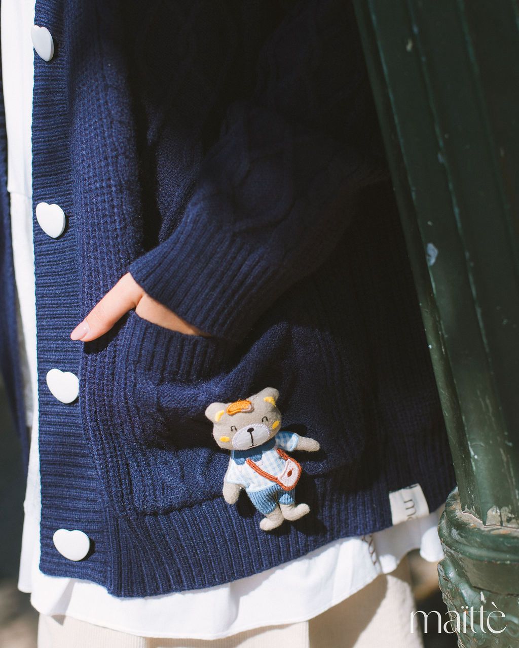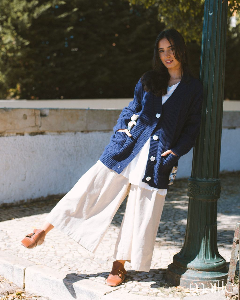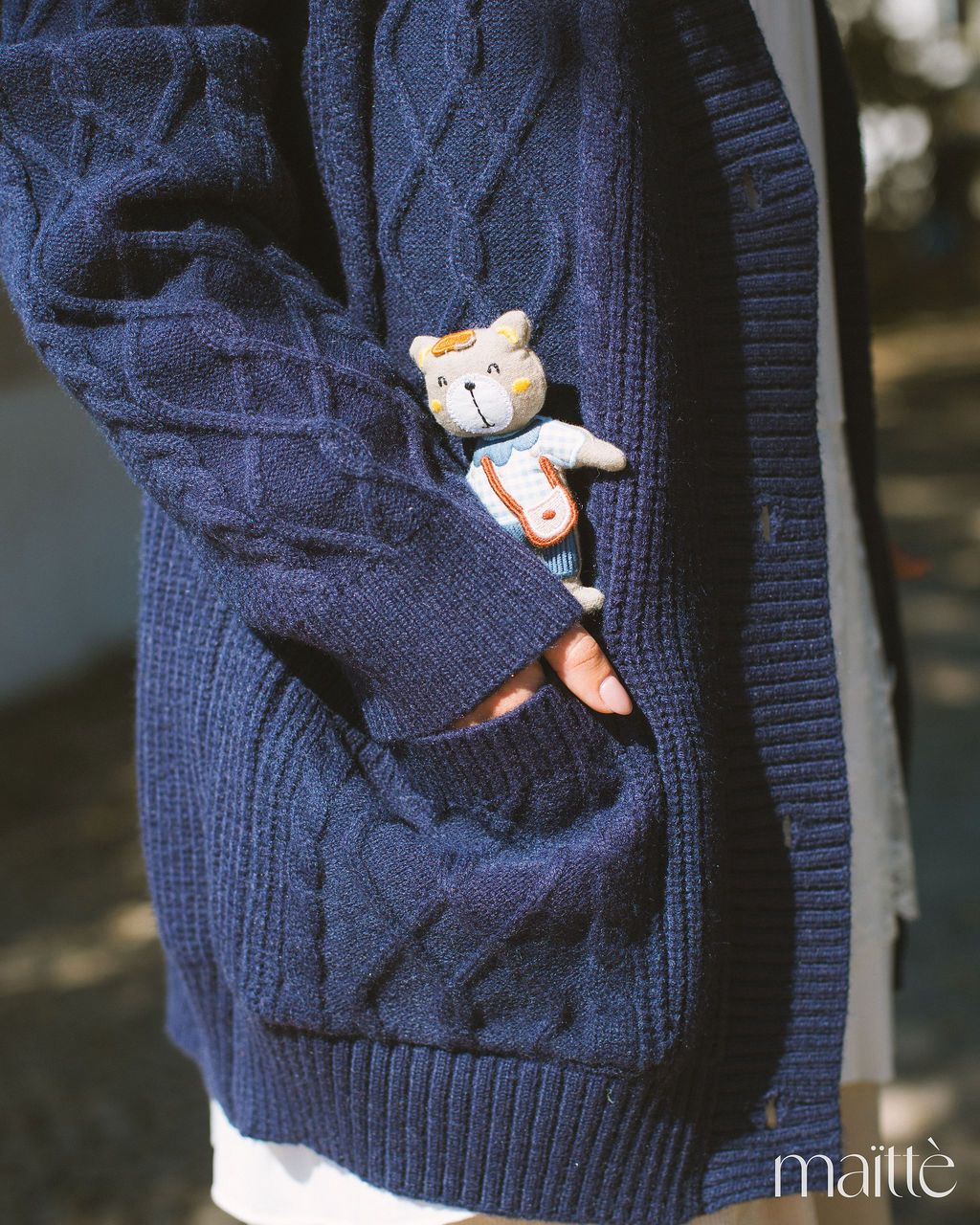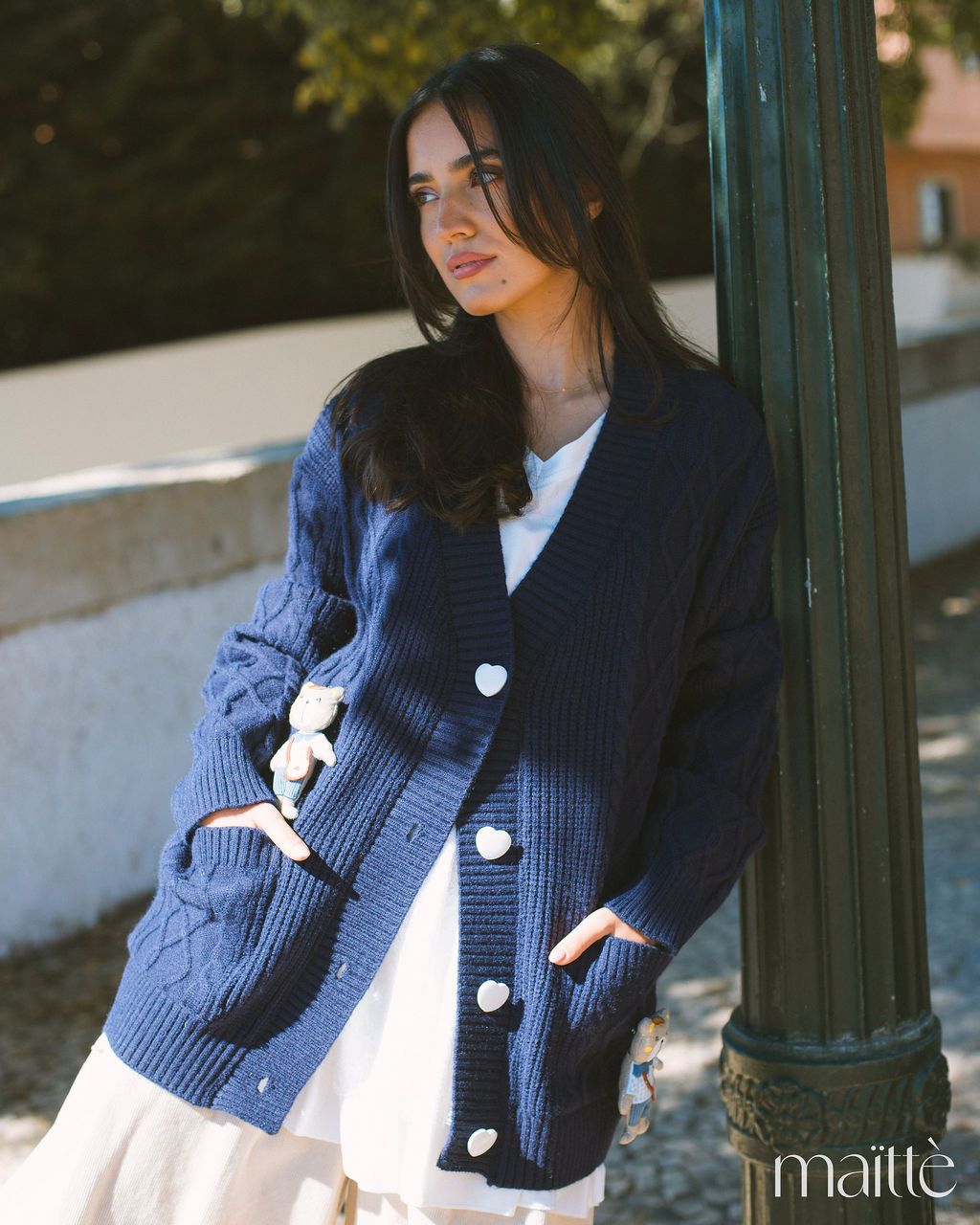 Casaco de malha composta e quentinha, trabalhada com efeito de torcidos.Decote em V com botões em formato coração. Ajuste solto com corte recto e terminação canelada.