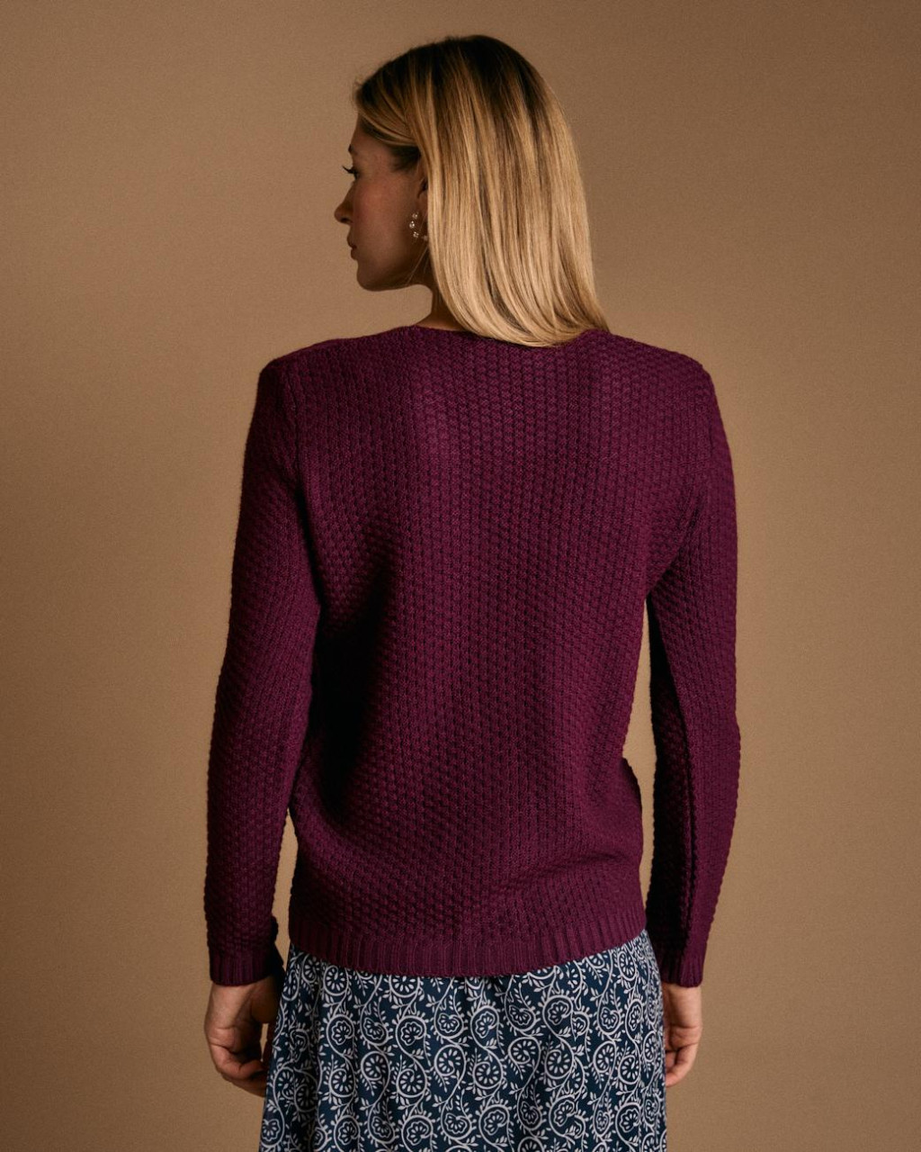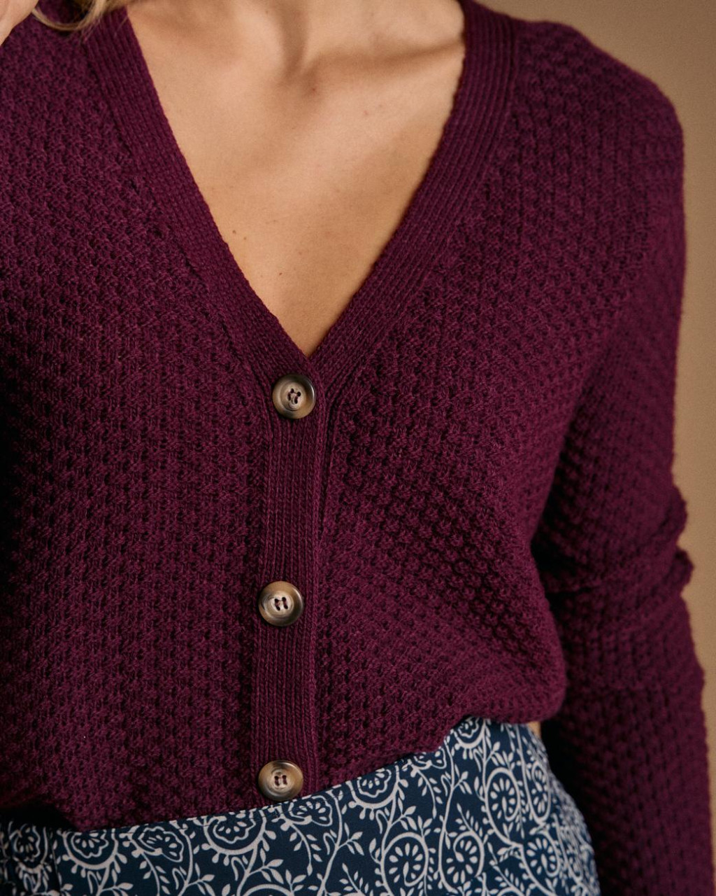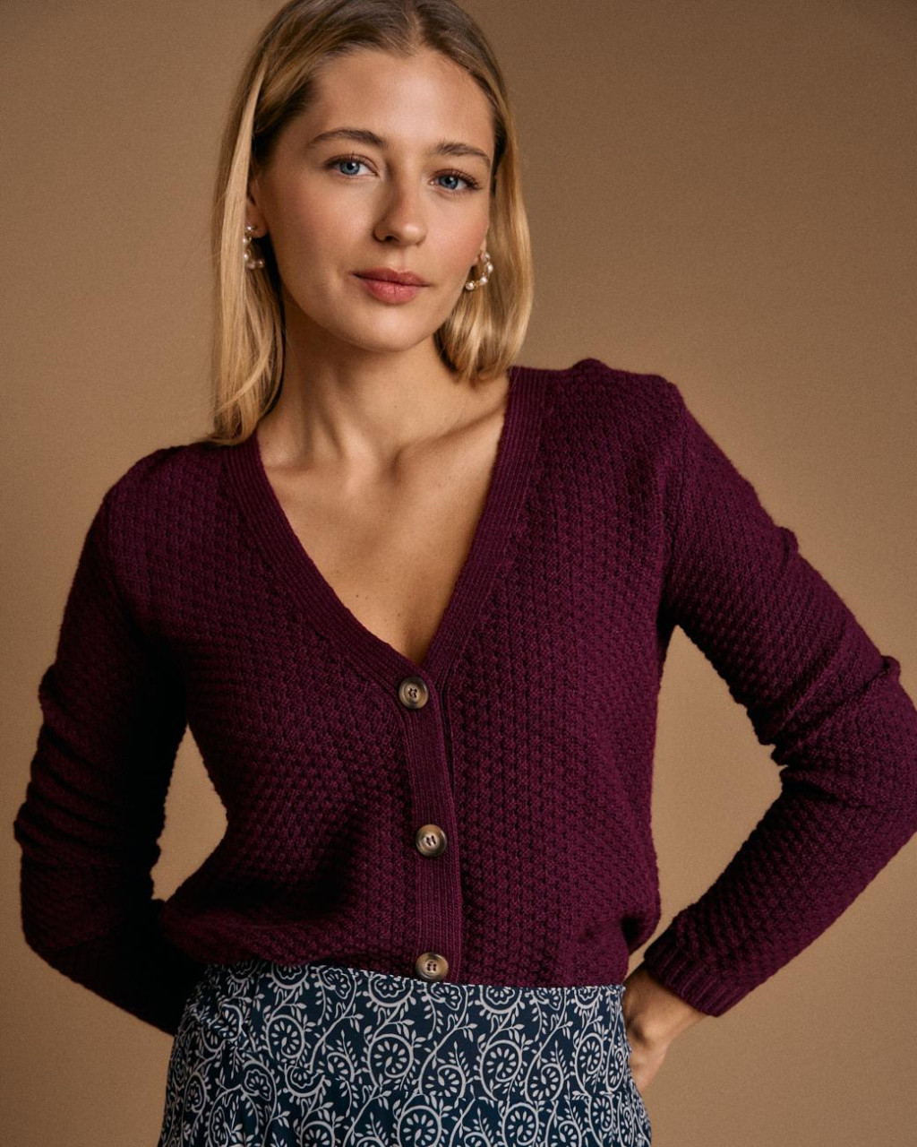 Casaco de malha trabalhado com corte tradicional (cardigan) com decote em V e botões à frente.