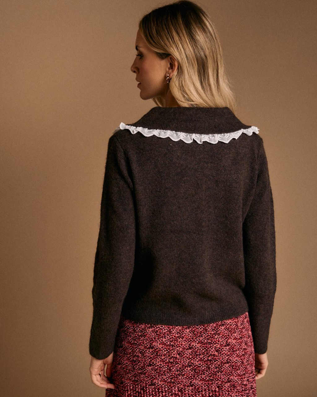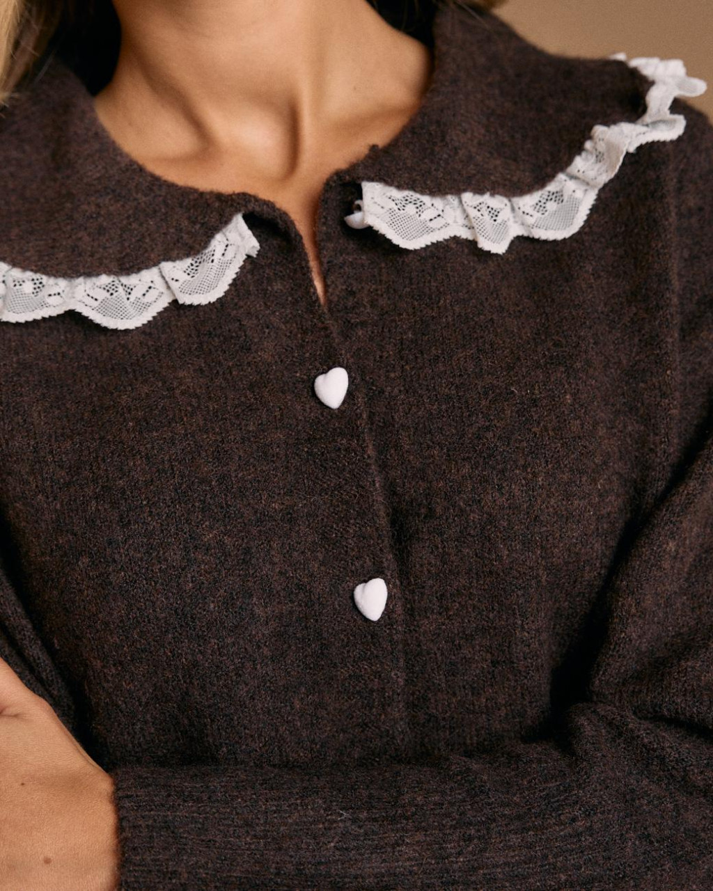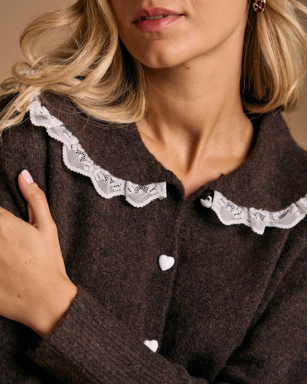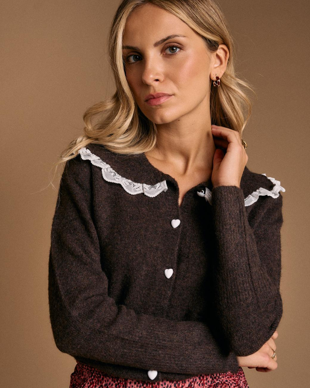 Casaco de malha castanho, numa malha muito quentinha e macia (com elasticidade) com ajuste regular. Modelo inclusivo com botões em formato coração à frente.