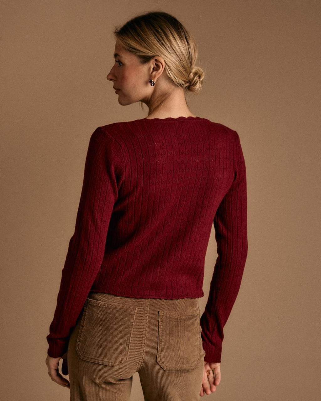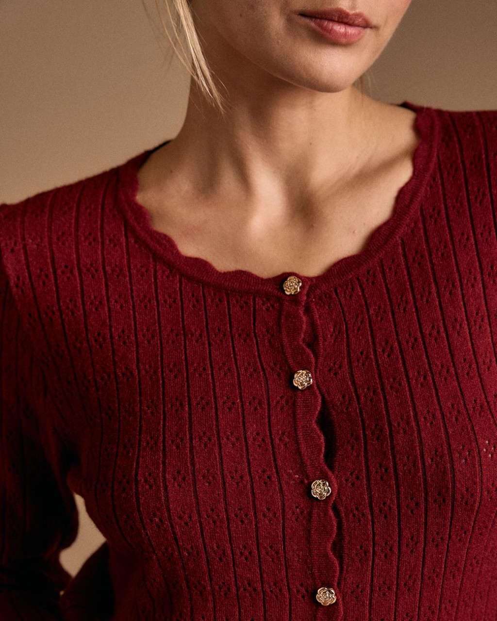 Casaco de malha trabalhada com ajuste cintado, numa malha macia de toque suave e sedoso.