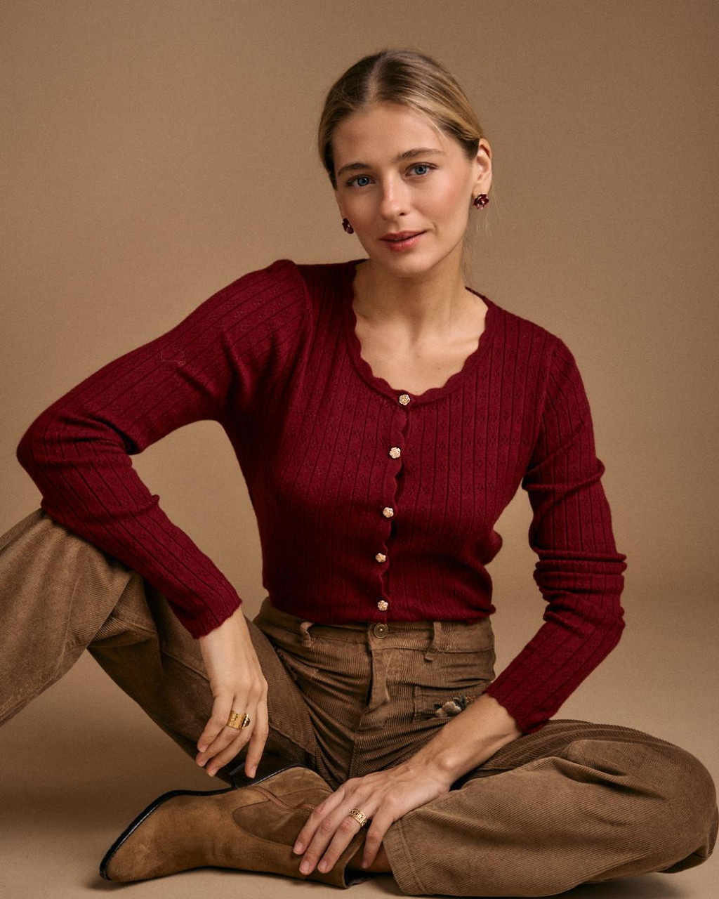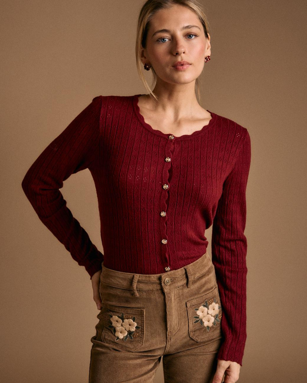 Decote redondo com efeito ondulado. Botões dourados à frente.