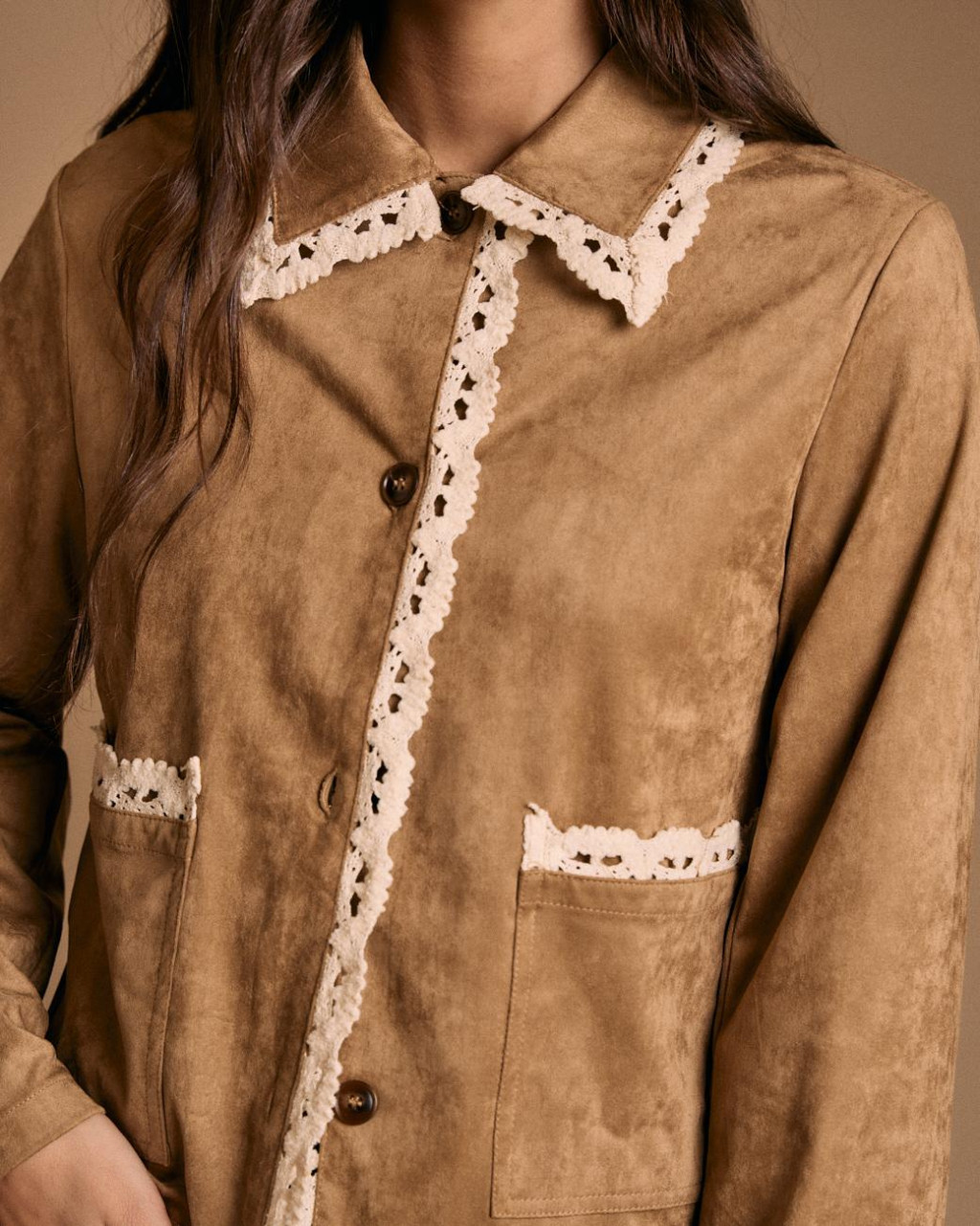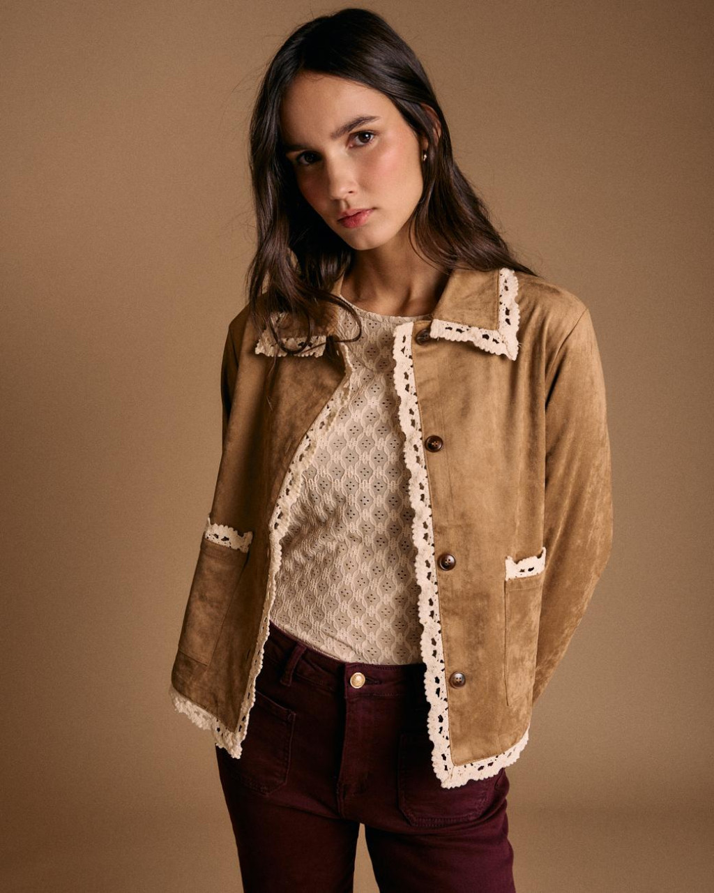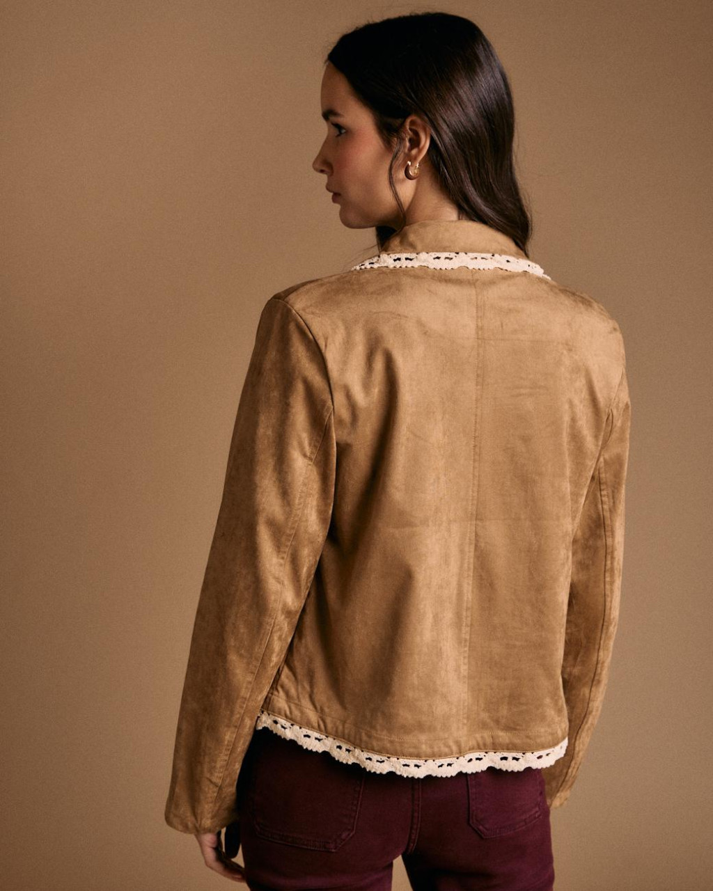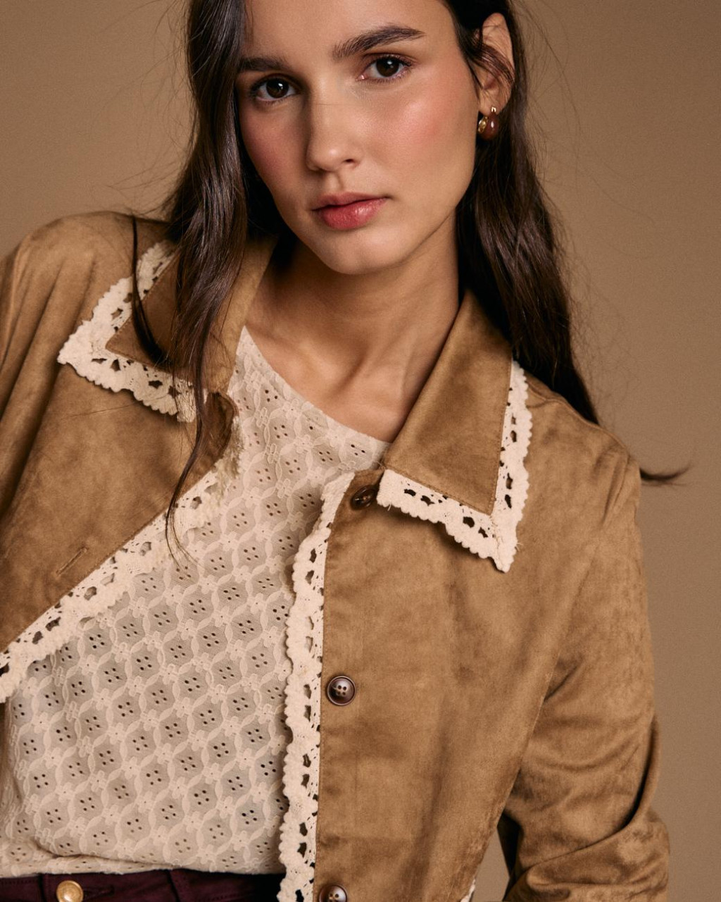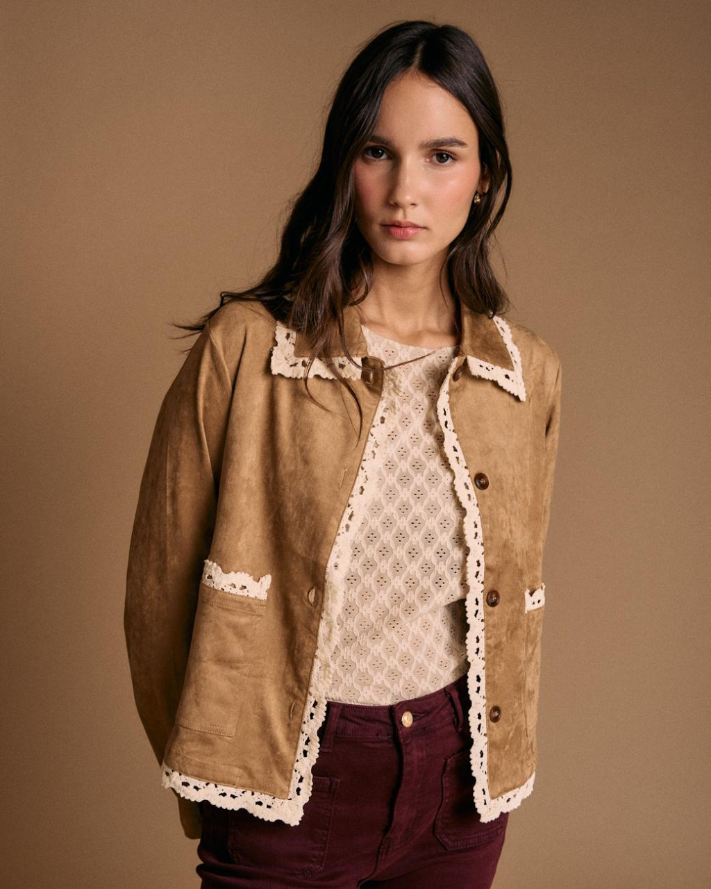 Casaco curto em suede/camurça (estilo pele de pêssego aveludada) em camel com ornamentação de renda.