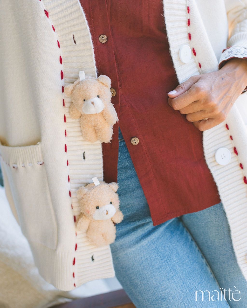 Decote em V com fecho de botões e pregadeiras (amovivéis) de ursinhos de pelúcia.