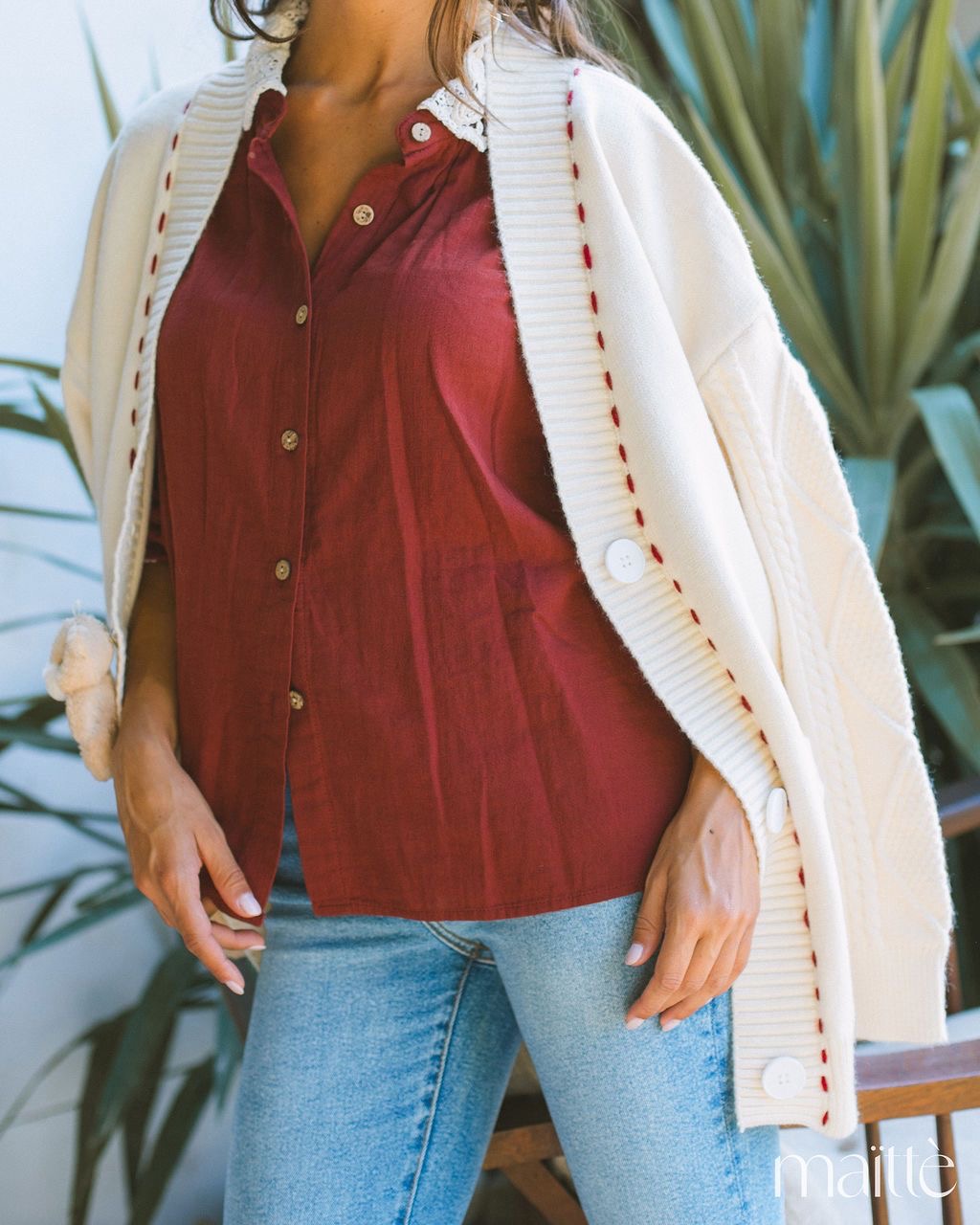 Bolsos funcionais. Ornamentação com linha bordeaux em contraste.